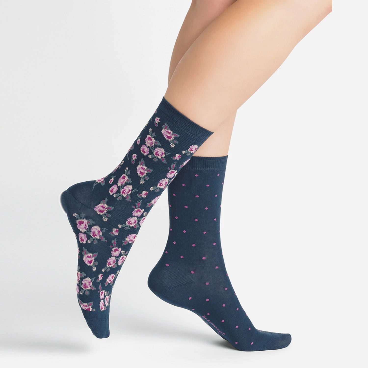 Certaines préfèrent les fleurs. Les autres, les pois. Ces chaussettes, disponibles par lot de 2, invitent roses et micro-pois violine, sur fond bleu marine, pour finaliser les looks preppy, romantiques ou rétro.
