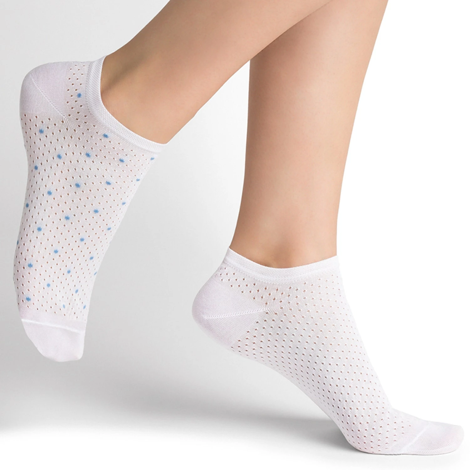 Ces chaussettes courtes pour femme s’inspirent des tendances du prêt-à-porter. Confectionnées en fils d’Ecosse en coton labellisé Oeko Tex Standard 100, elles se démarquent par un effet ajouré uni blanc ou doublé d’un imprimé plumetis bleu sur fond blanc. Un modèle pensé pour apporter une touche de style et d’originalité aux tenues.