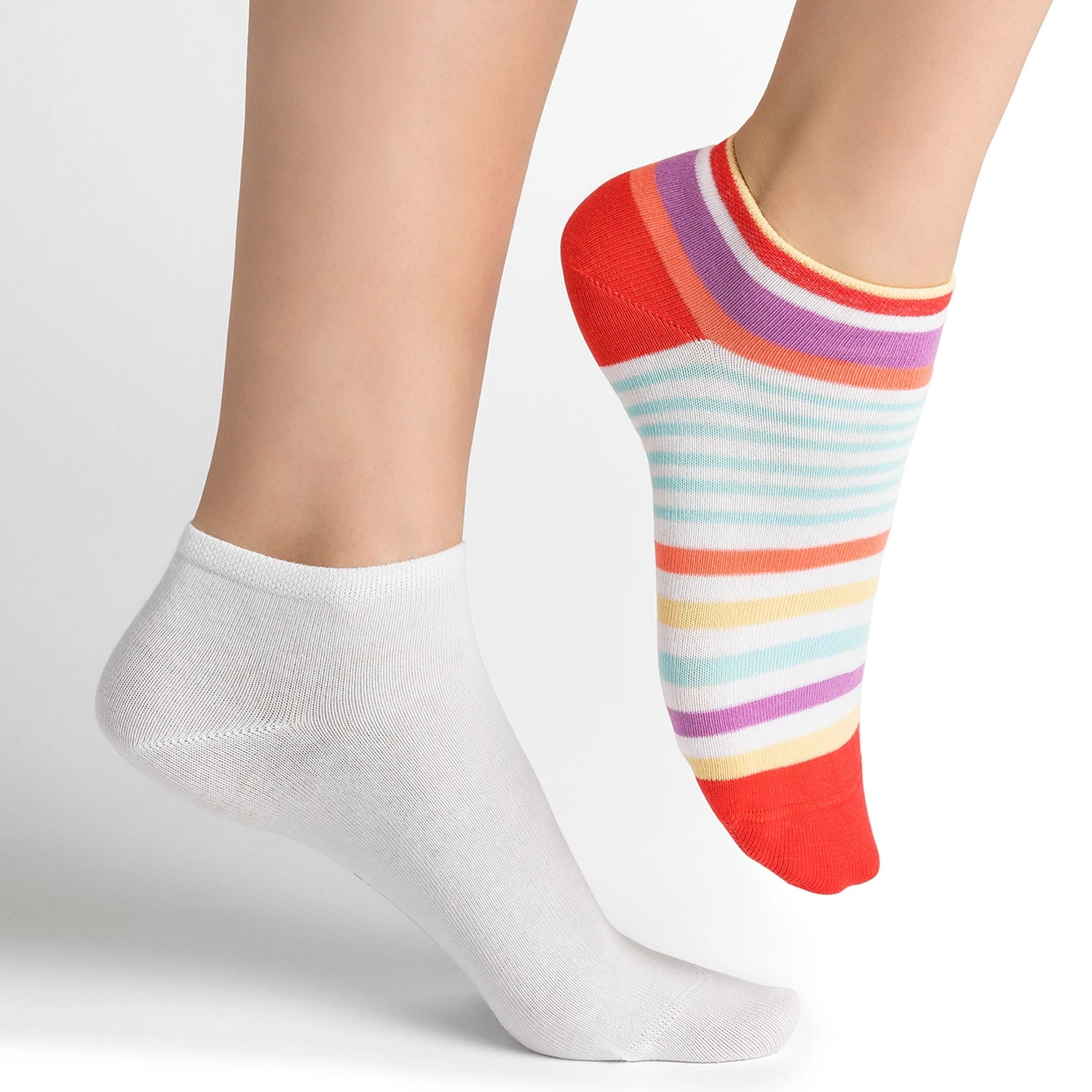 Ces chaussettes courtes pour femme s’inspirent des tendances du prêt-à-porter. Confectionnées en coton blanc, ultra fin et labellisé Oeko Tex Standard 100, une des paires reste unie, tandis que l’autre se démarque par des rayures aux couleurs rouge, violine, corail, turquoise et jaune, pour apporter une touche de style et d’originalité aux tenues