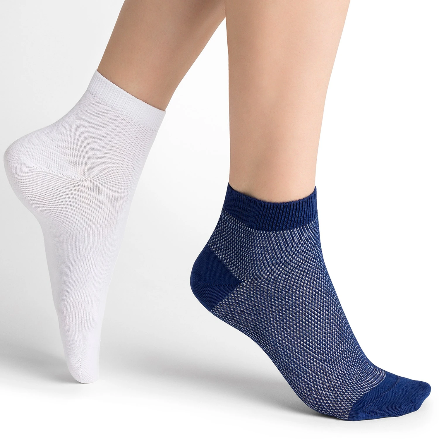Ces chaussettes courtes pour femme s’inspirent des tendances du prêt-à-porter. Confectionnées en coton, ultra fin et labellisé Oeko Tex Standard 100, une des paires reste unie, tandis que l’autre se démarque par un coloris bleu nuit avec fils pailletés, pour apporter une touche de style et d’originalité aux tenues