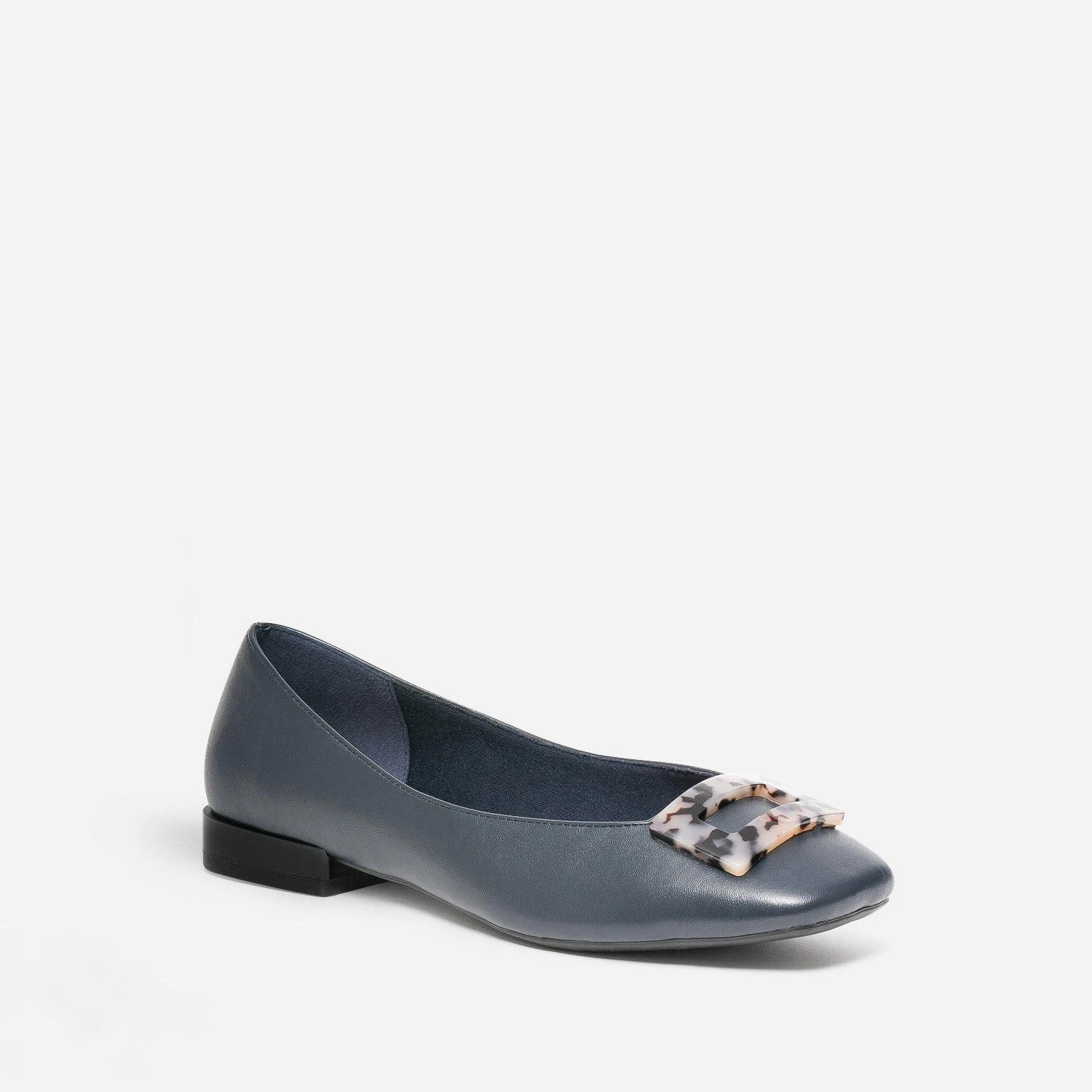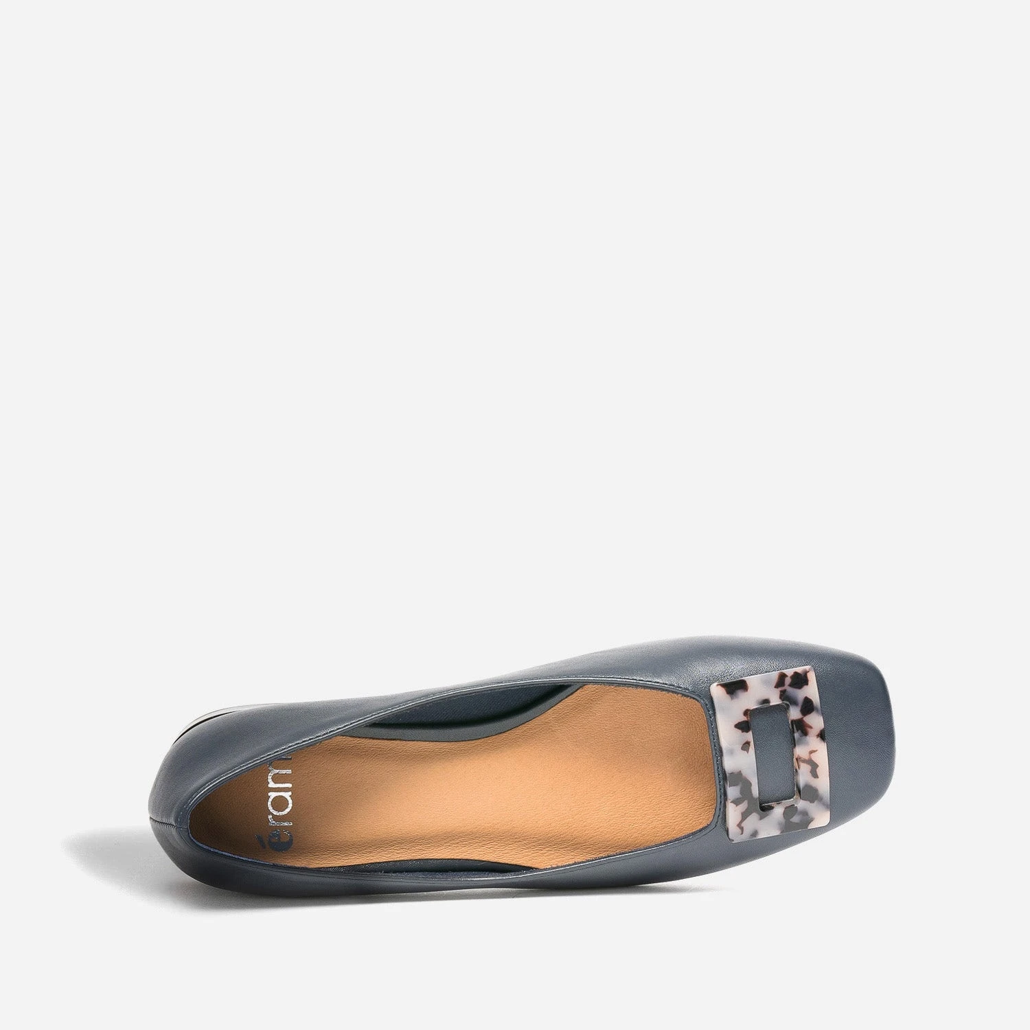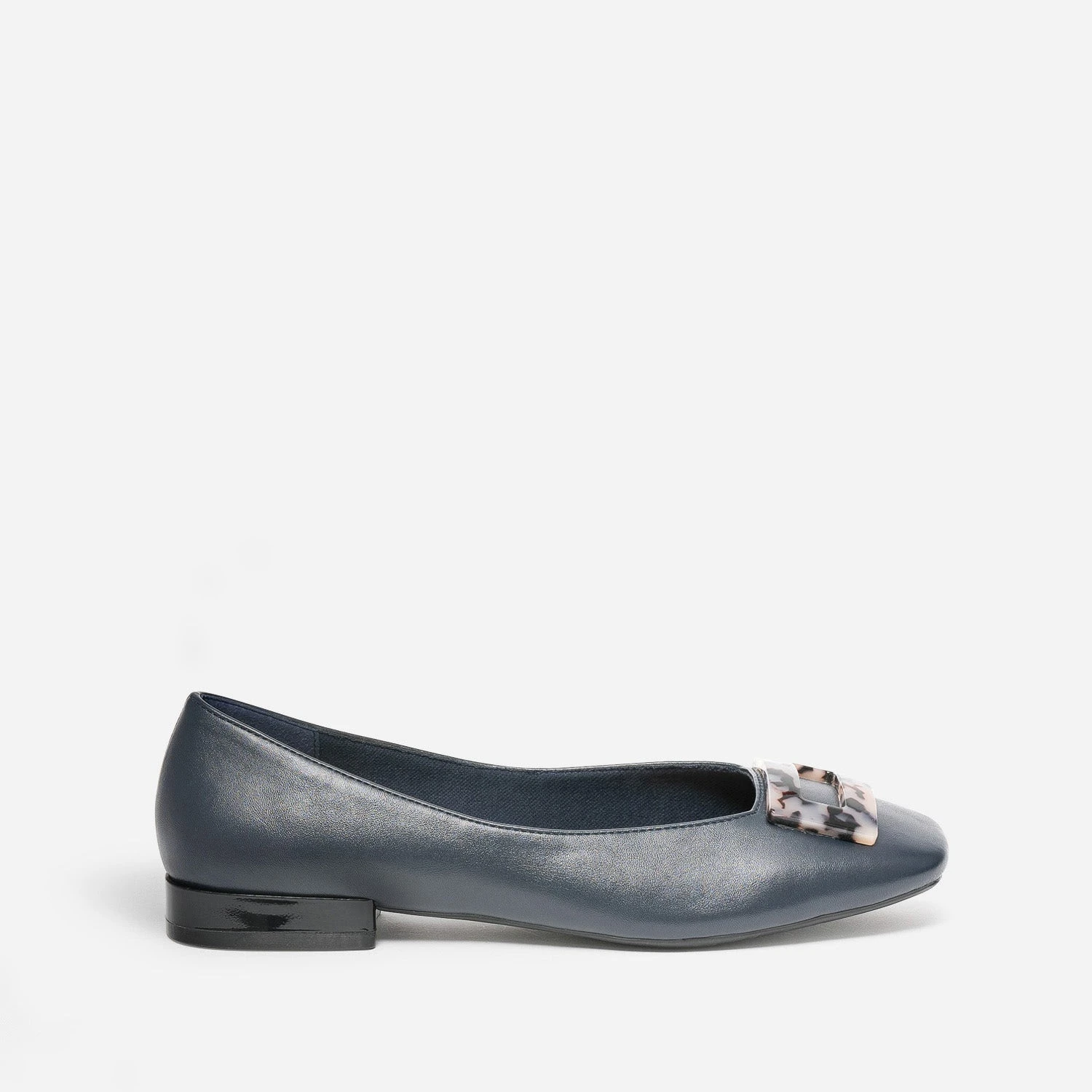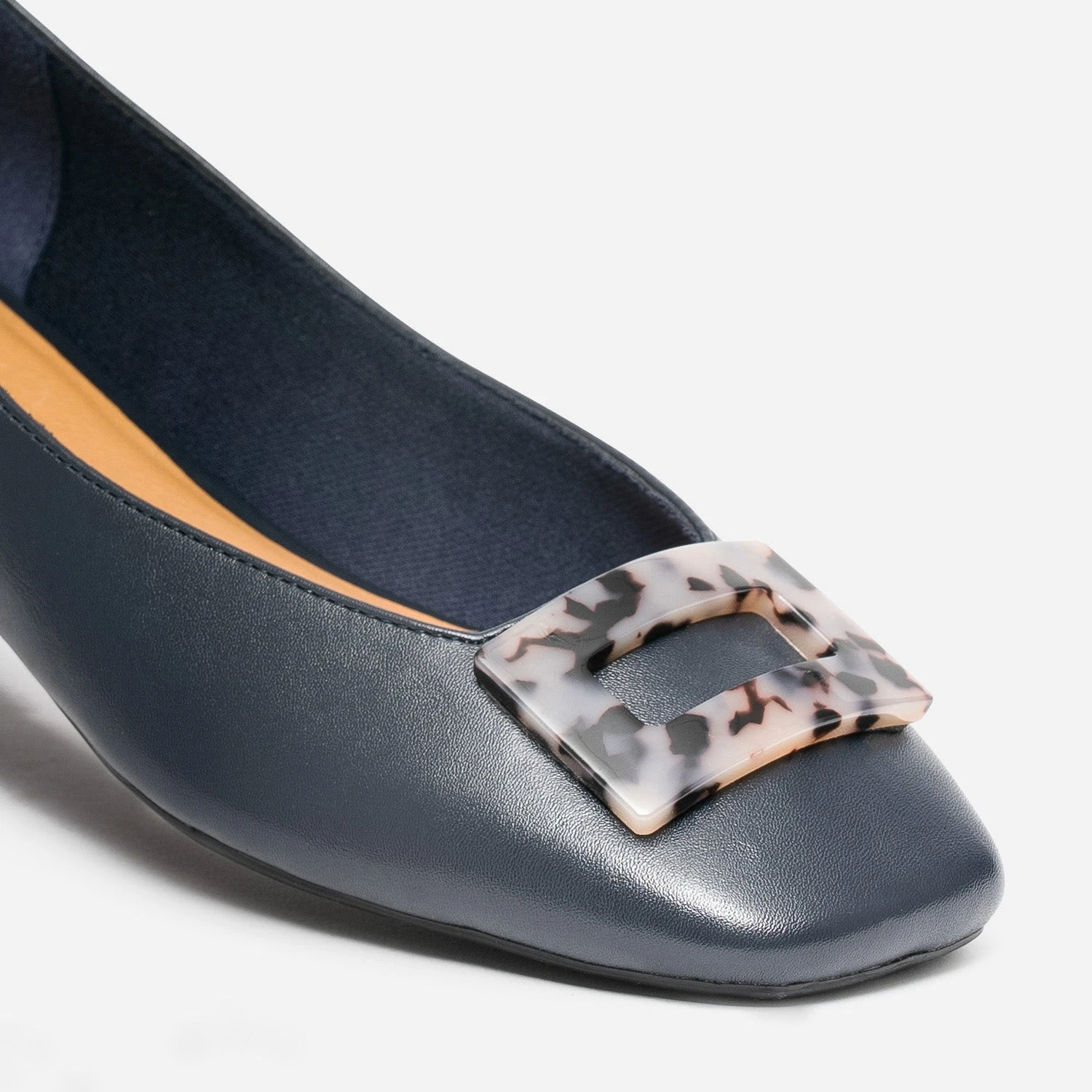 C’est confirmé : la ballerine fait son retour cette saison. En matière synthétique lisse bleu marine, elle est montée sur un petit talon carré verni, qui fait écho au bout carré et au décor façon écailles posé sur le dessus du pied. Un esprit rétro, à décaler avec une chemise blanche, un jean mom cropped gris et des boucles d’oreilles massives en métal doré.