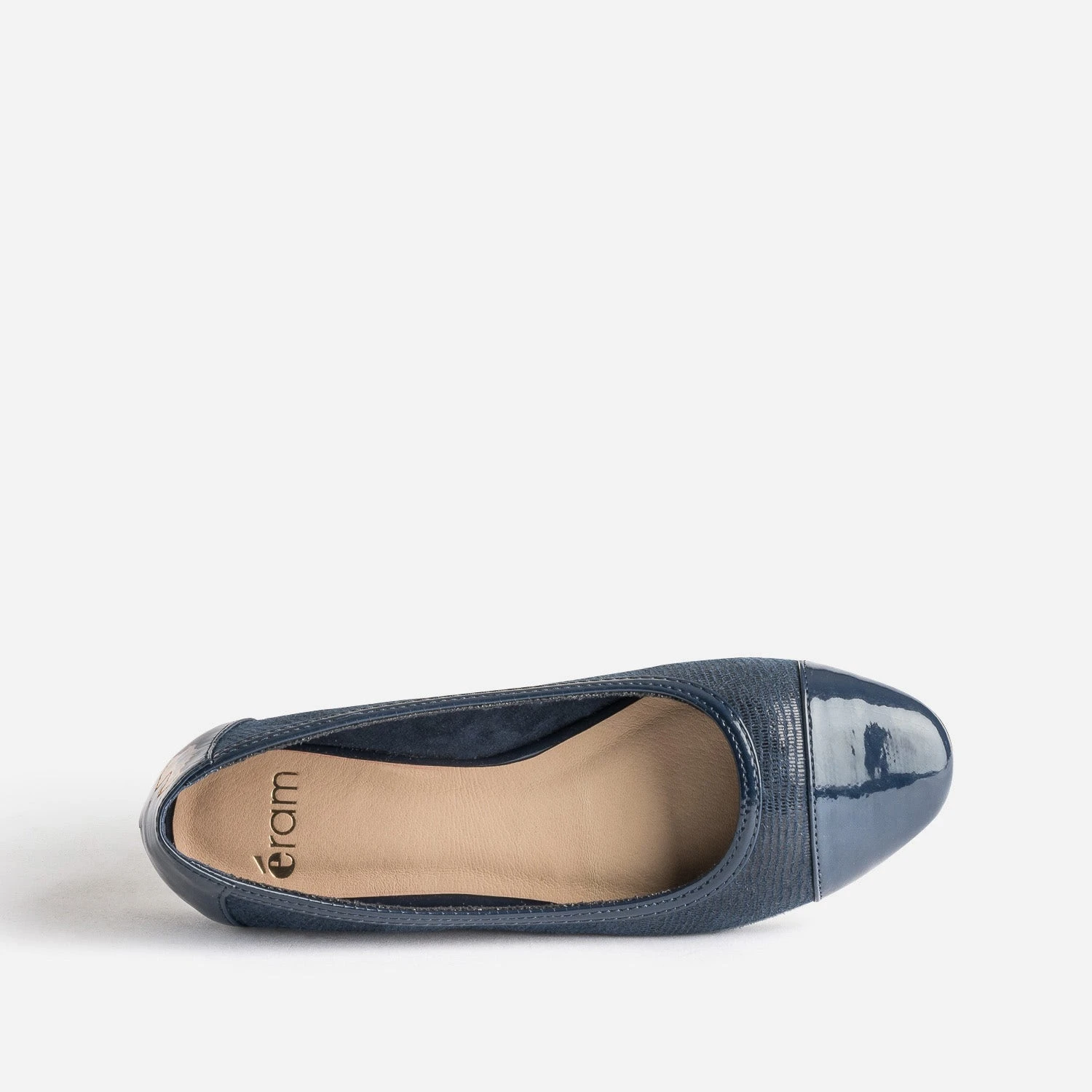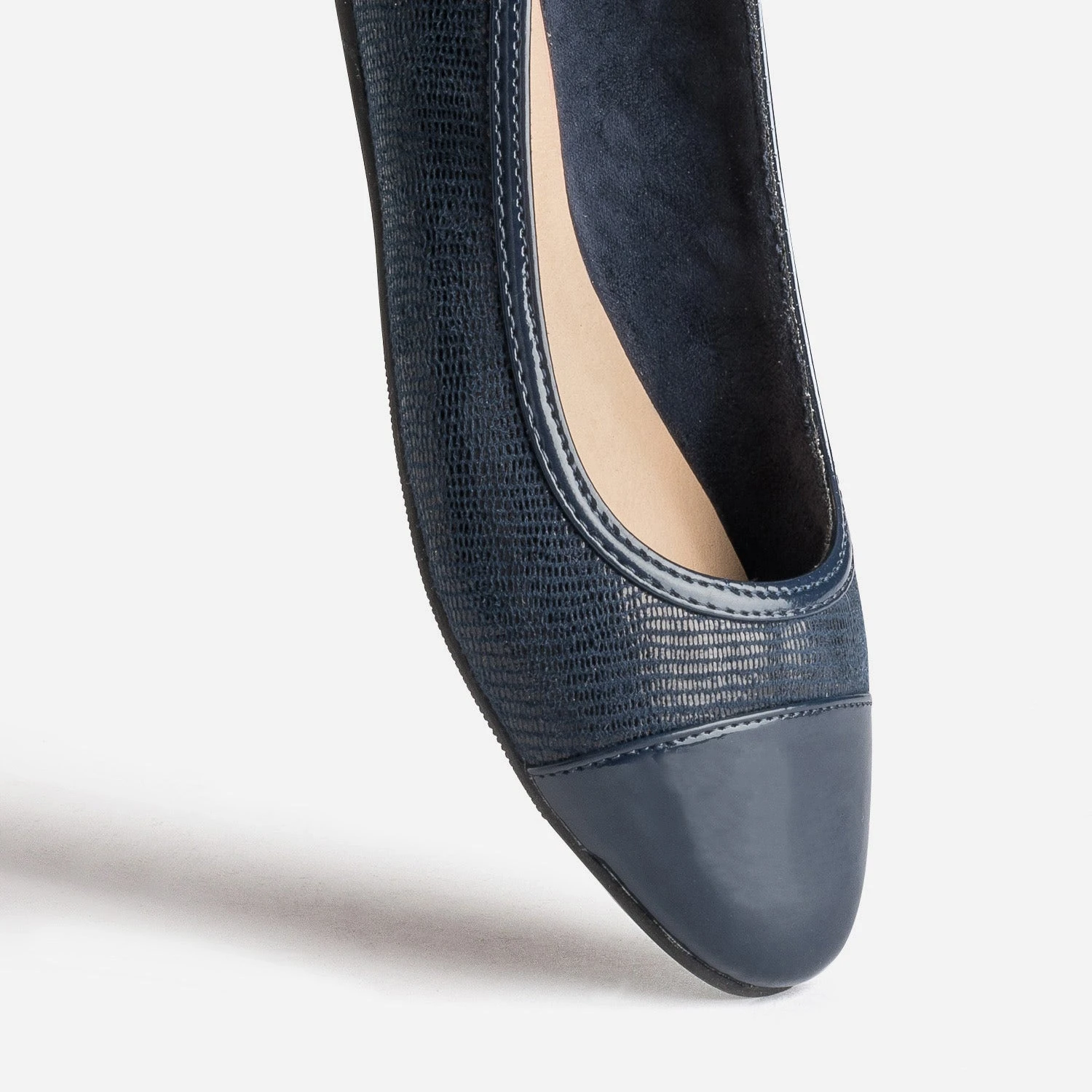 Pourquoi attendre une occasion pour briller ? Cette ballerine femme se porte au quotidien, avec tout ! En matière synthétique bleu marine, elle affiche, sur le bout et le contrefort, une finition vernie, et sur la tige, une finition effet python en ton sur ton. Un modèle plat, qui a déjà fait ses preuves avec une robe-chemise ou un slim.