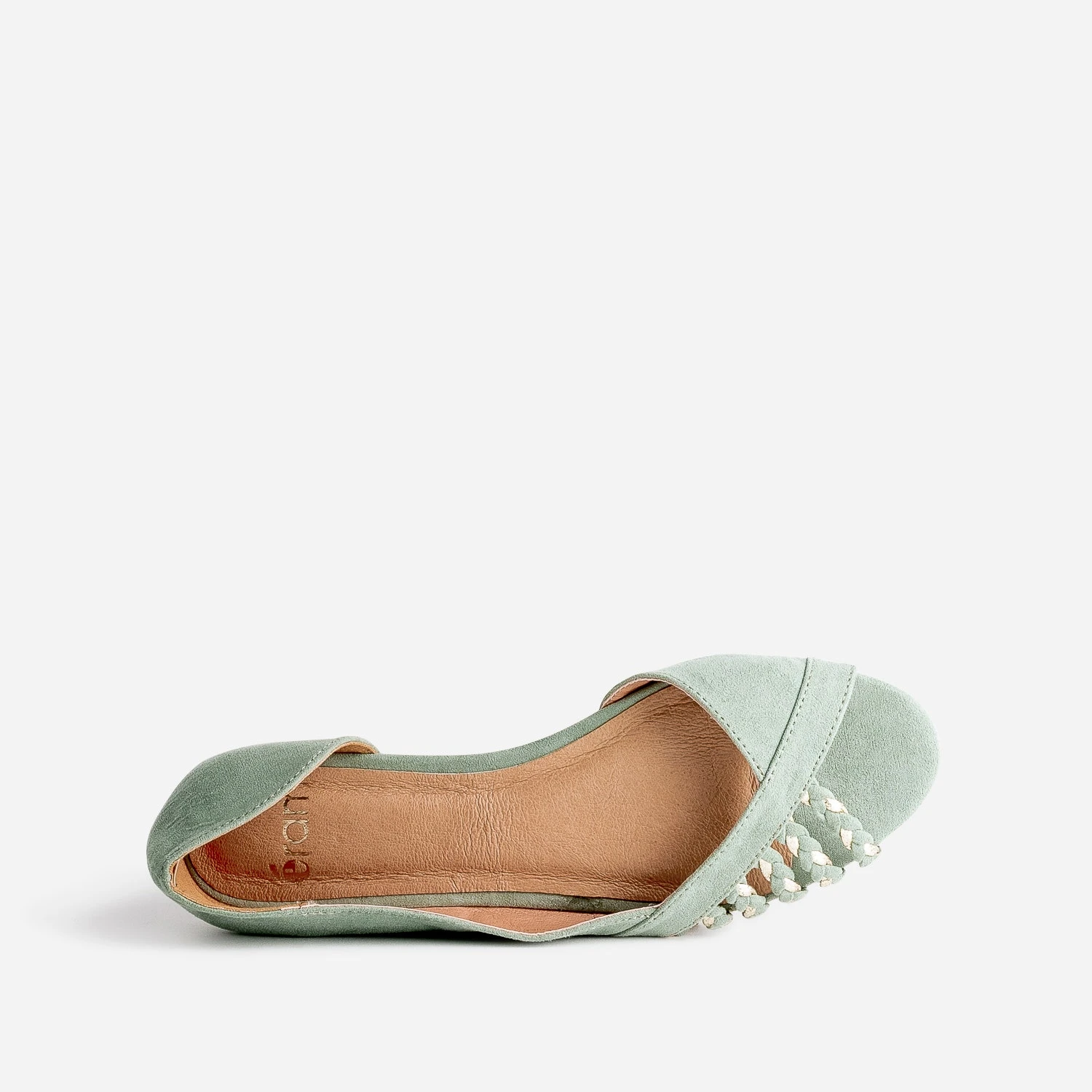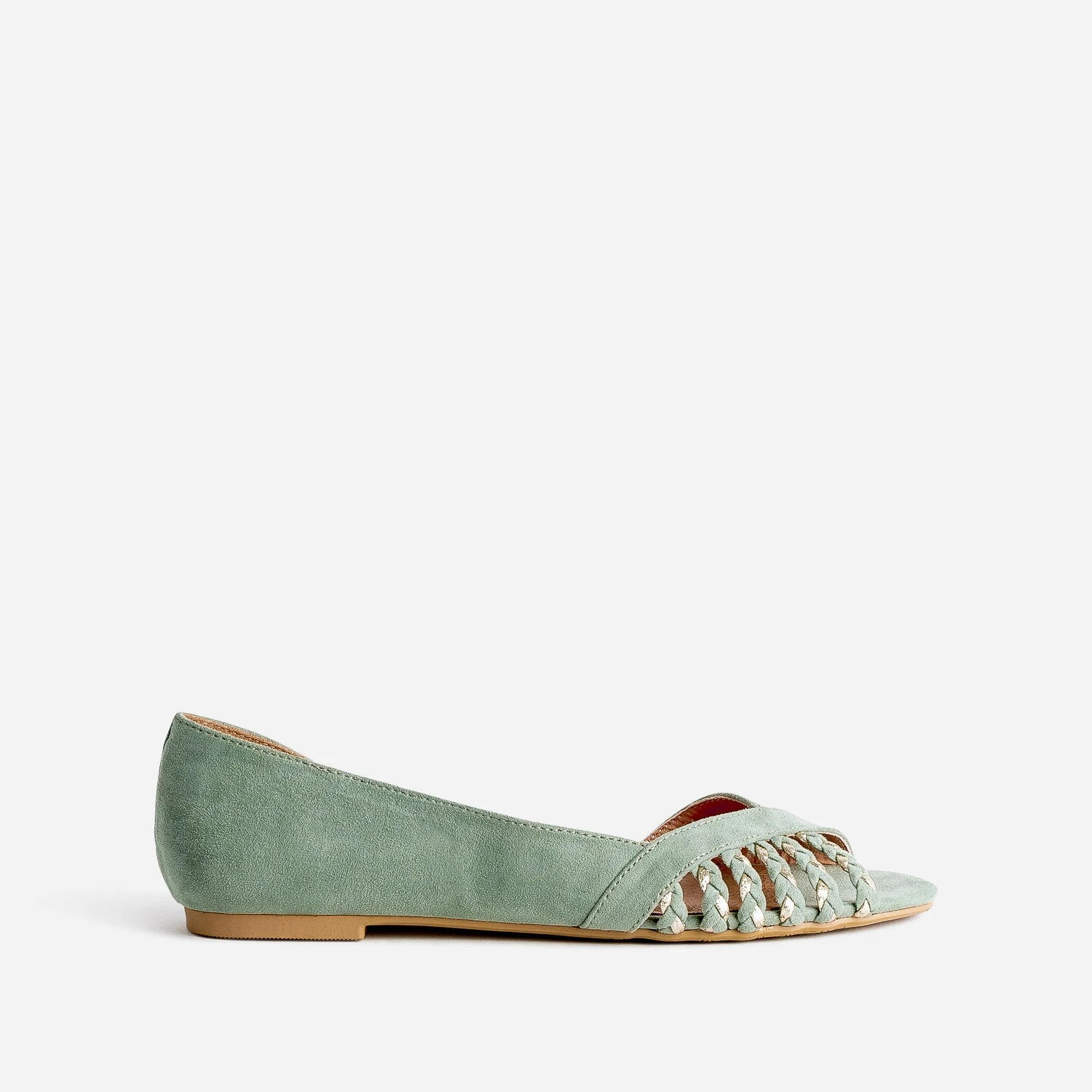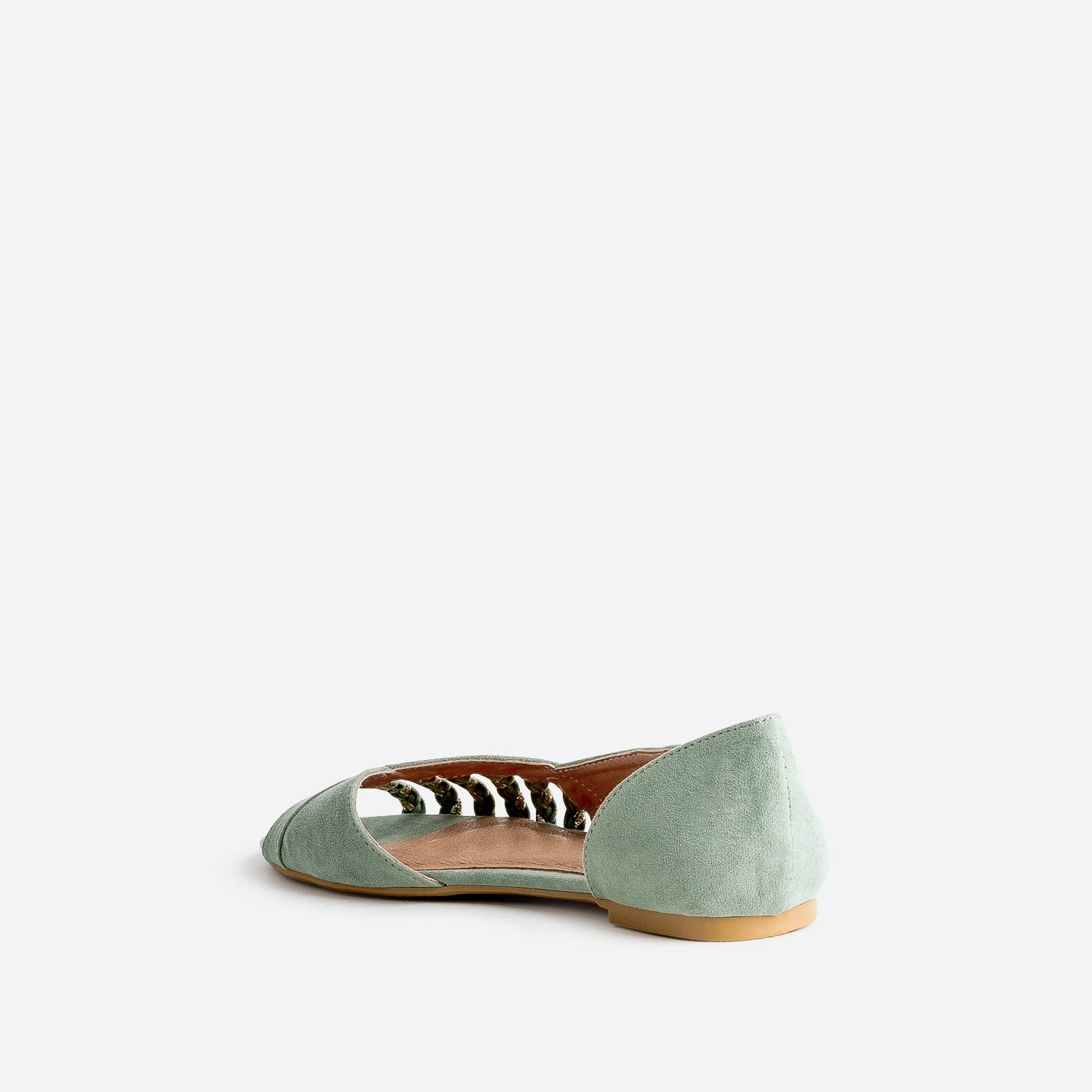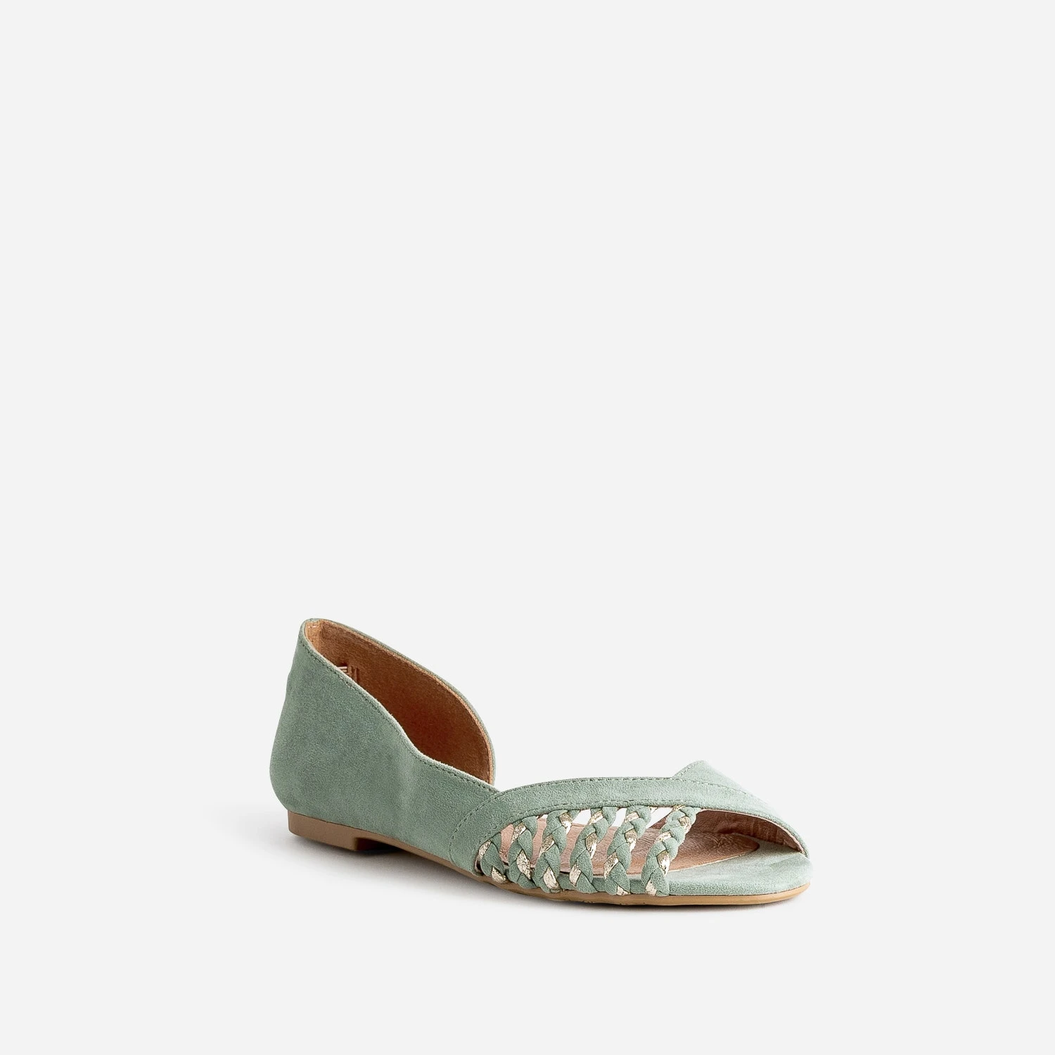 Le retour de la ballerine ? Avouons-le. On s’y attendait un peu. Sublime dans une matière synthétique suédée vert sauge, elle est rehaussée de touches dorées sur brides tressées, et présente deux découpes, une sur le bout, l’autre, à l’intérieur du pied. Plate, elle est parfaite avec une robe-chemise pastel, ou bien avec une blouse fluide à lavallière et un pantalon cigarette beige.