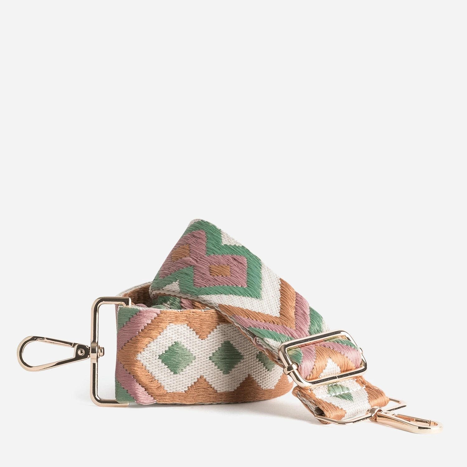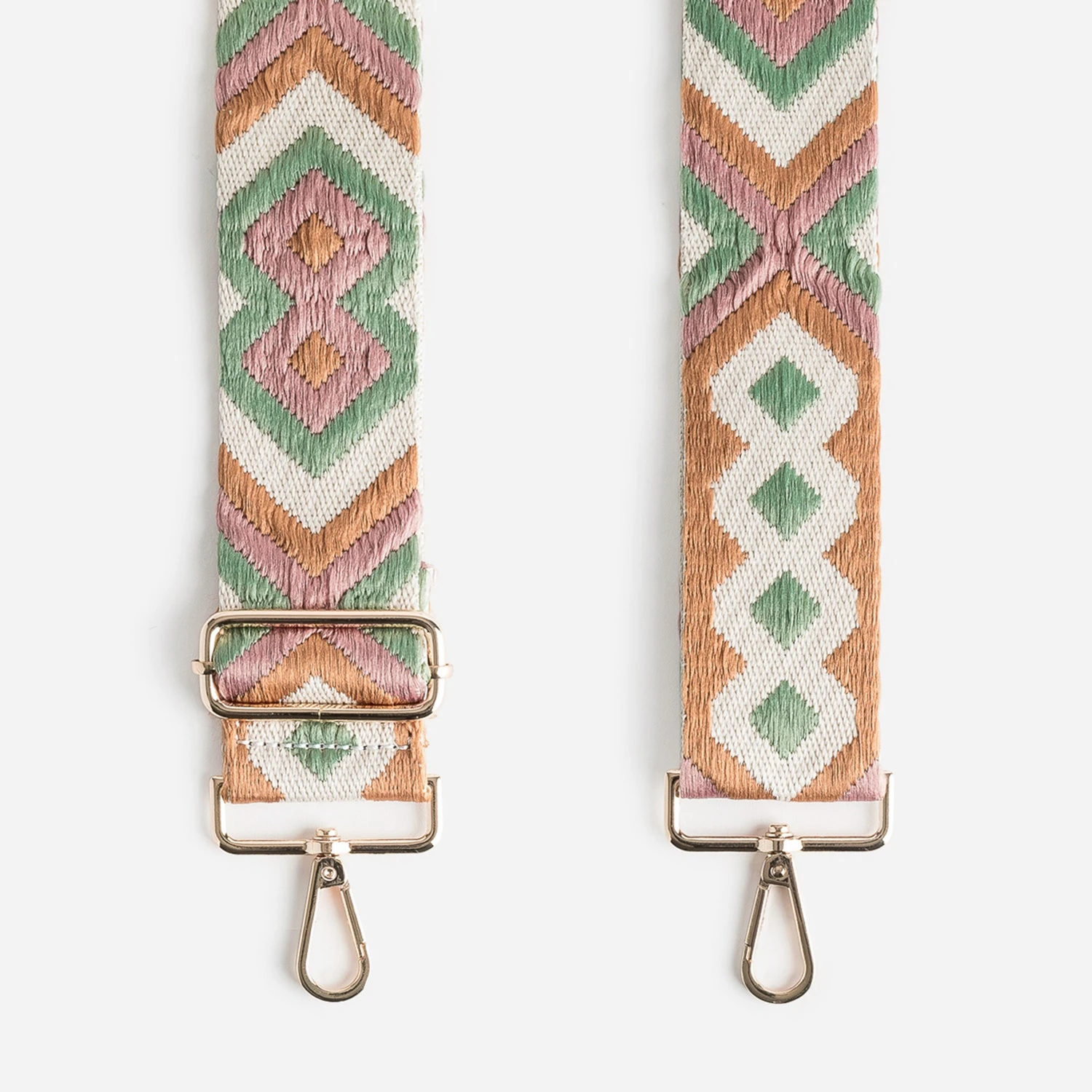 En textile beige, camel, vieux rose et vert sauge, cette bandoulière présente un tissage à motif ethnique. Amovible par mousquetons en métal doré, réglable, elle se place sur un sac à main, pour un porté sur l’épaule ou croisé.