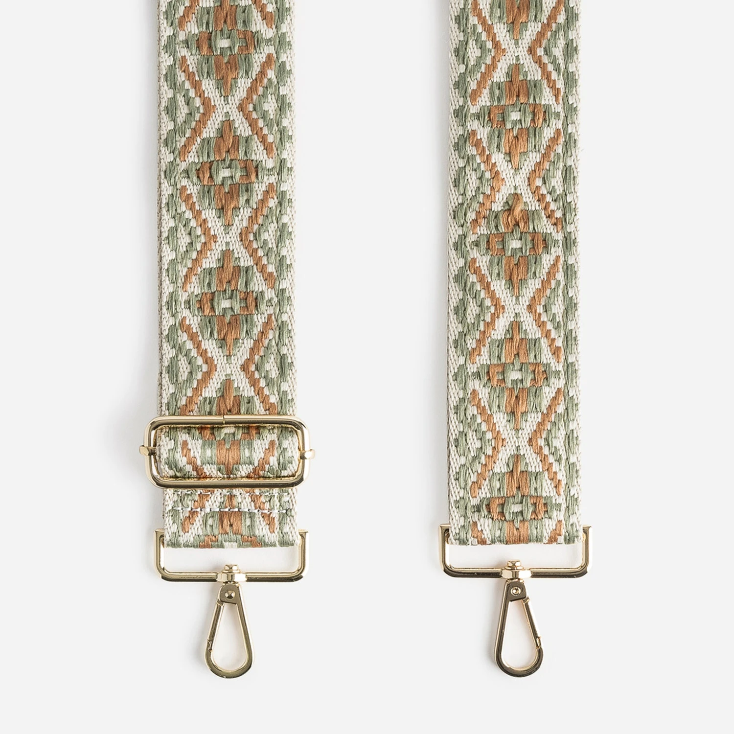 En textile beige, camel et vert sauge, cette bandoulière présente un tissage à motif ethnique. Amovible par mousquetons en métal doré, réglable, elle se place sur un sac à main, pour un porté sur l’épaule ou croisé.