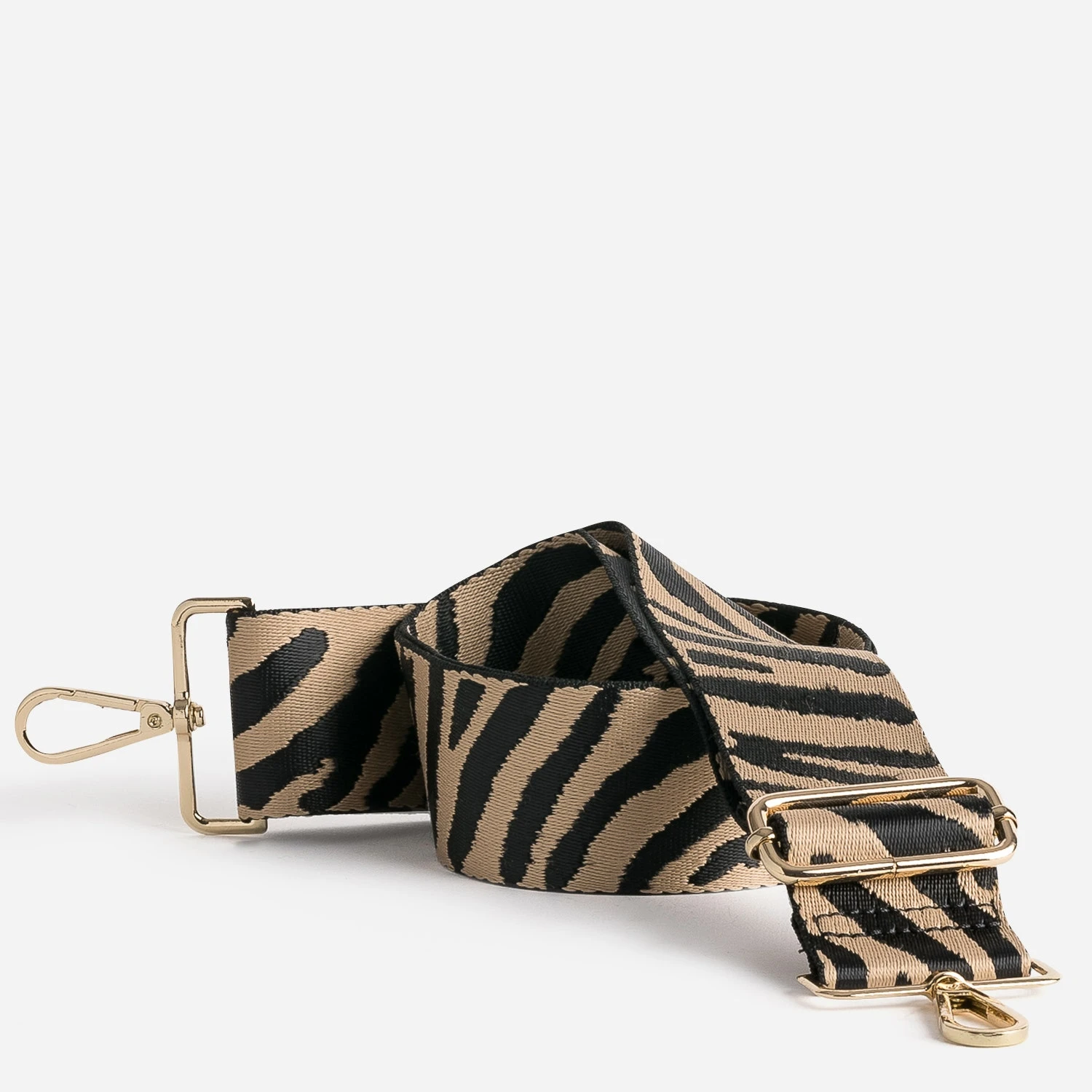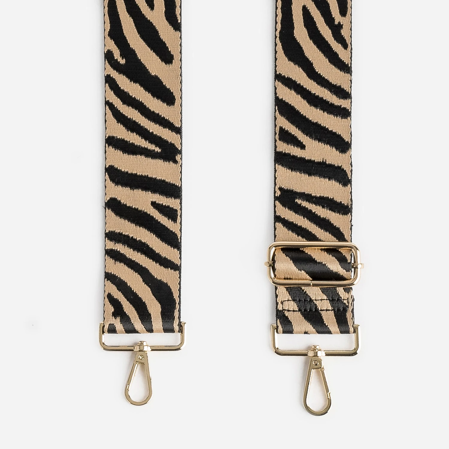 En textile noir et camel, cette large bandoulière présente un tissage à motif zèbre. Amovible par mousquetons en métal doré, réglable, elle se place sur un sac à main, pour un porté sur l’épaule ou croisé.