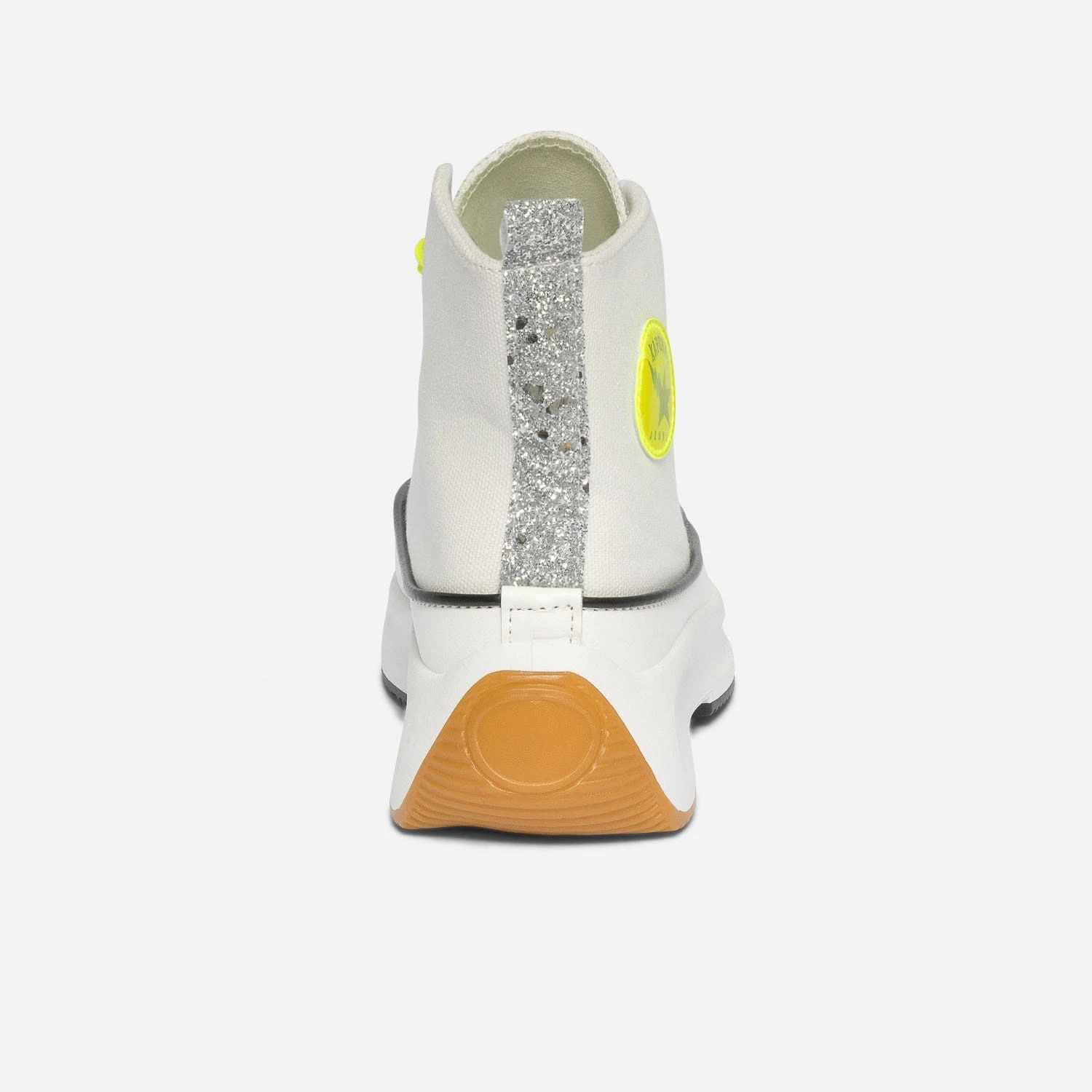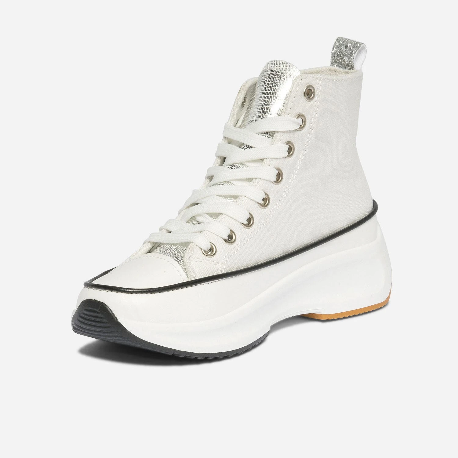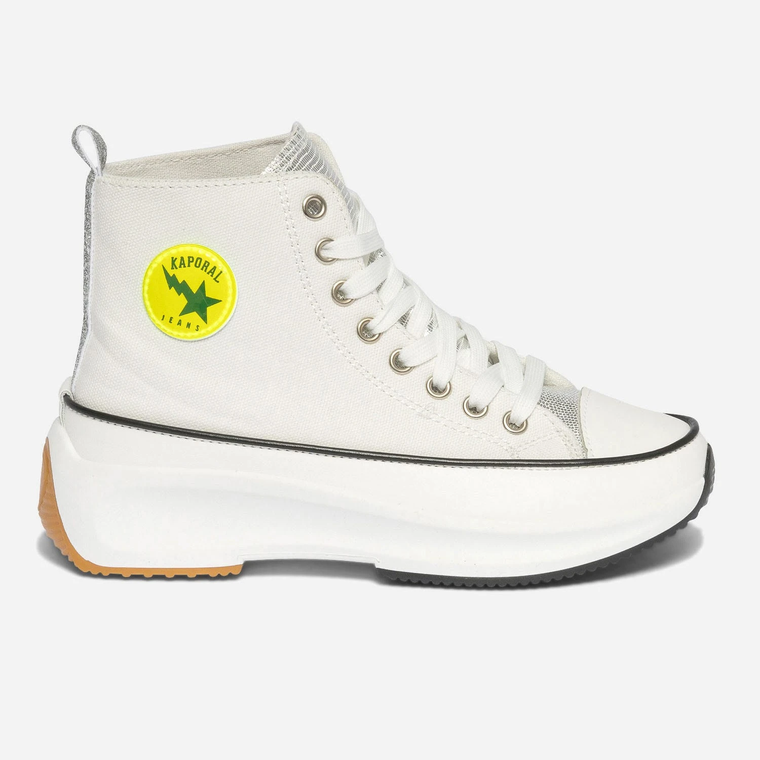 Entrez dans la saison estivale avec cette basket montante pour femme. En toile blanche, elle affirme son style mode par une languette en matière synthétique argenté et un galon pailleté sur le contrefort. Elle est livrée avec 2 paires de lacets plats, 1 blanc et 1 jaune fluo, en écho au badge rond sur le côté. Montée sur une semelle à plateforme, elle permet de prendre de la hauteur sans effort. Un modèle à porter avec une tenue colorée à l’esprit décontracté : crop top, pantalon large et casquette.