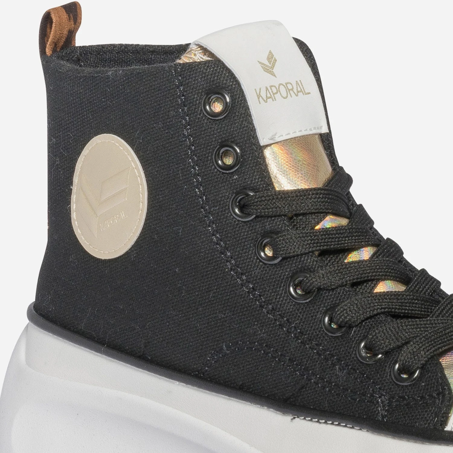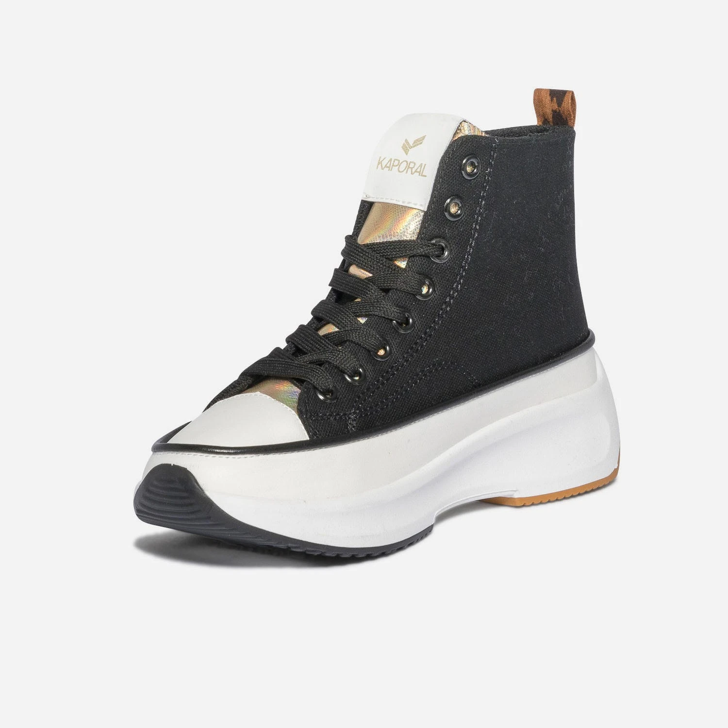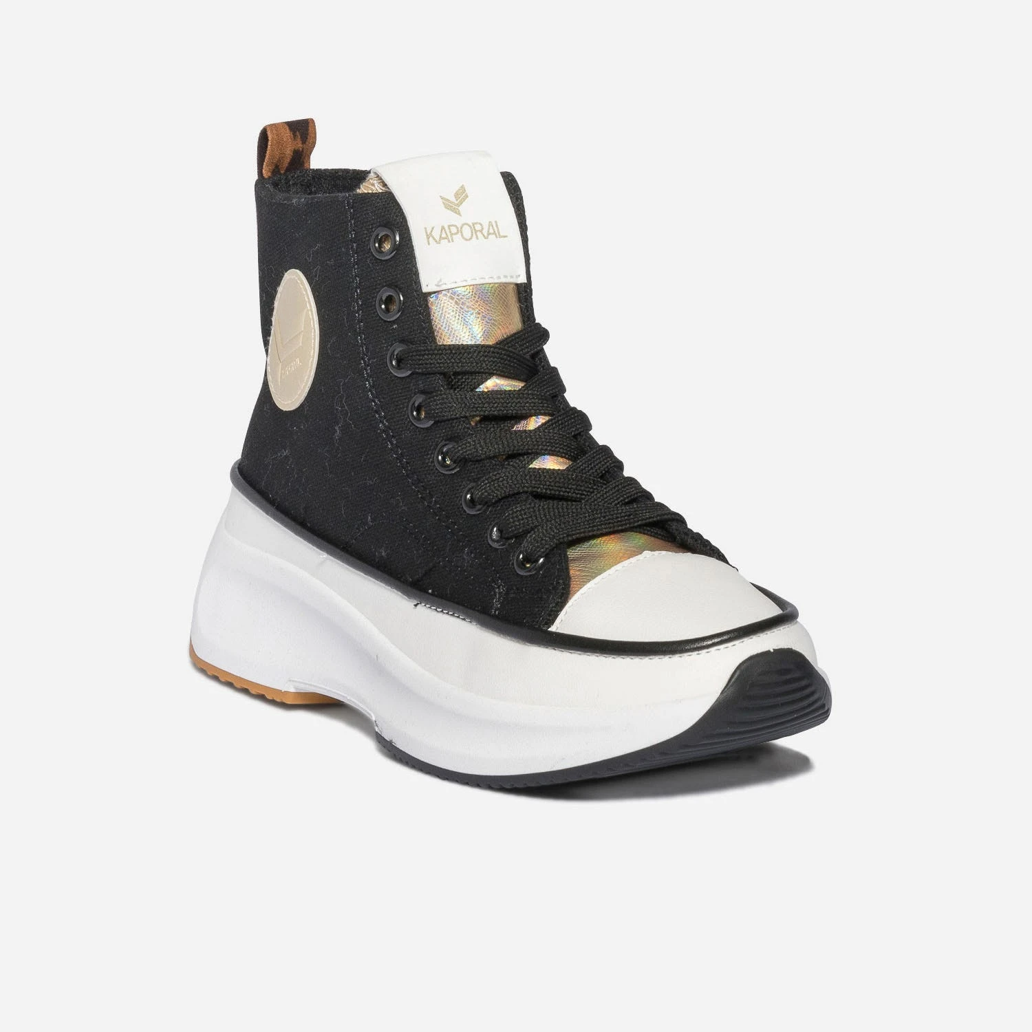 Entrez dans la saison estivale avec cette basket montante pour femme. En toile noire, elle affirme son style mode par une languette iridescente et un galon à imprimé léopard. Elle est livrée avec 2 paires de lacets plats, 1 noir et 1 rose fluo. Montée sur une semelle à plateforme, elle permet de prendre de la hauteur sans effort. Un modèle à porter avec une tenue colorée à l’esprit décontracté : crop top, pantalon large et casquette.