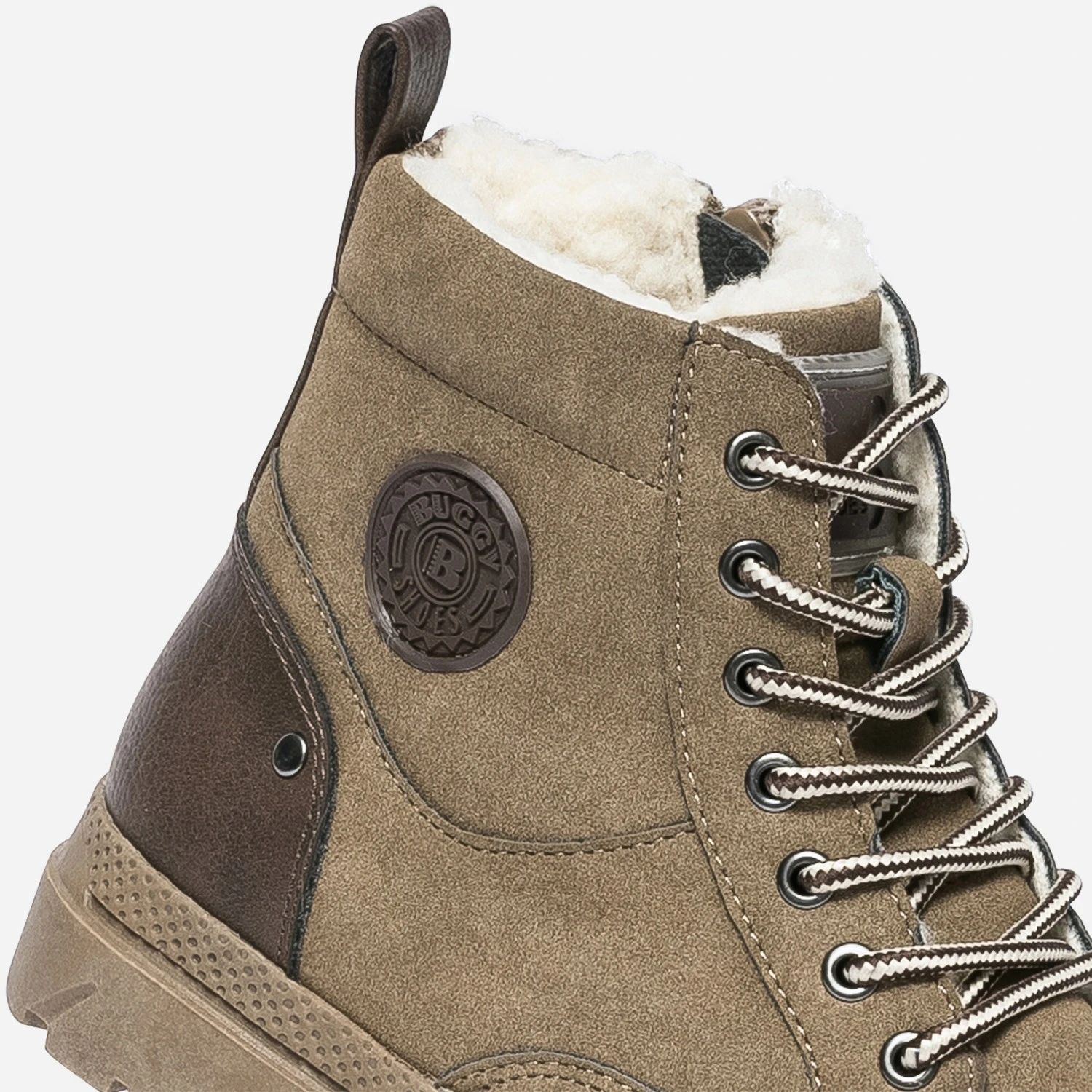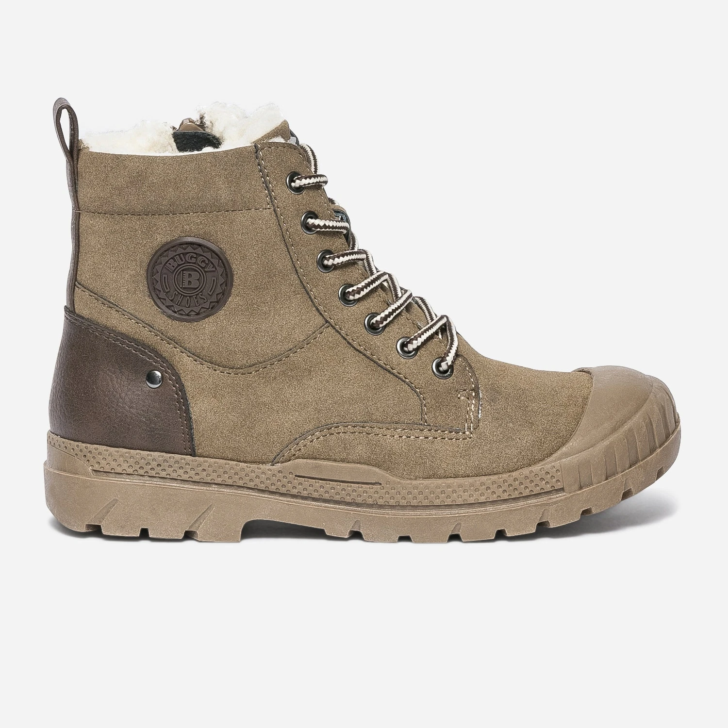 Chouette ! Chute de températures annoncée ! Et à ses pieds, un nouveau boots à lacet. En matière synthétique suédée, il se décline en coloris taupe, avec, pour l’occasion, une doublure bien chaude en sherpa. Fermeture par lacet et zip intérieur, bout renforcé et semelle crantée, c’est son meilleur allié pour traverser l’hiver, et la cour de récré.
