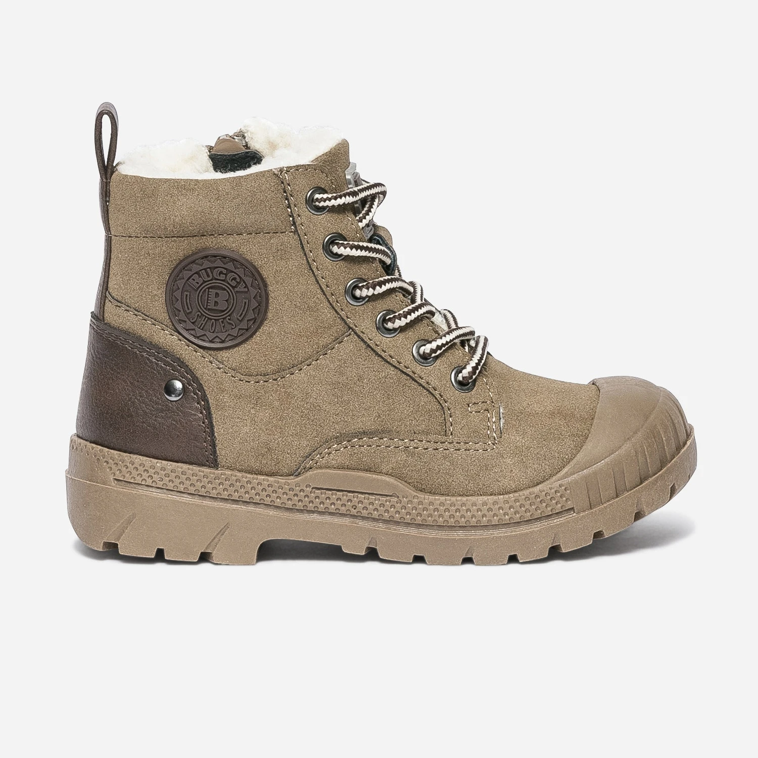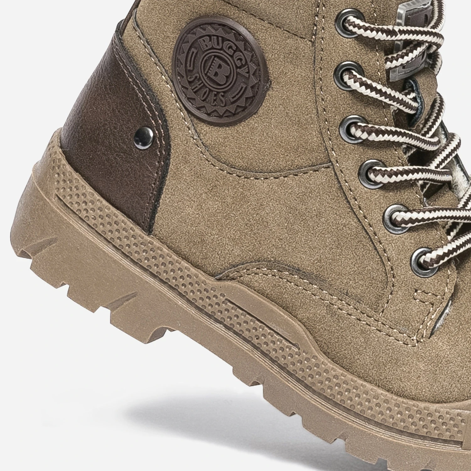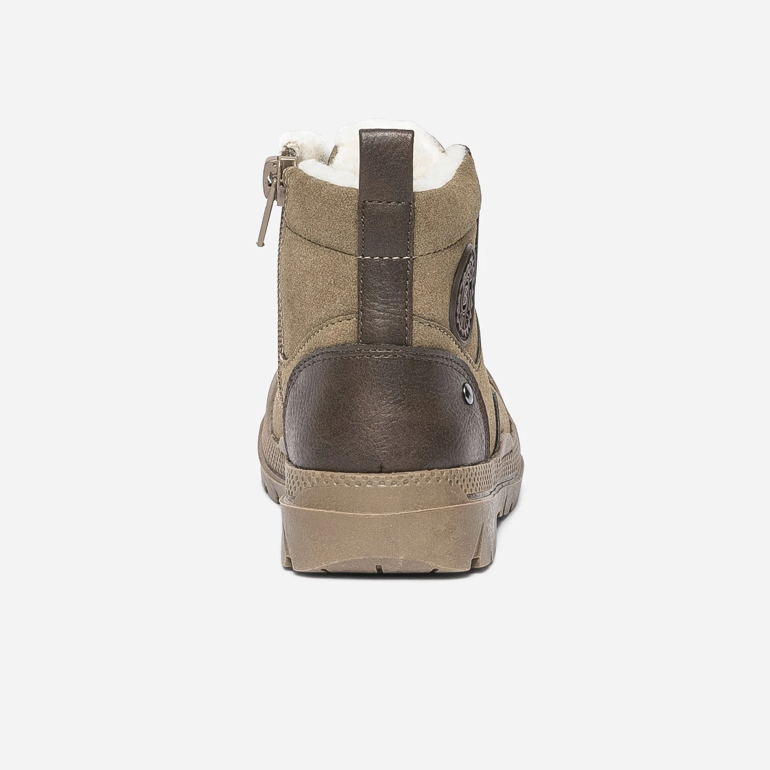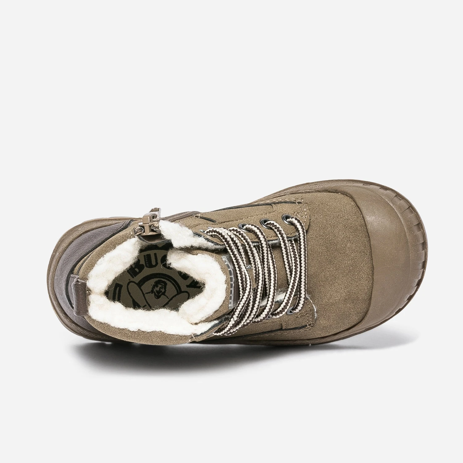 Chouette ! Chute de températures annoncée ! Et à ses pieds, un nouveau boots à lacet. En matière synthétique suédée, il se décline en coloris taupe, avec, pour l’occasion, une doublure bien chaude en sherpa. Fermeture par lacet et zip intérieur, bout renforcé et semelle crantée, c’est son meilleur allié pour traverser l’hiver, et la cour de récré.