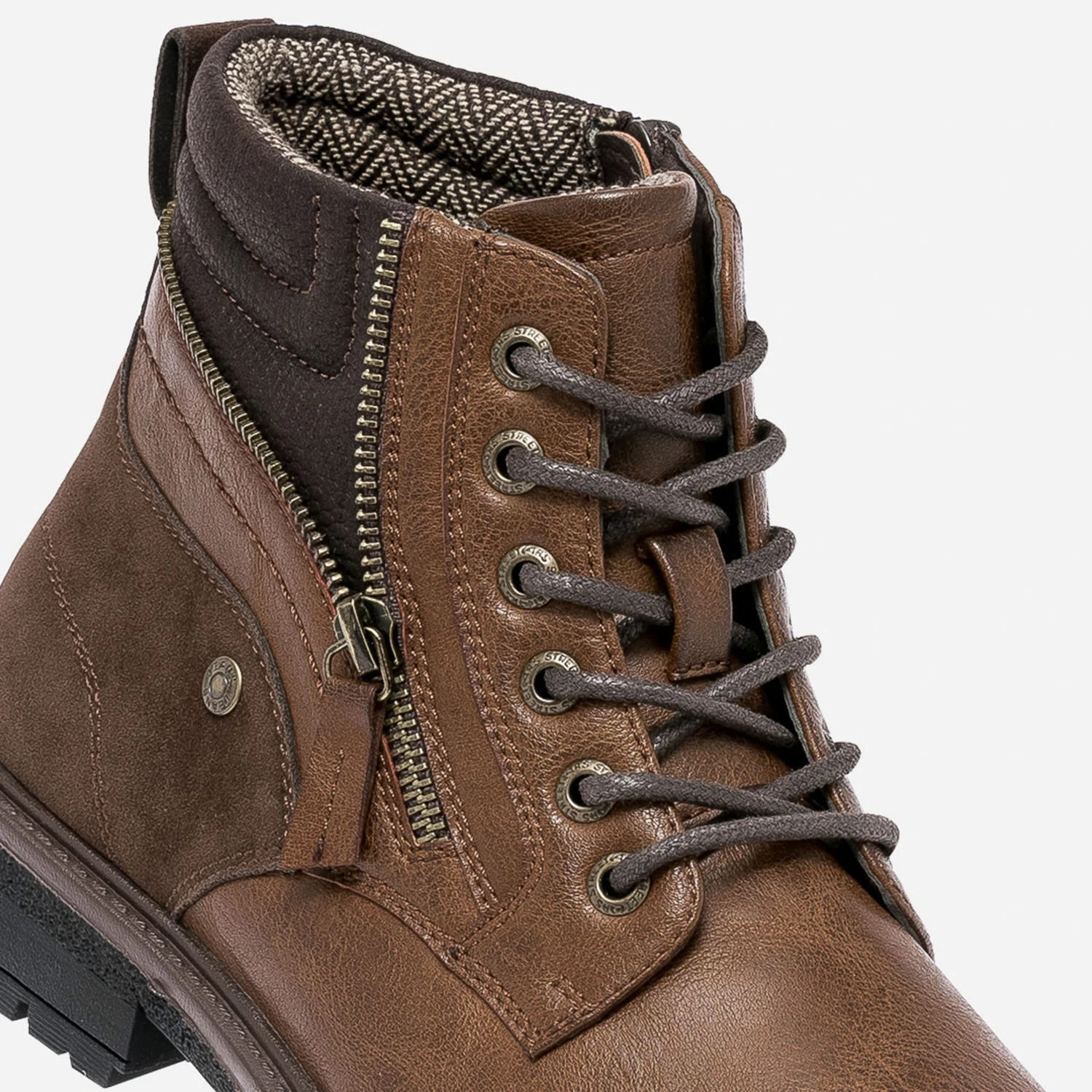 A quoi reconnaît-on le style workwear, cher à la mode masculine ? A une recherche de simplicité et un côté purement fonctionnel qui prime largement sur le côté esthétique. Exemple avec ce boots pour homme. Coloris cognac, entre le camel et le marron, il est monté sur une semelle crantée et sa tige haute se ferme par un lacet et par un zip latéral. Les détails, zip décoratif, empiècement en cuir velours et doublure à imprimé chevrons noir et blanc assurent la caution mode. Un modèle à privilégier avec un look casual, autour du denim, de la maille, et des teintes chinées.