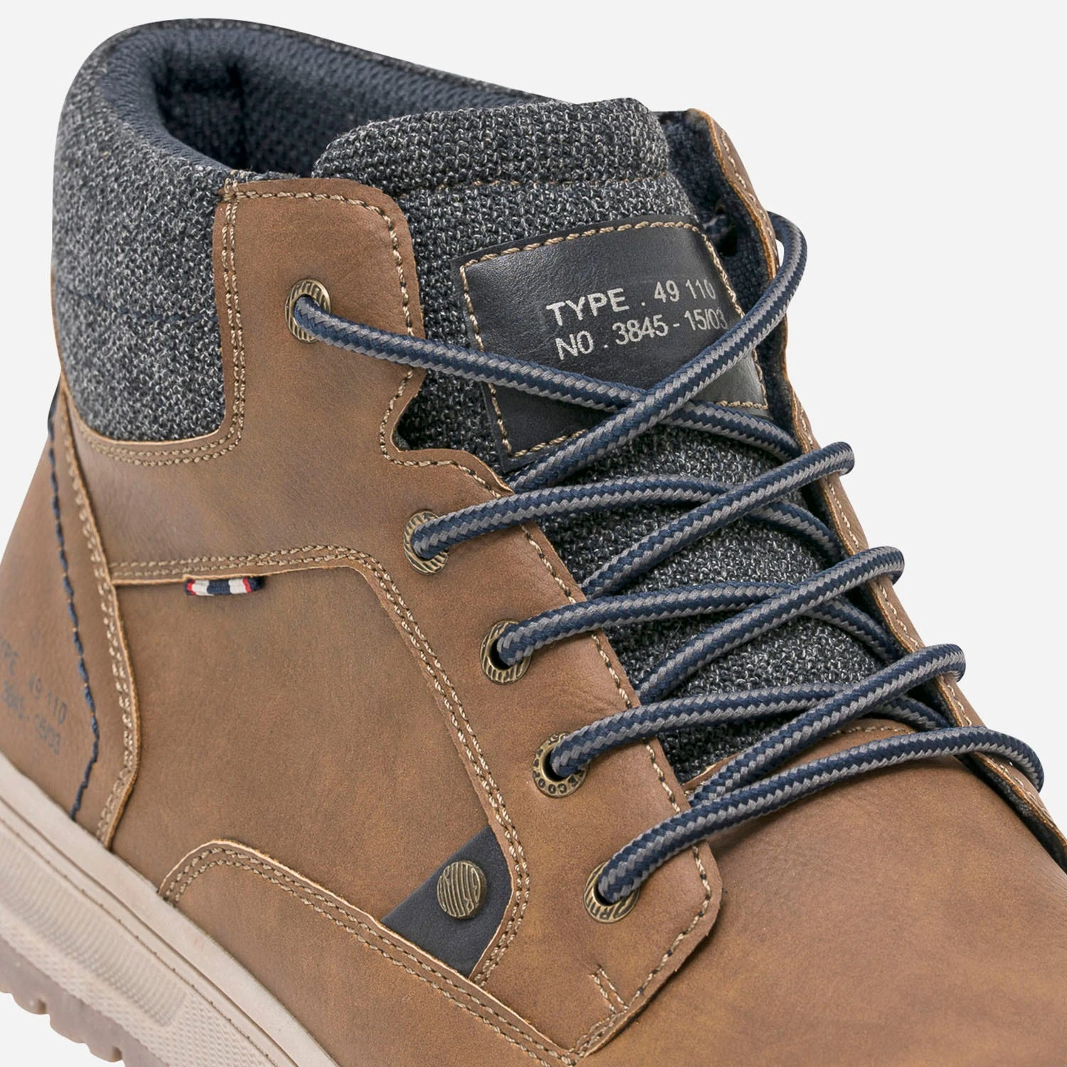 Matière synthétique sur le dessus, doublure et première en textile, ce boots pour homme se ferme par un lacet pour maintenir le pied. Marron clair, il présente un empiècement en textile marine chiné sur le haut de la tige, pour toujours plus de confort, et une semelle extérieure grise contrastée. Un modèle idéal pour vous accompagner, au quotidien.