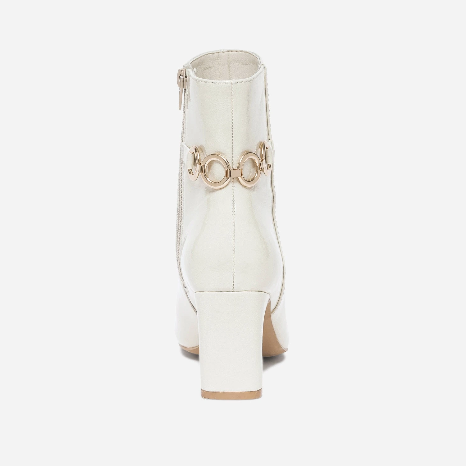 Prendre de la hauteur avec un talon de 7 cm. Gagner en chic avec une matière synthétique blanc cassé, une finition vernie et une chaîne à 4 anneaux en métal doré, posé à l’arrière de la tige. Ce boots pour femme ne demande qu’à être essayé. Privilégiez-le avec une tenue sobre, que vous accessoiriserez avec goût ; ceinture et bijoux dorés.