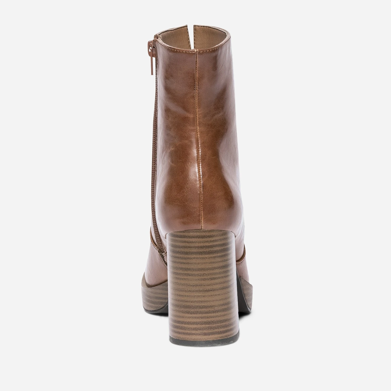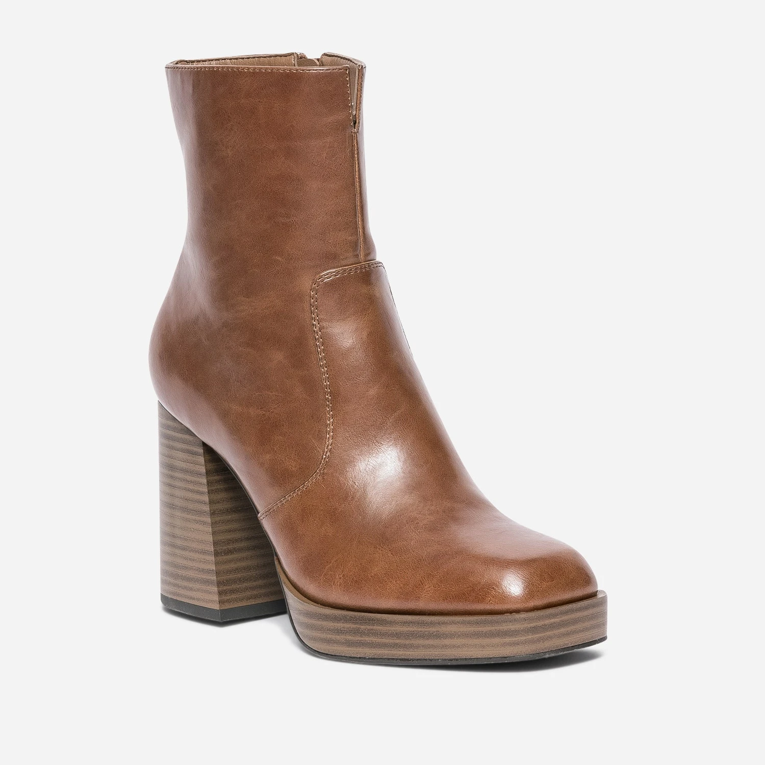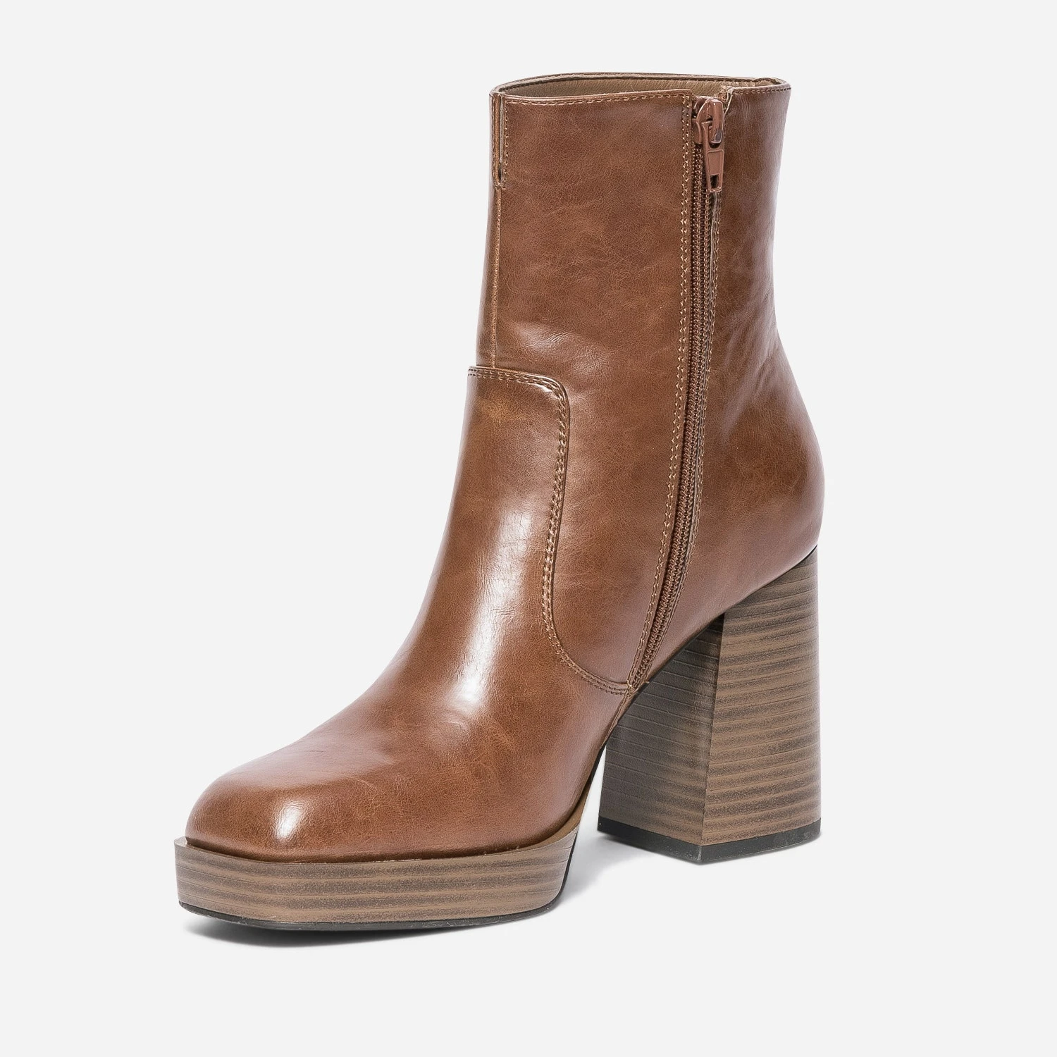 Ce boots femme est une des pépites à chausser cette saison. En matière synthétique lisse, il se décline en coloris camel, sobre et intemporel. Bout carré, talon flare de 9 cm et patin avant de 2 cm, les deux en imitation bois, il ambiance les tenues d’un style rétro inspiré des seventies. Pull sans manches en tricot et jean large sont ces meilleurs alliés. Essayez !