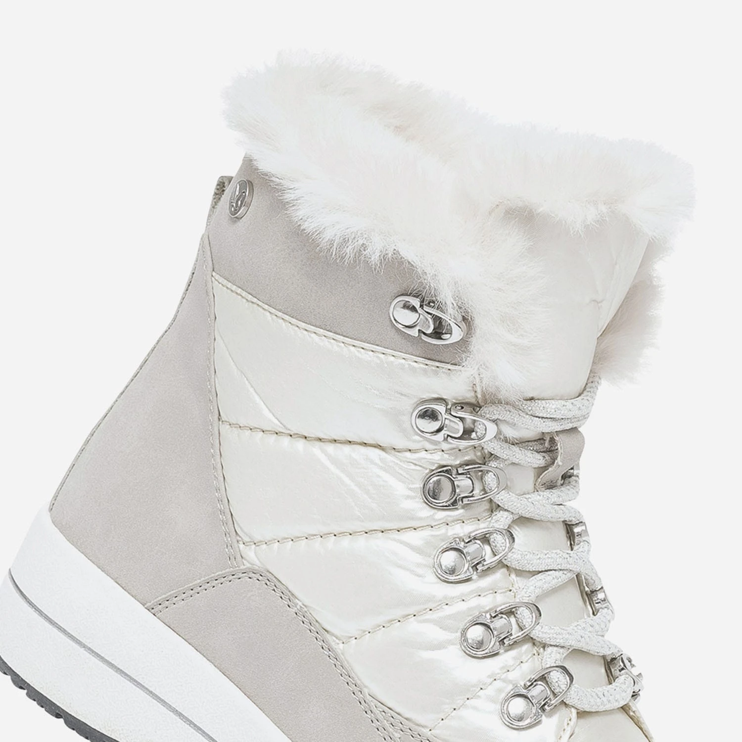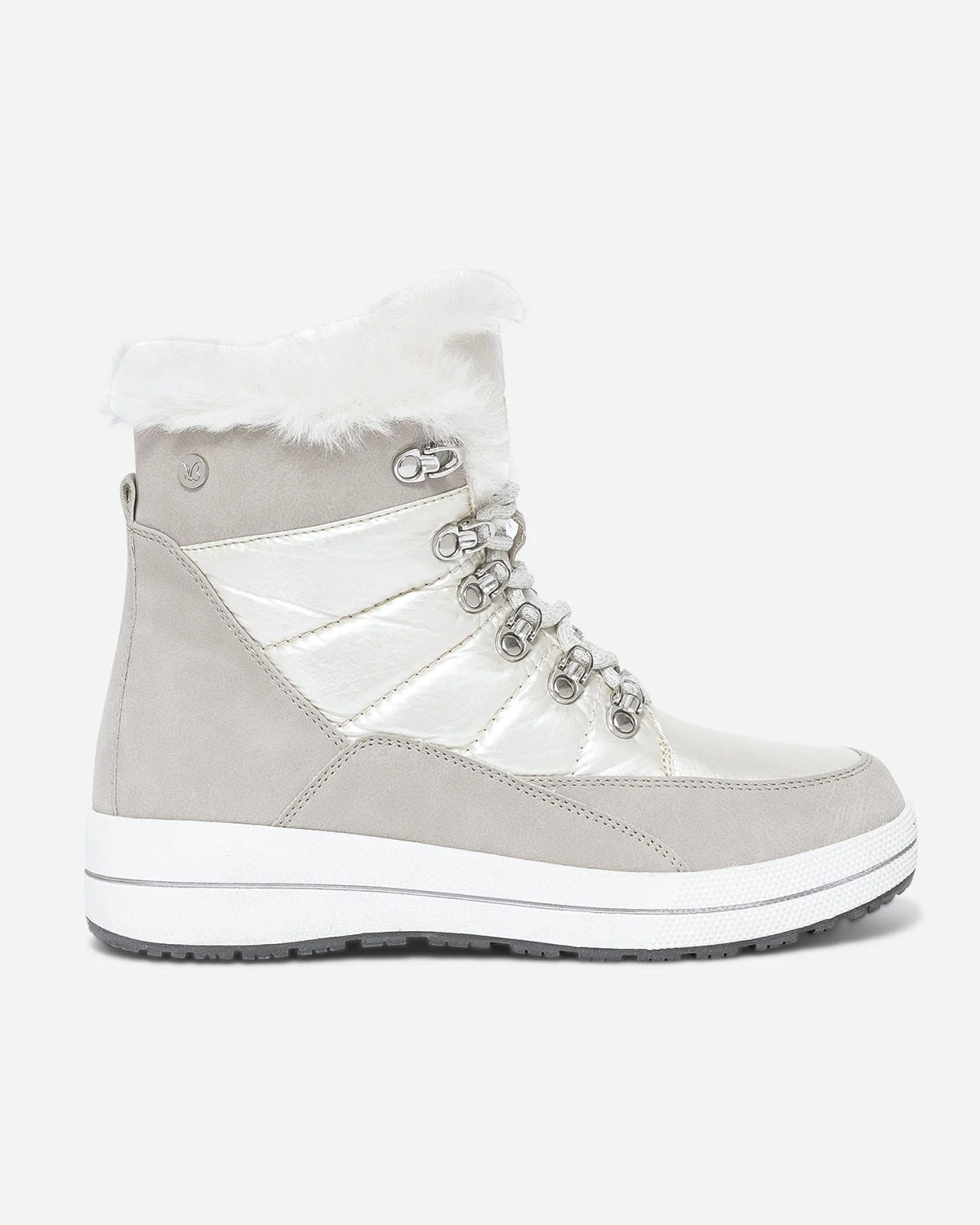 Spécialiste du bien-être, la marque CAPRICE propose des chaussures au confort incomparable. Ce boots femme est pensé pour les plus frileuses. Inspiré par les chaussures de montagne, notamment sur les œillets et le lacet-cordon, il se réinvente avec un mix de nylon blanc nacré et une matière synthétique beige. Monté sur une semelle épaisse dotée de la technologie ‘onAIR’, garantissant un meilleur amorti et une aération optimale, entièrement fourré, il est l’allié des journées froides et des séjours au ski.