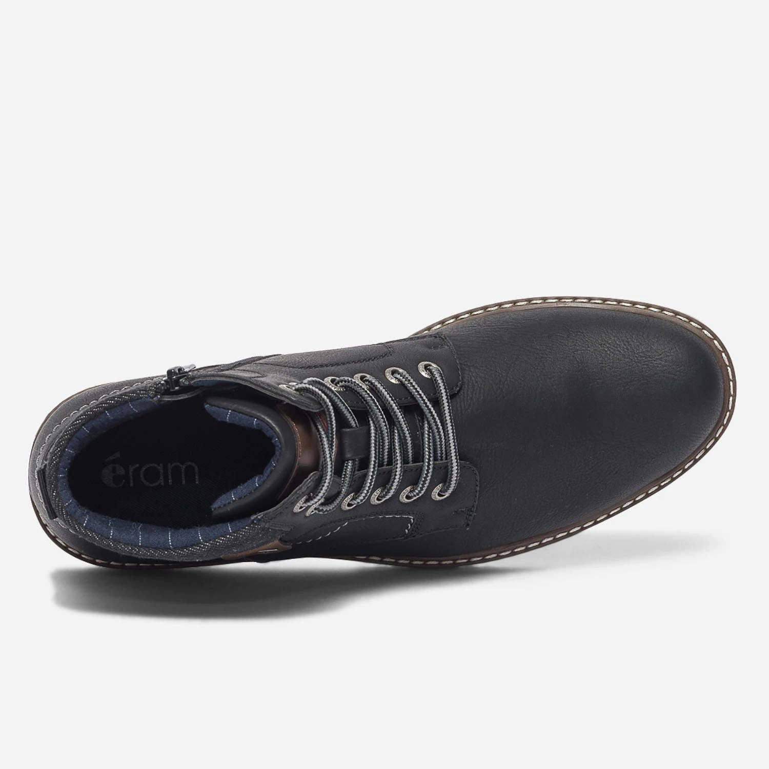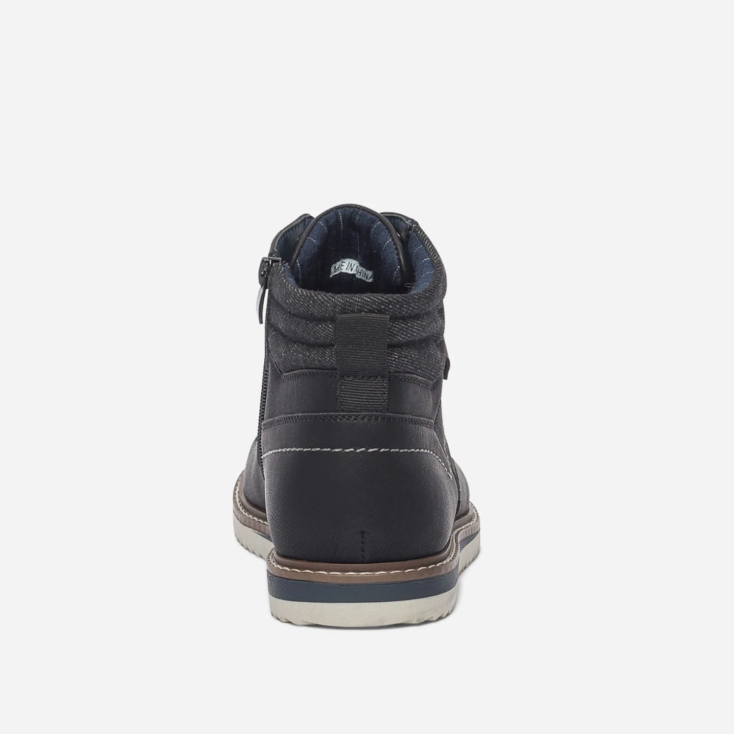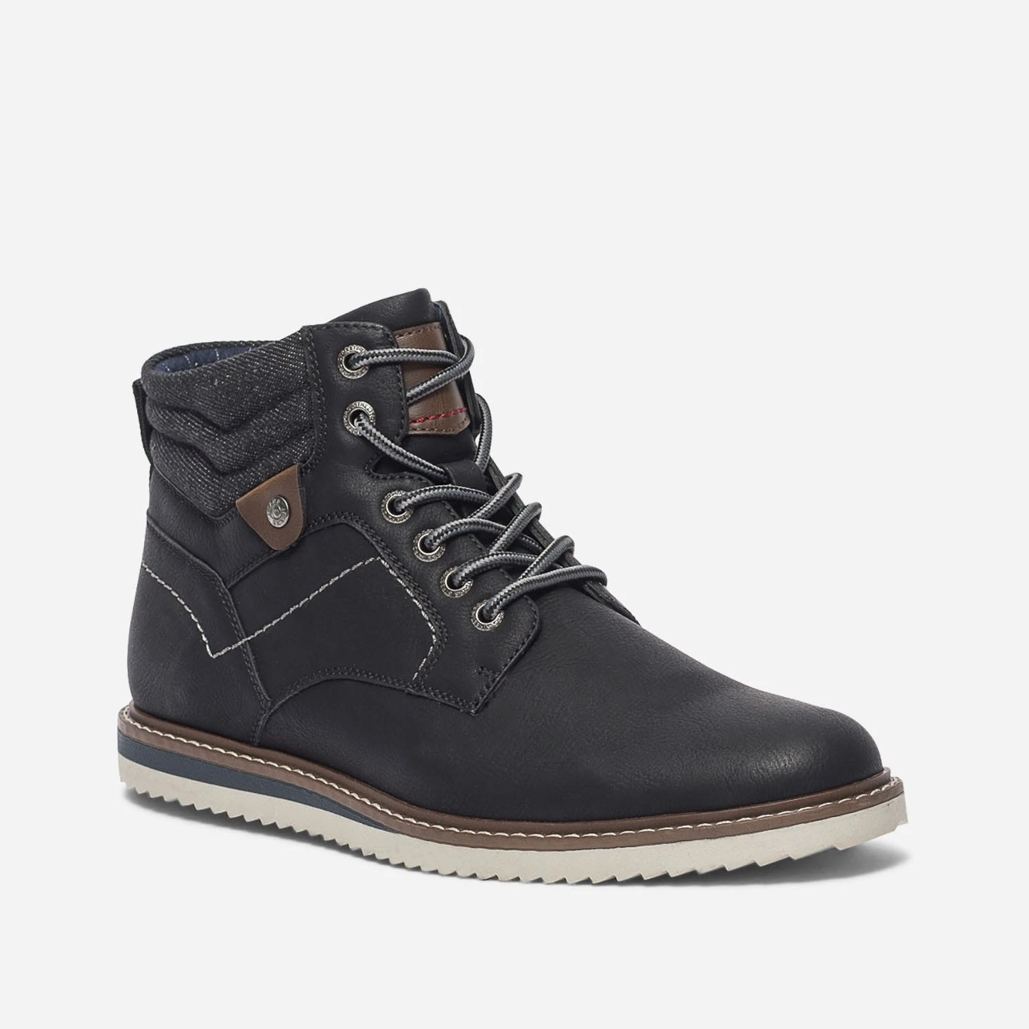Semelle crantée et tige montante, col matelassé et lacet esprit cordon, le boots homme se prépare à affronter l’hiver, en s’inspirant des montagnards. En matière synthétique noir, il présente un empiècement en textile marine esprit denim et une doublure imprimée à rayures tennis. La fermeture par lacet est renforcé par un zip intérieur. Un modèle à imaginer par grand froid, avec pull à col roulé, jean et parka. Vivement l’hiver !
