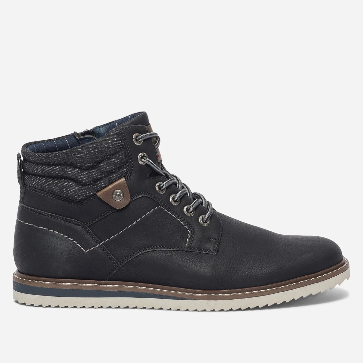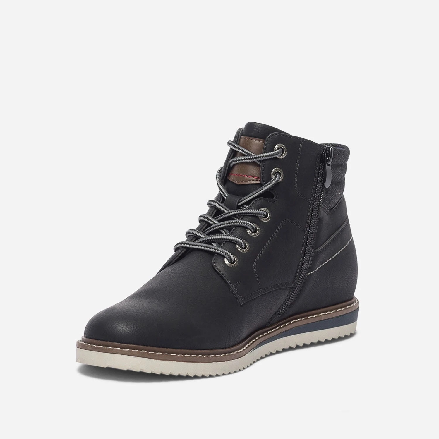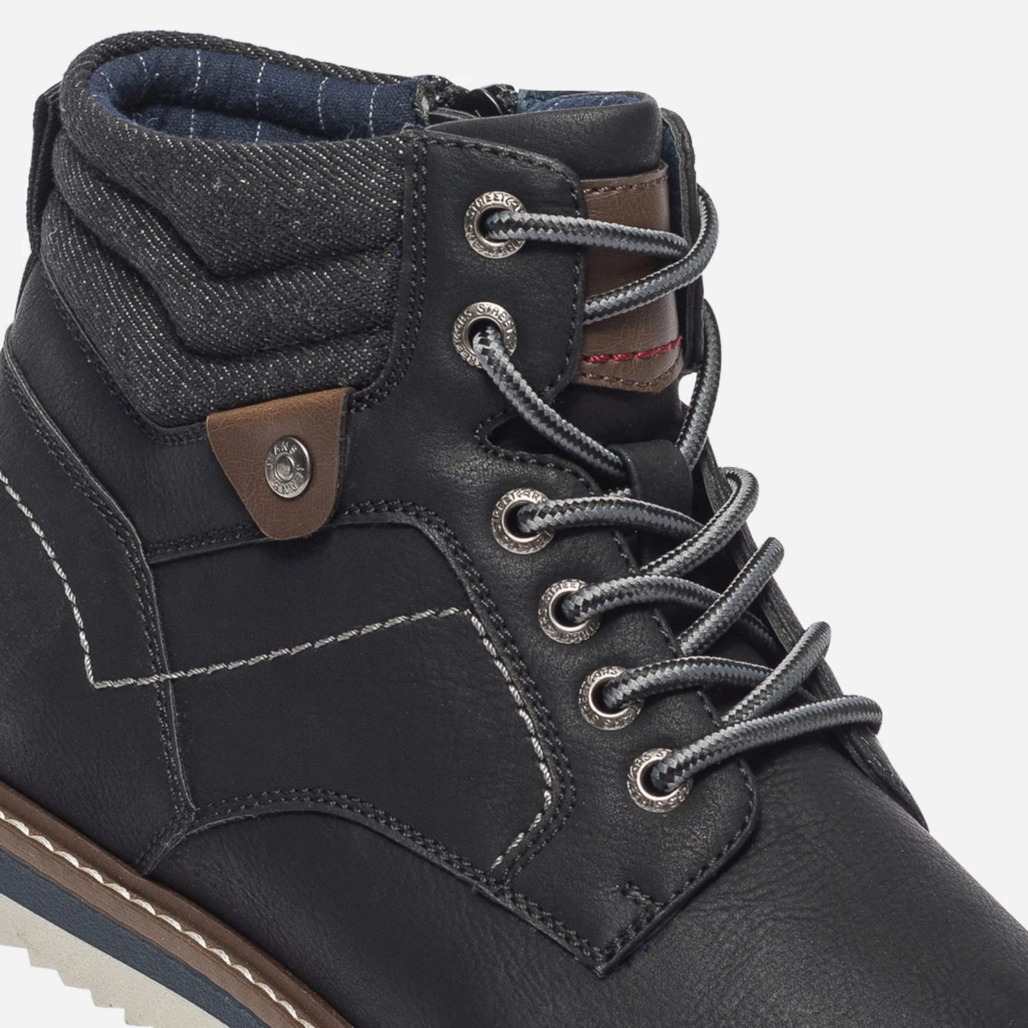 Semelle crantée et tige montante, col matelassé et lacet esprit cordon, le boots homme se prépare à affronter l’hiver, en s’inspirant des montagnards. En matière synthétique noir, il présente un empiècement en textile marine esprit denim et une doublure imprimée à rayures tennis. La fermeture par lacet est renforcé par un zip intérieur. Un modèle à imaginer par grand froid, avec pull à col roulé, jean et parka. Vivement l’hiver !