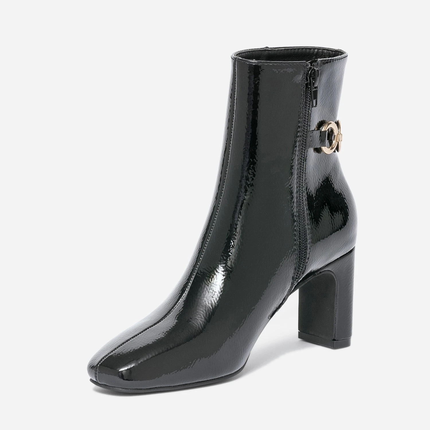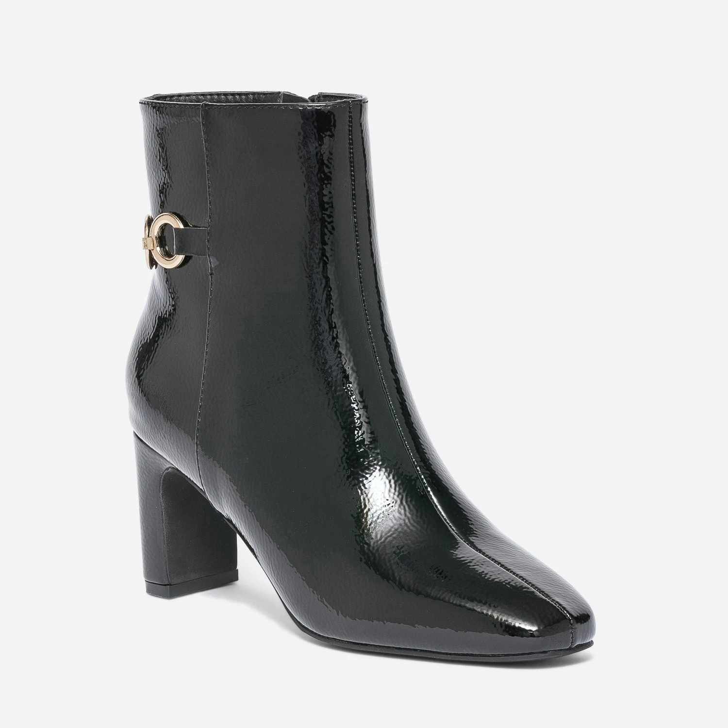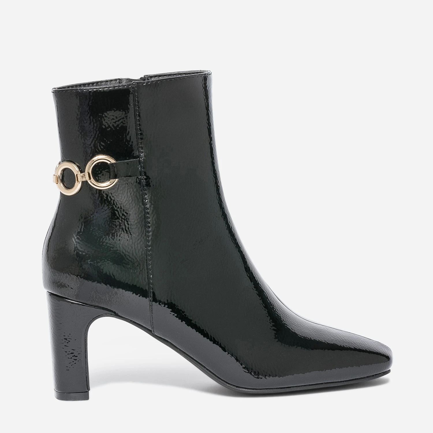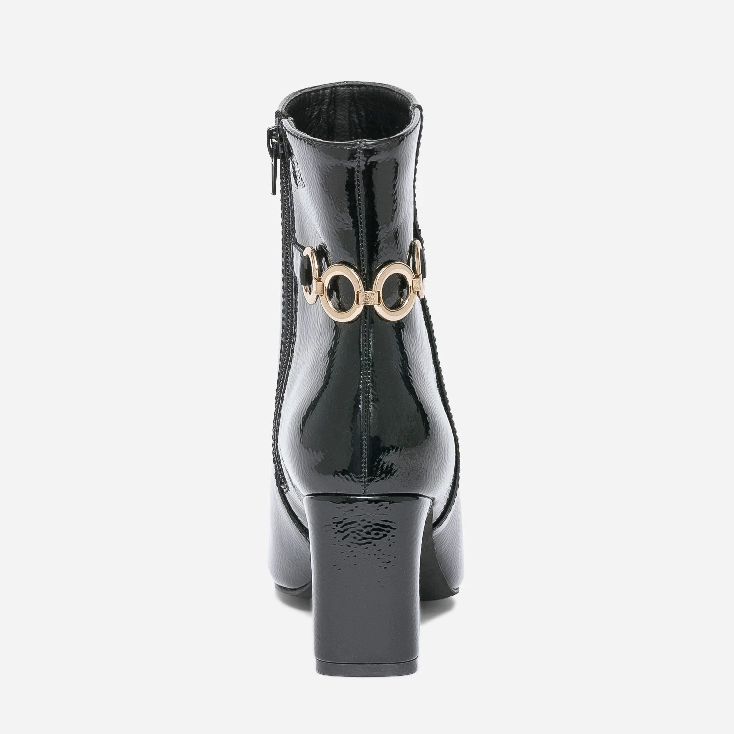Prendre de la hauteur avec un talon de 7 cm. Gagner en chic avec une matière synthétique noire, une finition vernie et une chaîne à 4 anneaux en métal doré, posé à l’arrière de la tige. Ce boots pour femme ne demande qu’à être essayé. Privilégiez-le avec une tenue sobre, que vous accessoiriserez avec goût ; ceinture et bijoux dorés.