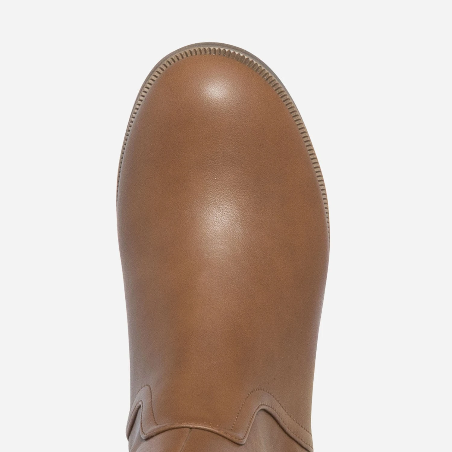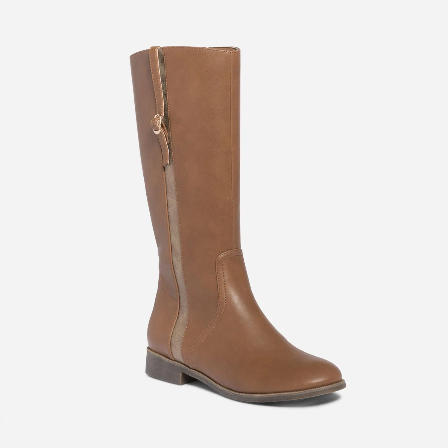 Tige haute et bout rond, la botte pour fille joue la simplicité. Imitation cuir marron, elle signe un twist d’originalité par une bande irisée cuivrée placée sur le côté, avec une patte décorative. Un modèle idéal dès l’arrivée de l’automne et tout au long de la saison.
