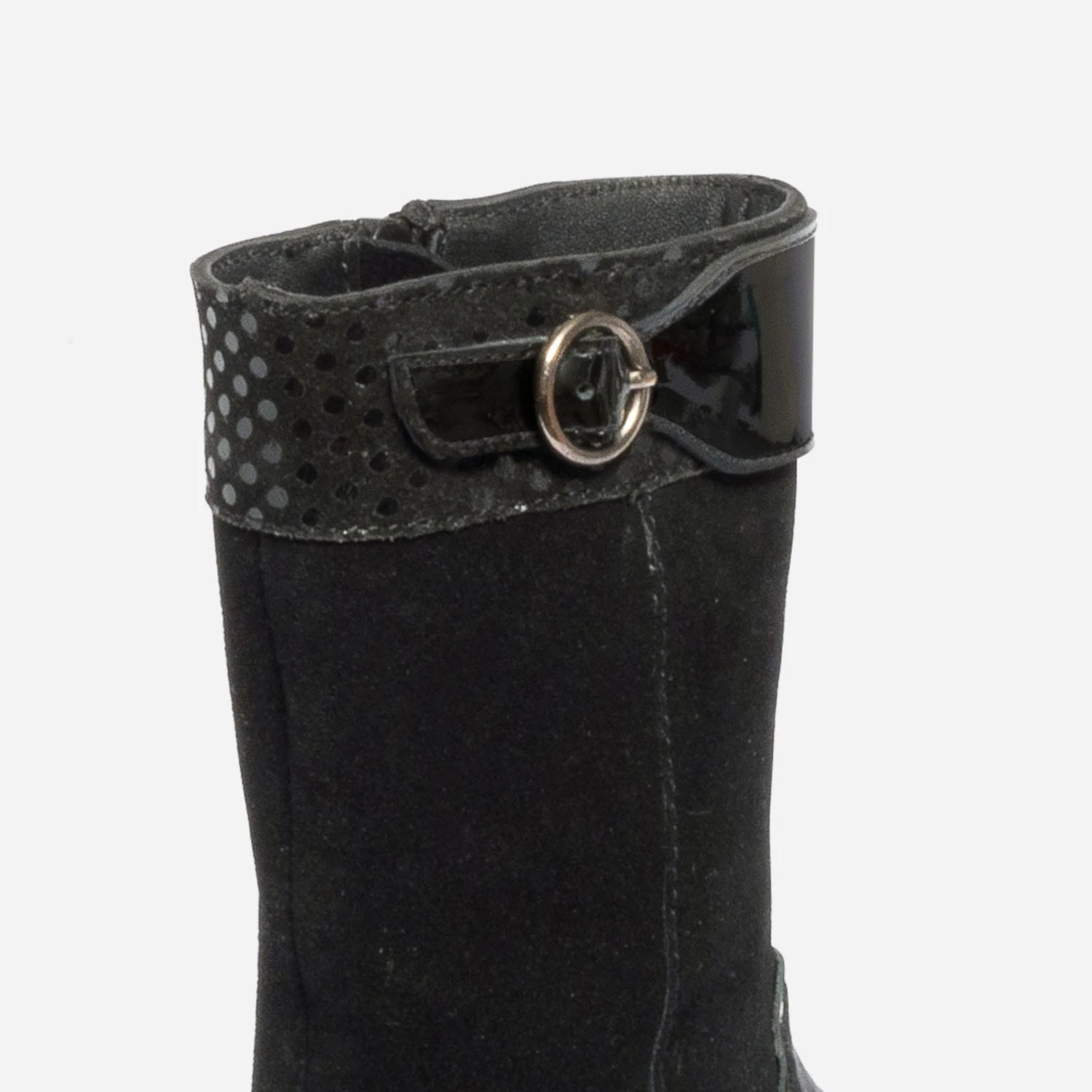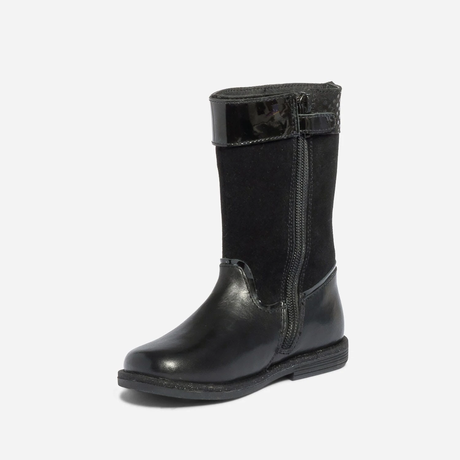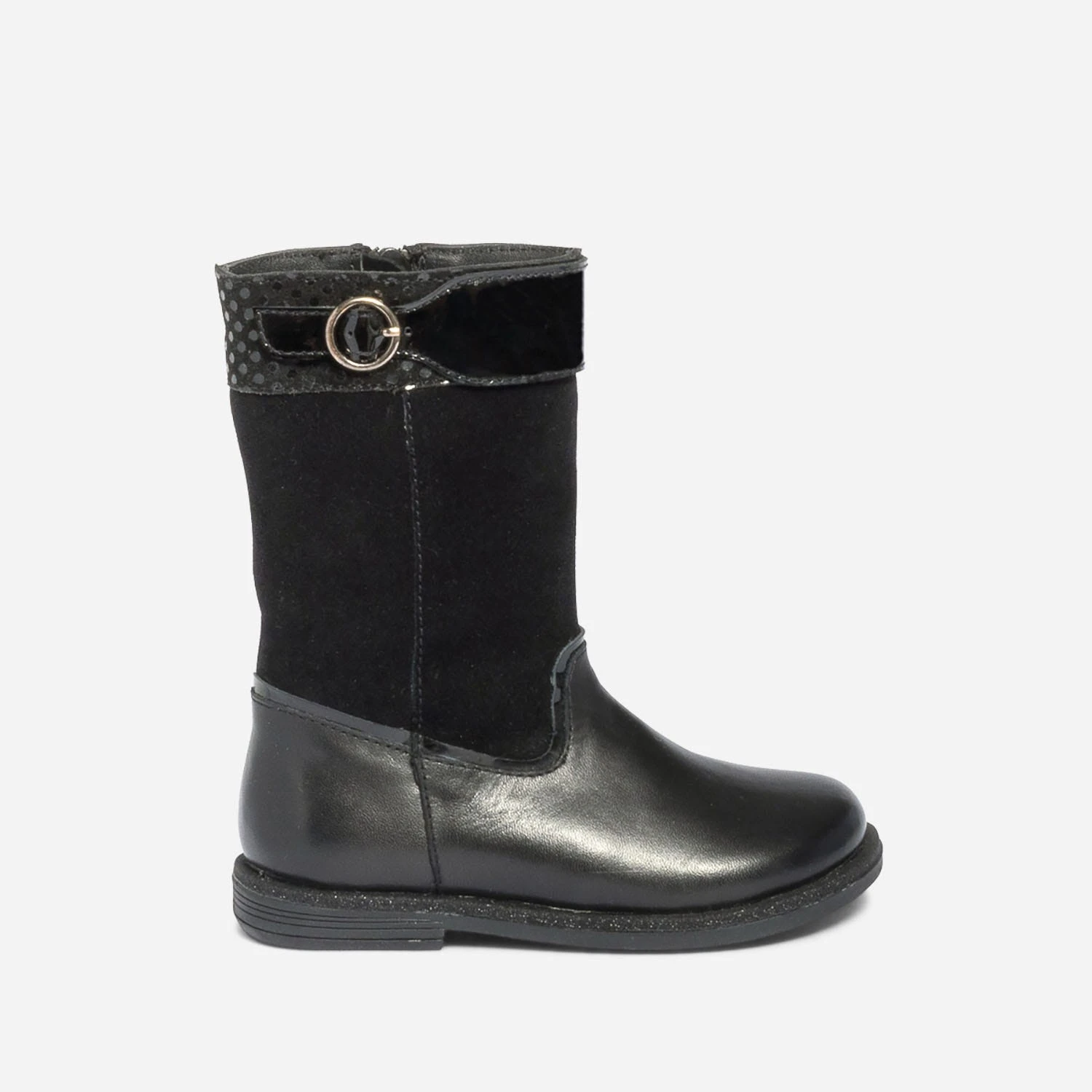 Entre averses et coups de froid, la botte est plus que jamais de mise ! En cuir, elle associe une finition lisse et velours, avec de nombreux détails pensés pour plaire aux filles : patte vernie et imprimé pois sur le haut de la tige, paillettes sur la trépointe. Noire, elle a le pouvoir de s’accorder à tout : osez robe, jupe ou short avec une jolie paire de collants.
