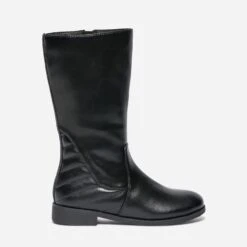 Et si vous lui proposiez la botte pour cet hiver ? En matière synthétique noire, elle présente un talon plat, bien sur, et se démarque par un effet matelassé, placé sur le contrefort et rappelant le style motard. Privilégiez ce modèle fille avec des robes et des jupes, mais aussi avec des jeans skinny, pour des looks plutôt city.