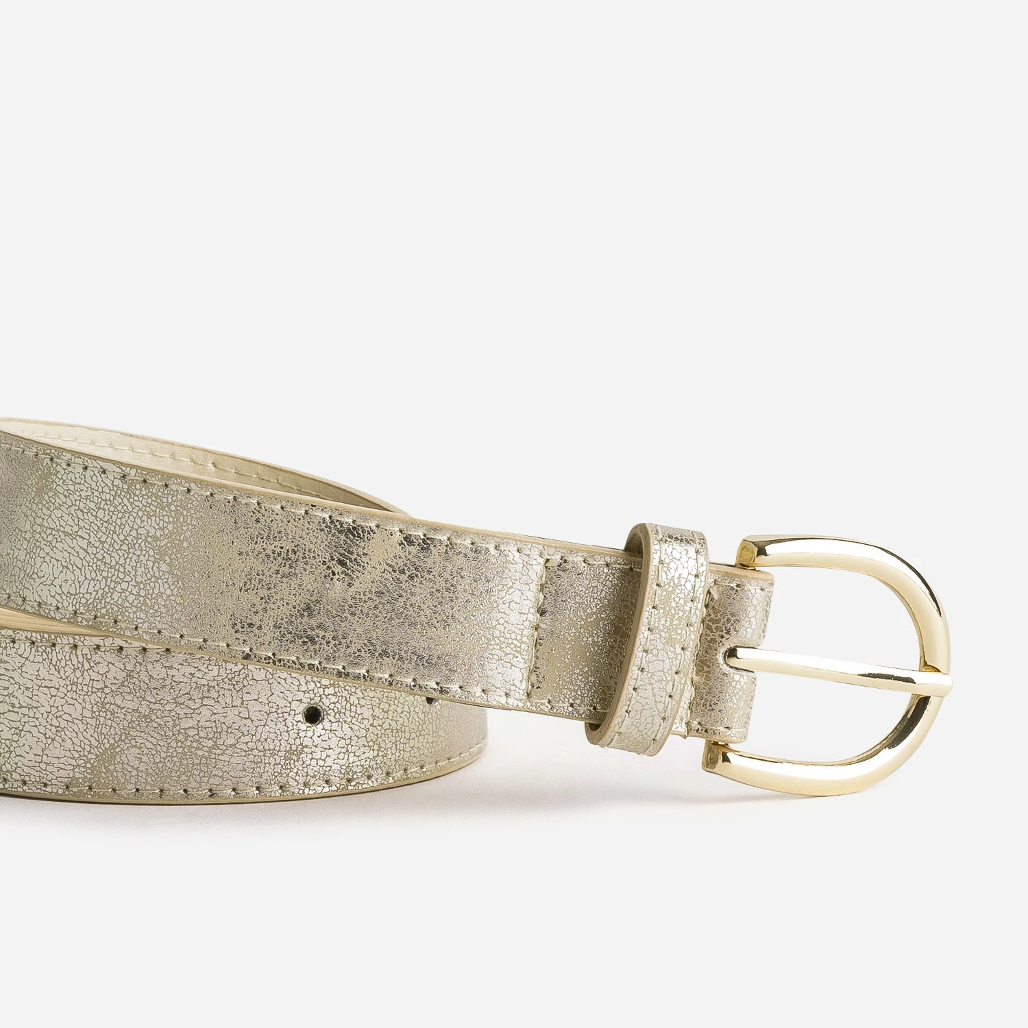 La ceinture est un accessoire à la fois fonctionnel et stylé. En matière synthétique, elle se décline en coloris doré, avec une finition patinée, qui lui confère un caractère authentique. Idéale sur un jean ou un pantalon cigarette, avec des sandales assorties.