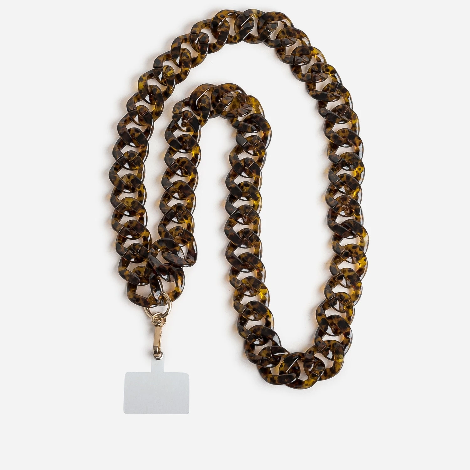 Le nouvel accessoire incontournable cette saison, c’est la chaîne-bijou spéciale téléphone portable. Constituée de maillons en matière synthétique, elle opte pour un coloris marron avec effet écailles. Un modèle chic, parfait pour rester connectée.