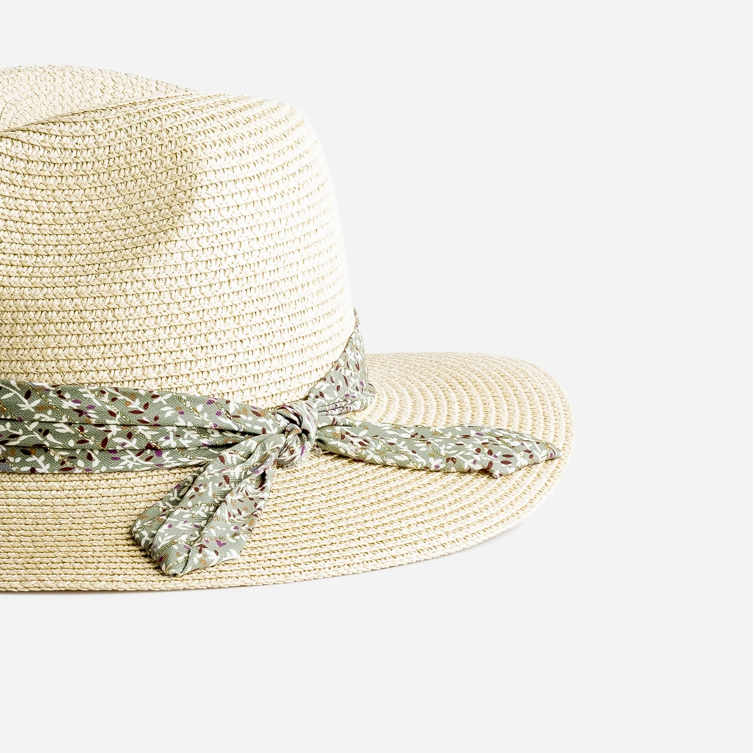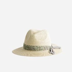 Inspiration panama pour ce chapeau pour femme. En 100% papier façon paille tressée, il est décoré d’un galon-foulard vert sauge, à imprimé floral et rayures dorées, avec nœud fixe. Saharienne kaki sur top en crochet et pantalon large beige seront ses meilleurs partenaires de look.