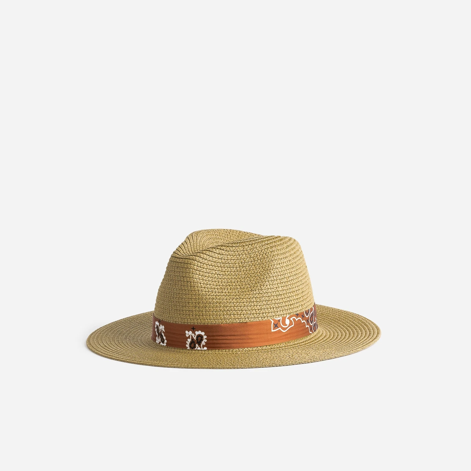 Chapeau en paille, fédora ou Borsalino : qu’importe le nom que vous lui donnez. C’est l’accessoire qui va vous faire aimer l’été. En 100% papier beige foncé, il est souligné d’un galon camel d’inspiration foulard, avec imprimé cachemire. Intemporel, élégant, il se porte avec un costume blanc ou une chemise rose à fines rayures sur un pantalon en lin beige.