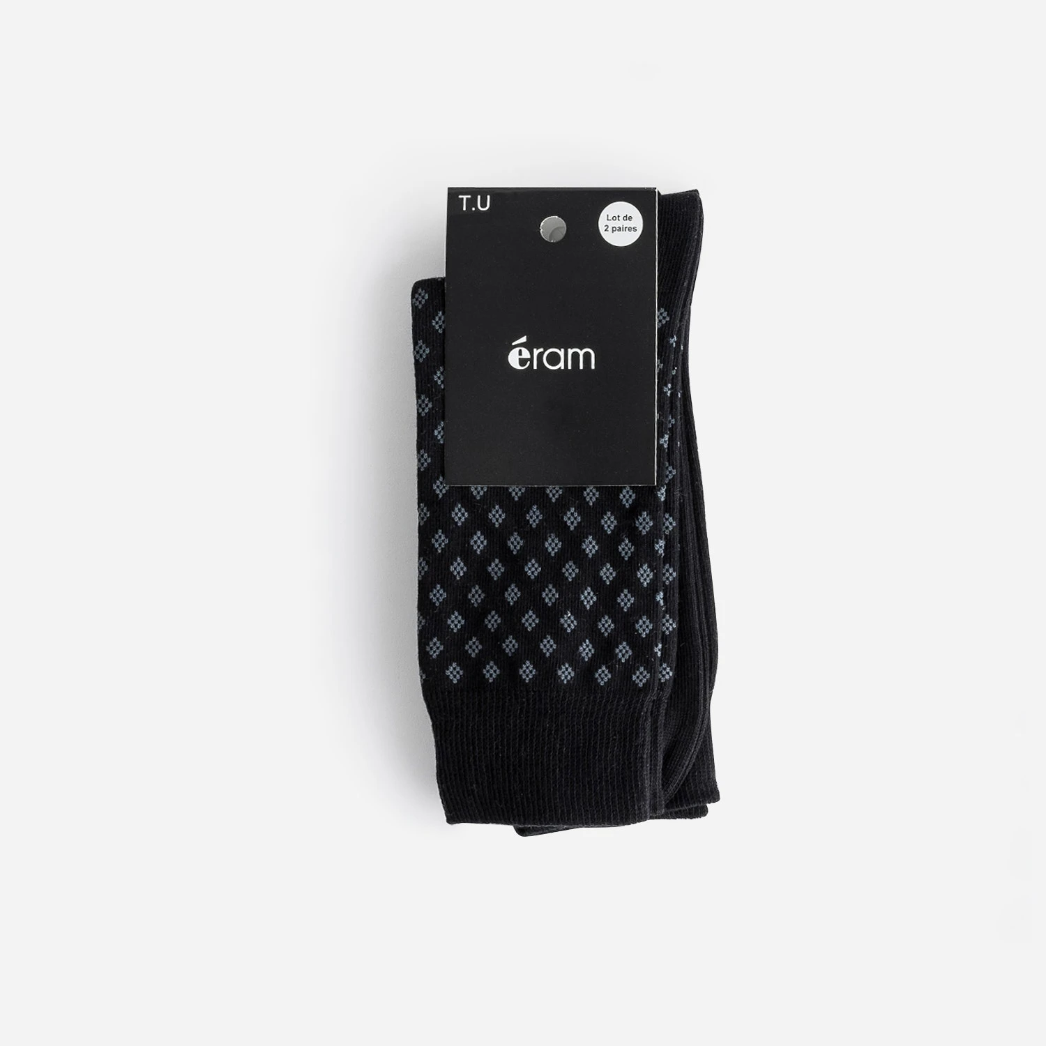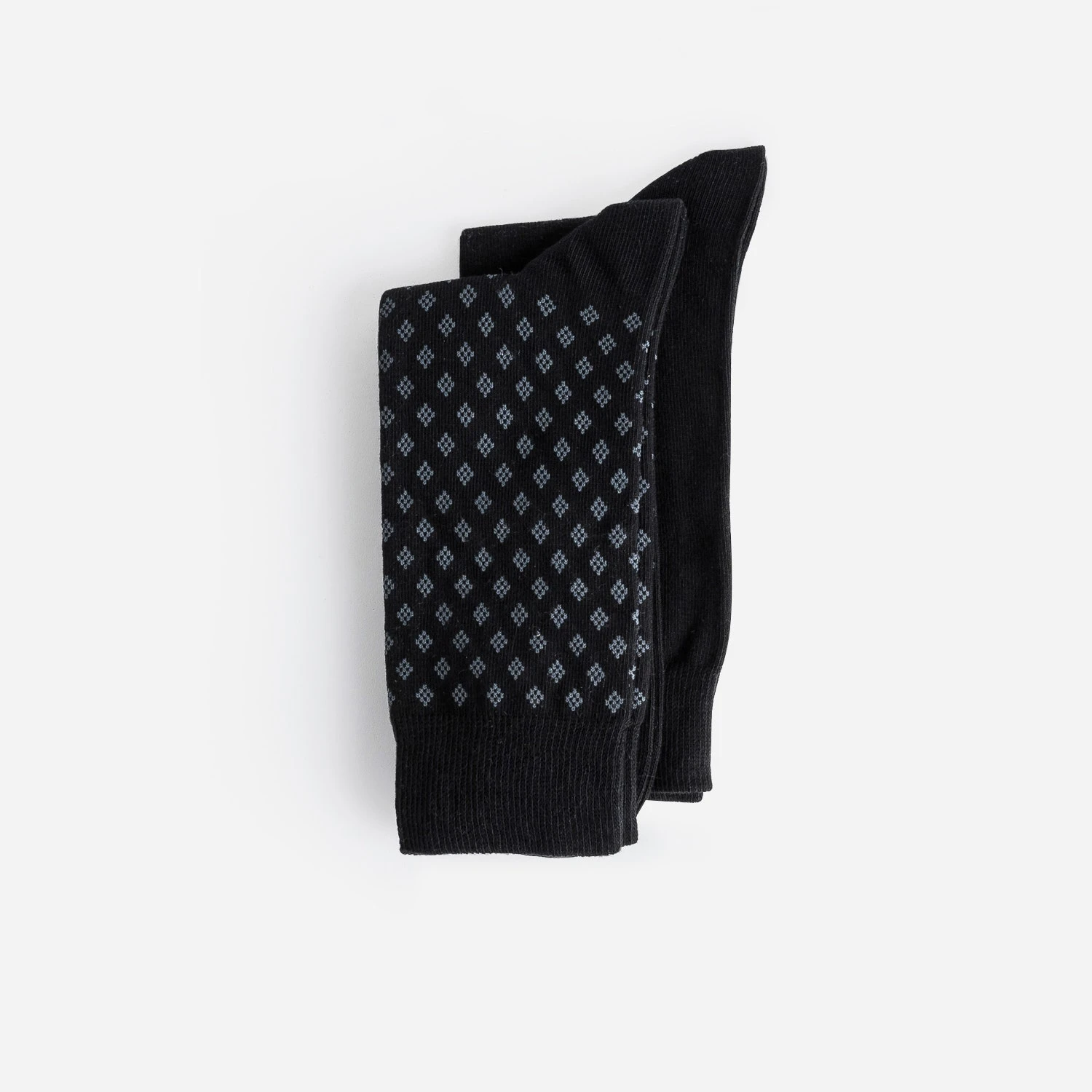 Des chaussettes noires unies. Des chaussettes noires jacquard à motif cravate. Des chaussettes pour homme, idéales, au quotidien, avec un costume noir ou gris foncé, ou avec un look plus casual.