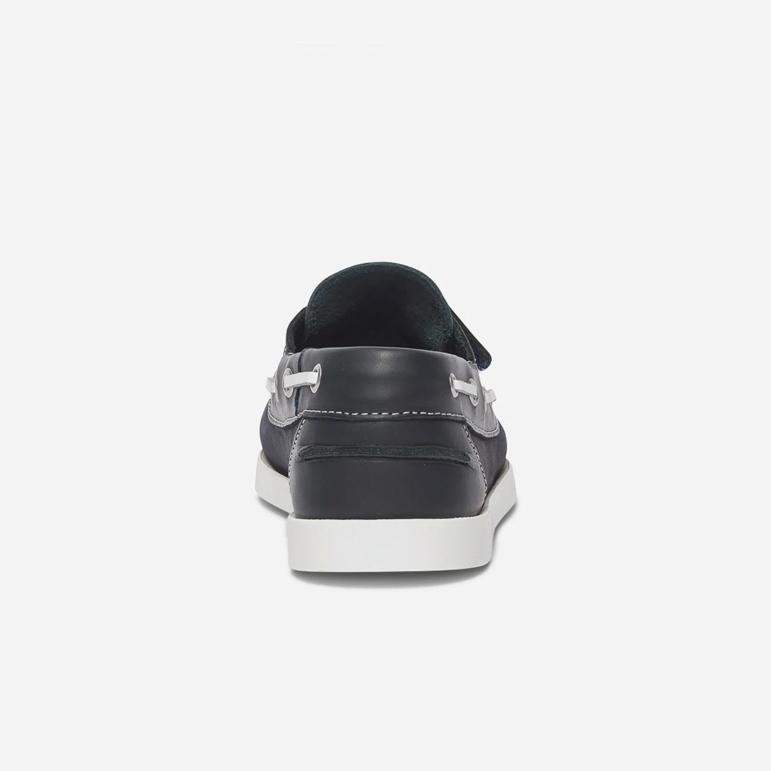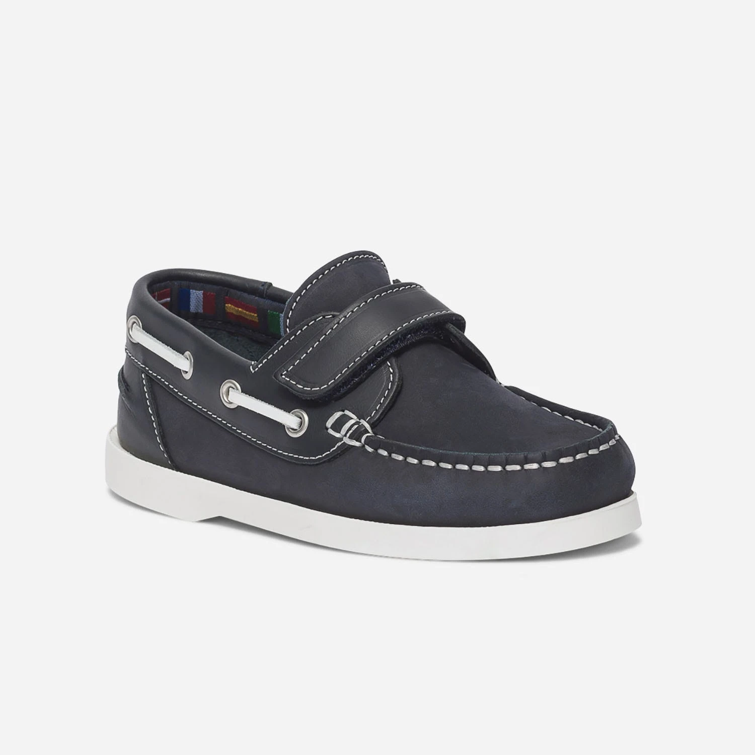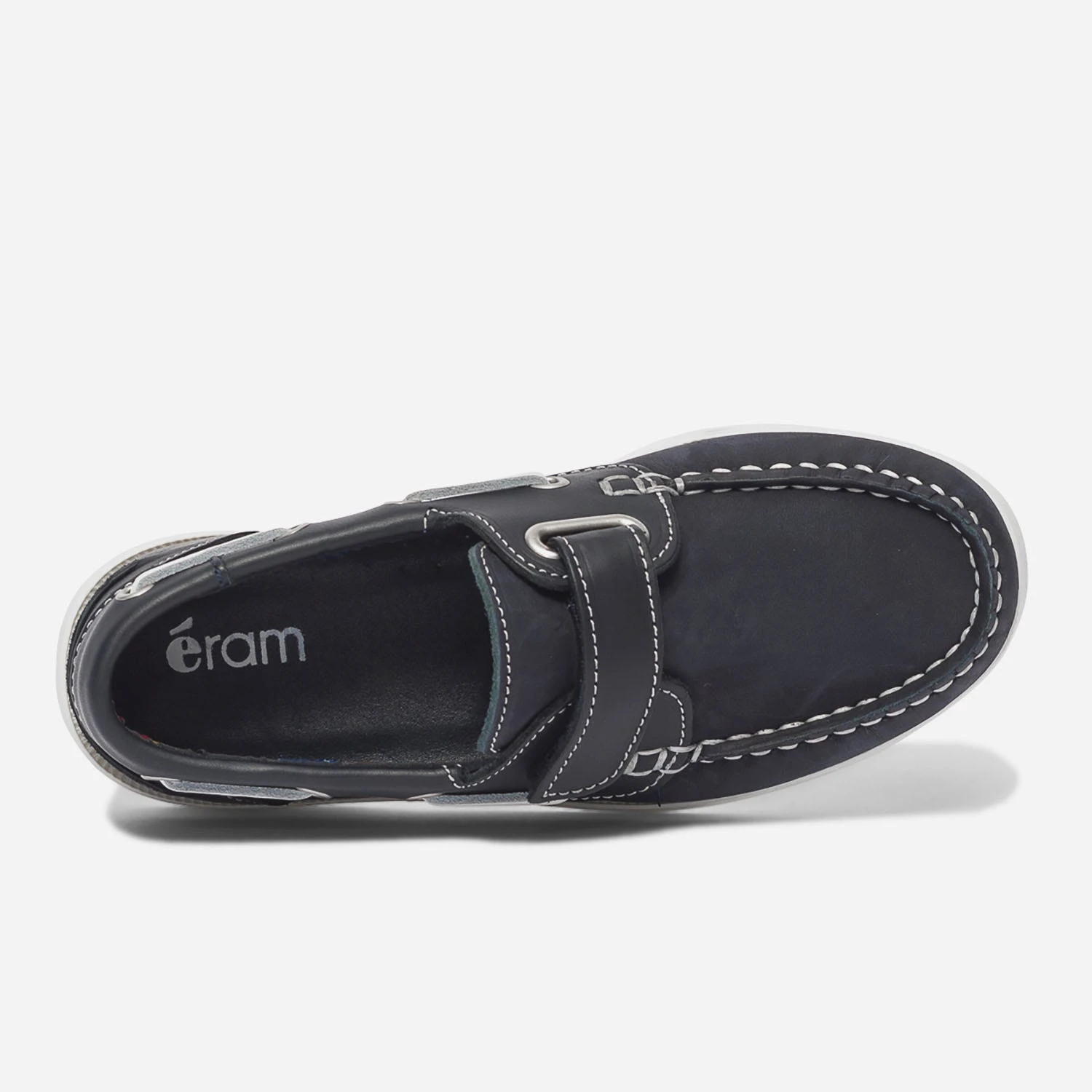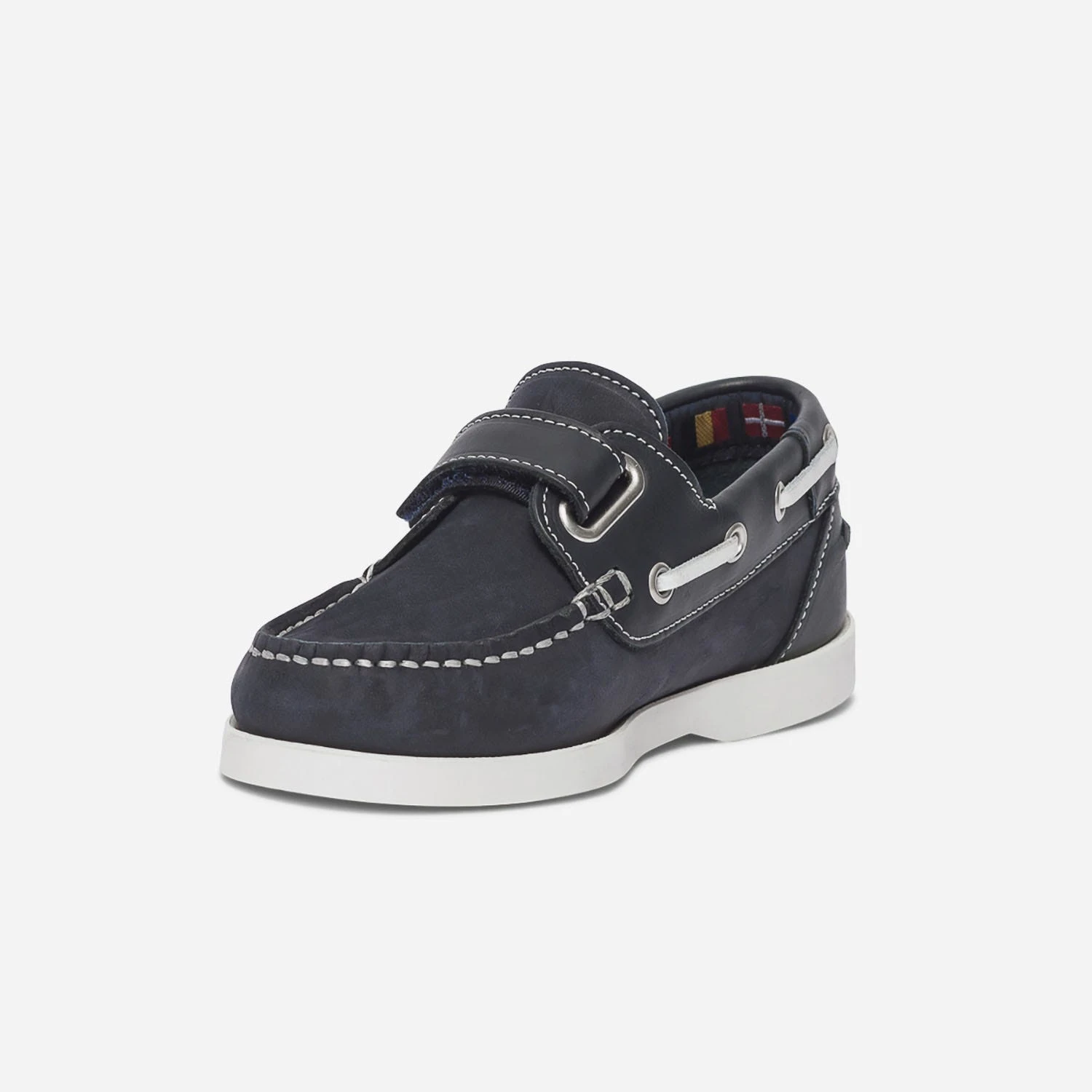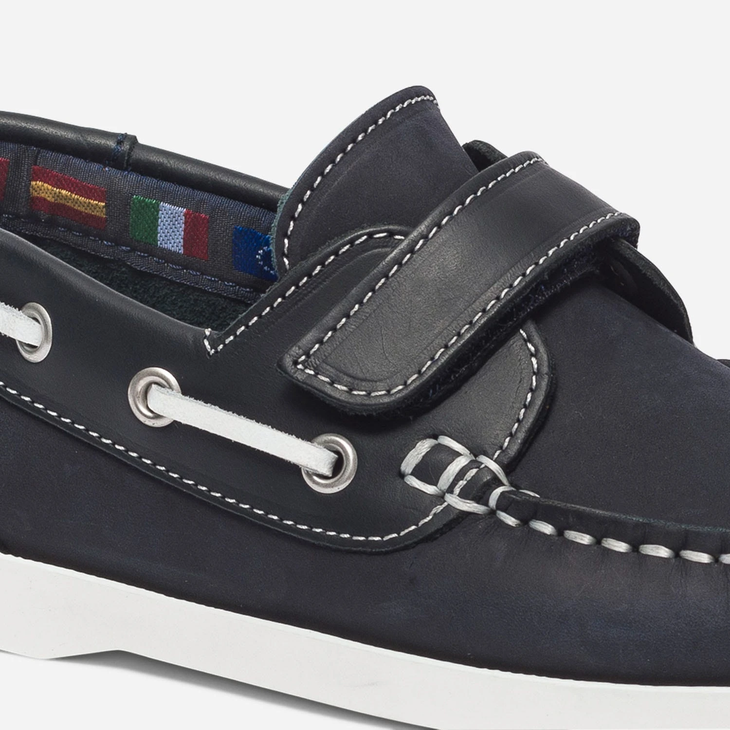 S’il existe un modèle emblématique qui a fait ses preuves, c’est bien la chaussure-bateau ! En cuir non doublé pour gagner en souplesse, elle se décline en coloris bleu marine rythmé de surpiqûres, d’un lacet en bord de tige et d’une semelle blanche. Spécialement repensée pour accompagner les enfants au quotidien, elle se ferme par un scratch et dévoile, à l’intérieur, un galon imprimé des drapeaux européens. Un modèle facile à porter, avec un polo et un bermuda, dès les beaux jours.