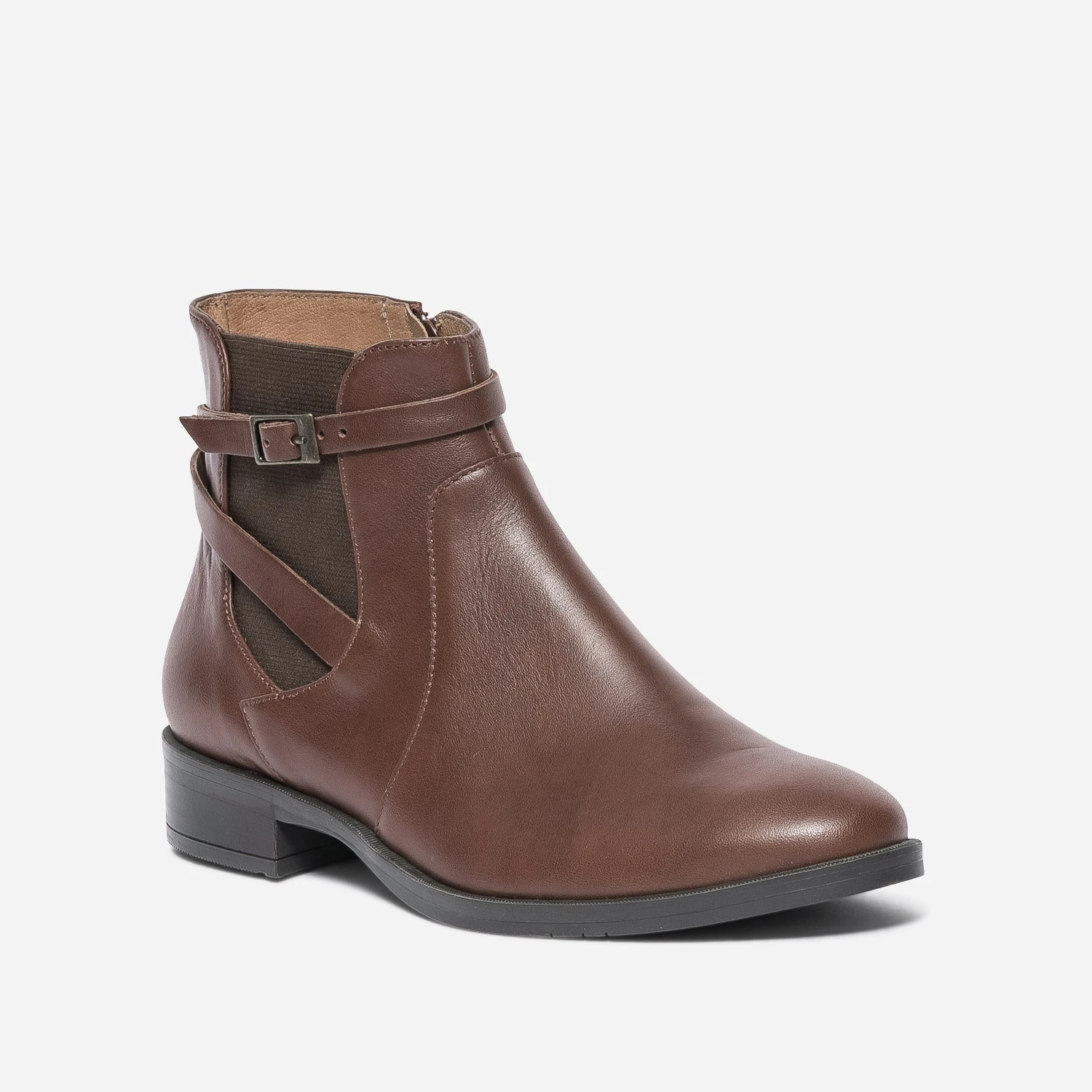 Ce boots femme séduit par une ligne épurée et sobre. En cuir lisse ultra souple, il se décline en coloris cognac, élégant et intemporel, rehaussé d’une fine bride autour de la cheville, reprenant l’esprit jodhpur. La semelle amovible intérieure est reconnue pour ses propriétés d’amorti, de respirabilité et de durabilité. Idéal avec les teintes de la saison, bleu marine et beige, kaki et ocre.