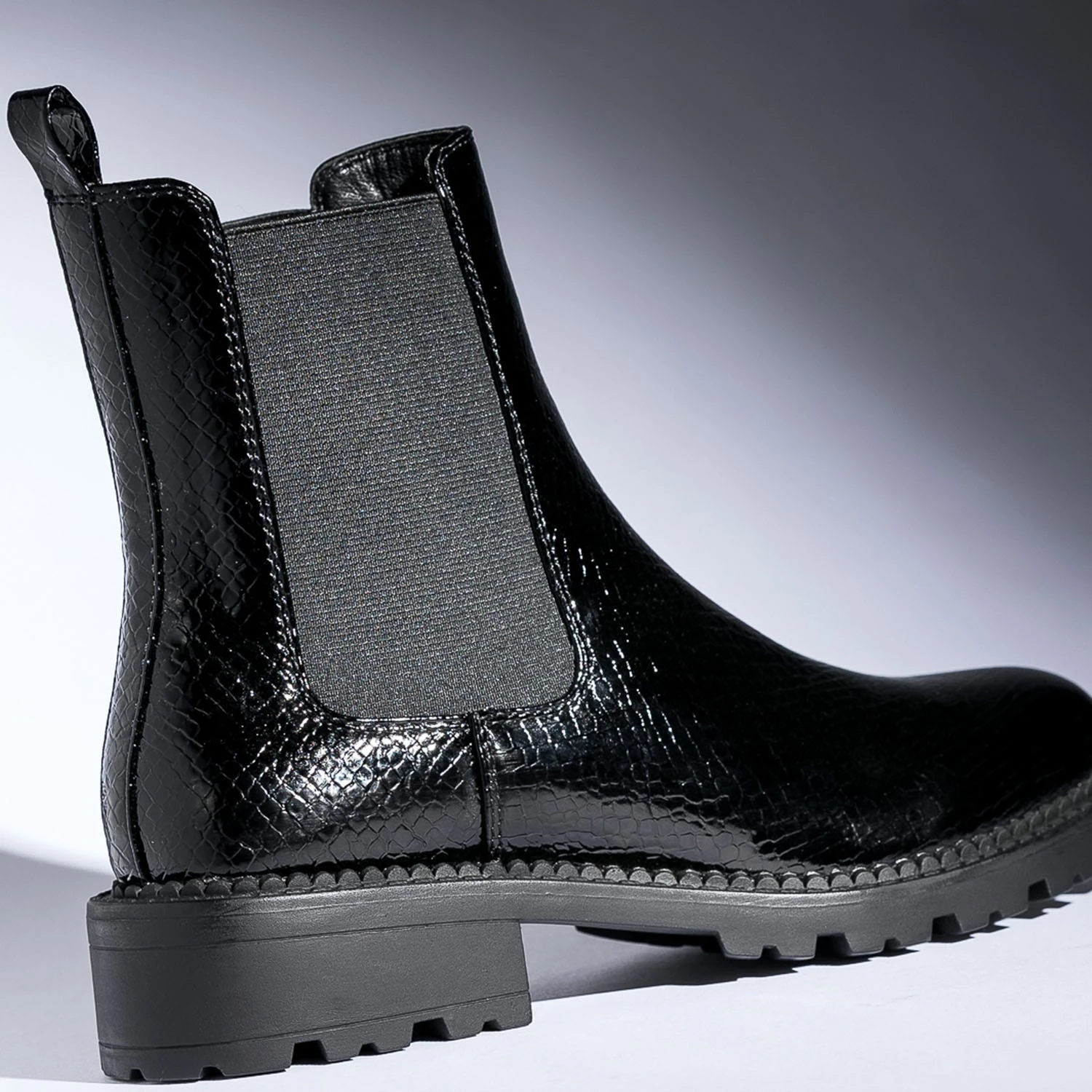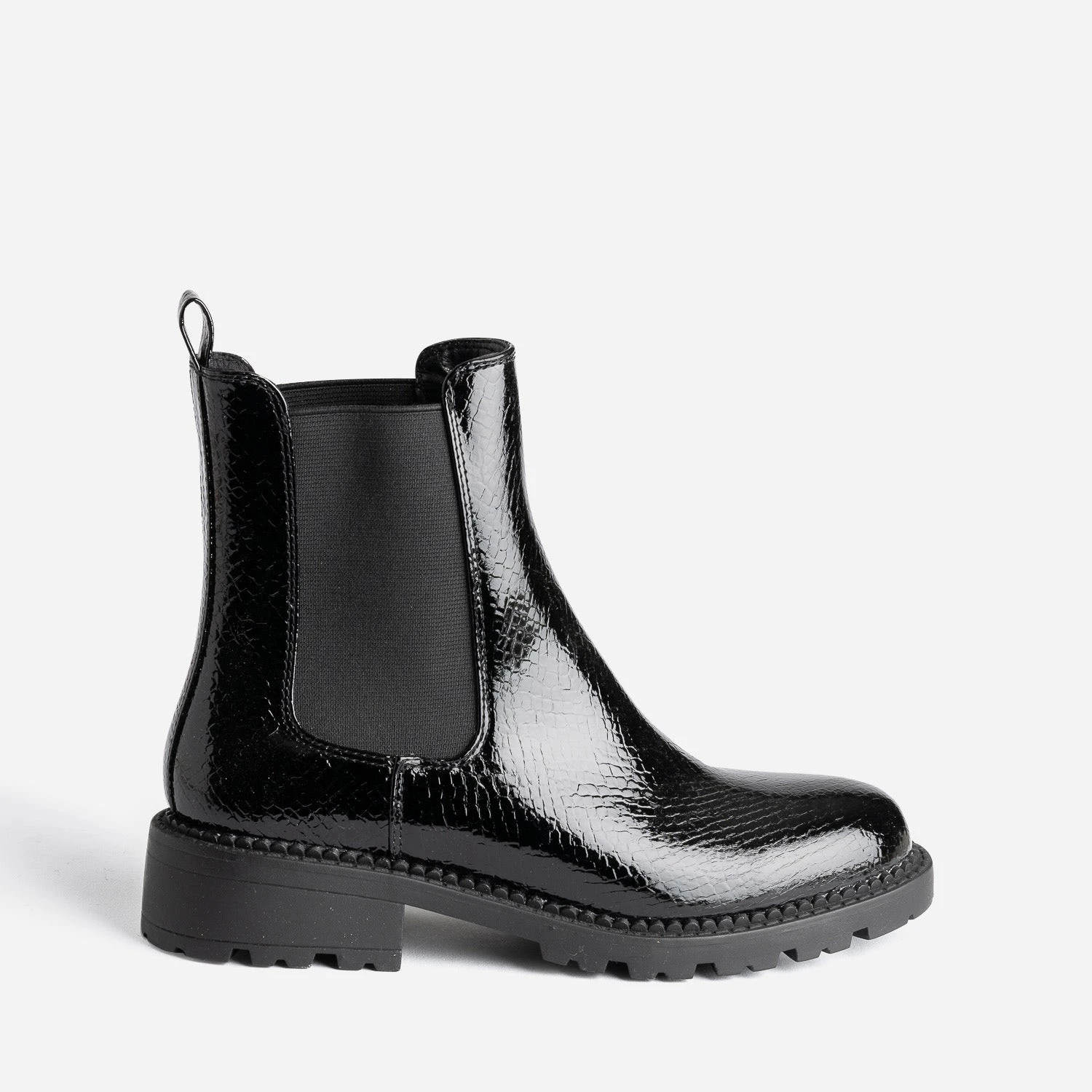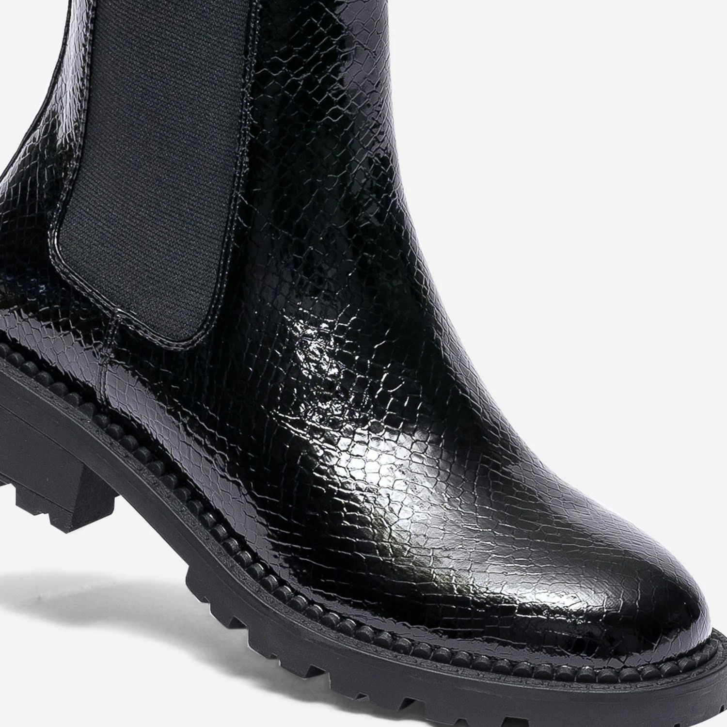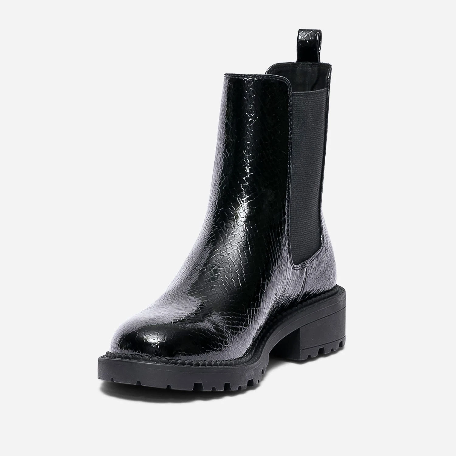 Londres, son énergie folle, son accent si identifiable et sa mode déjantée. Direction la capitale anglaise avec ce Chelsea boots pour femme, revisité dans une version London grunge. En matière synthétique noire, il ose une finition vernie et un embossage effet python, le tout monté sur une semelle et un talon crantés. Un modèle à fort potentiel mode, à associer avec une chemise à carreaux et un jean slim.