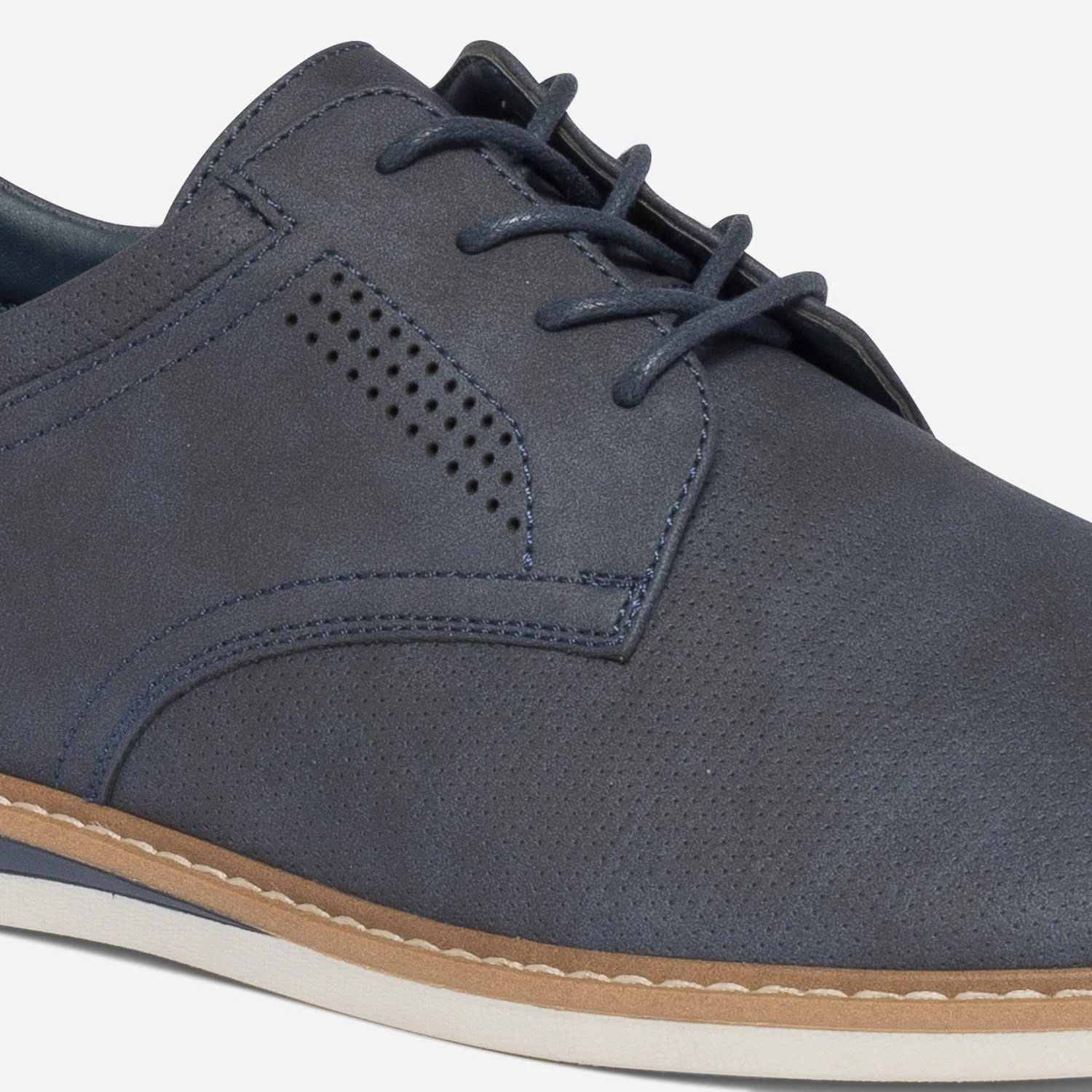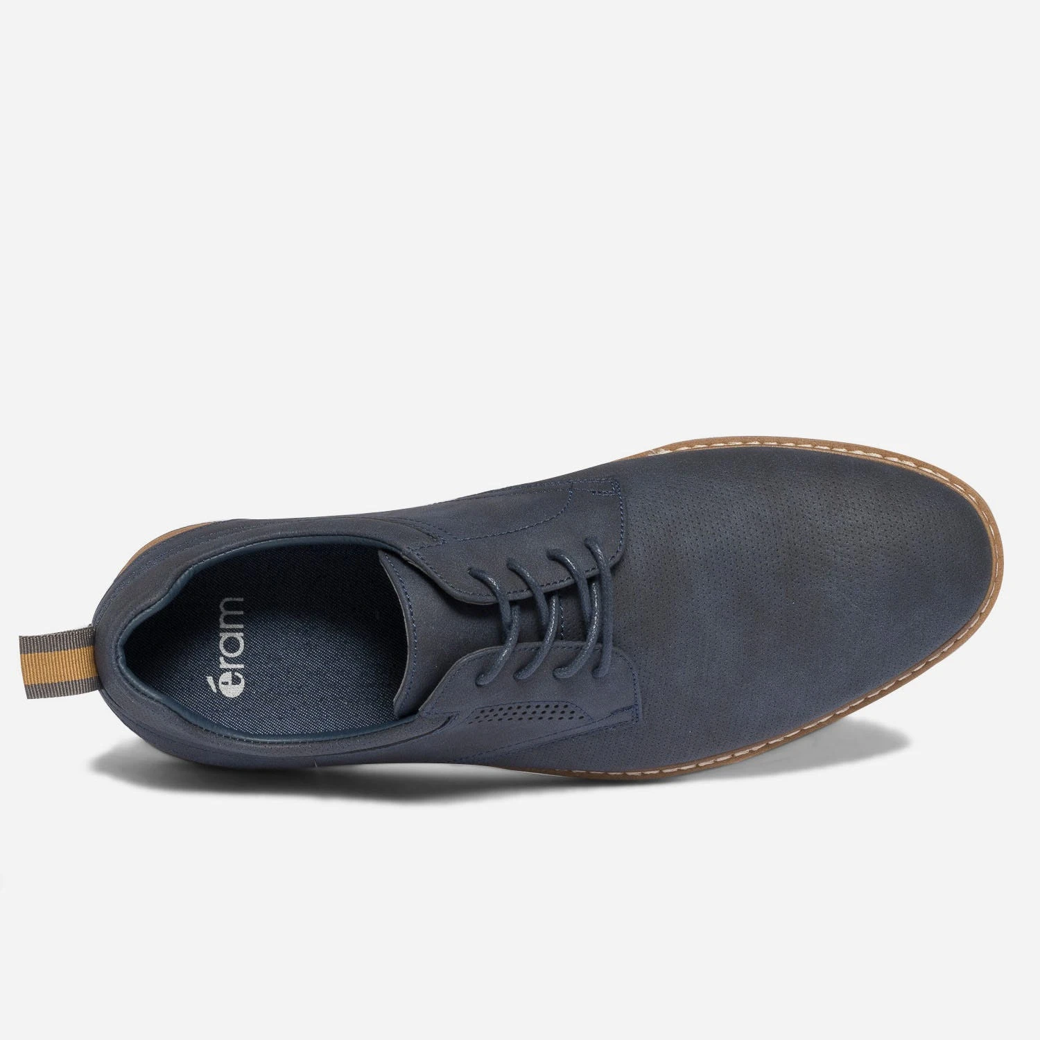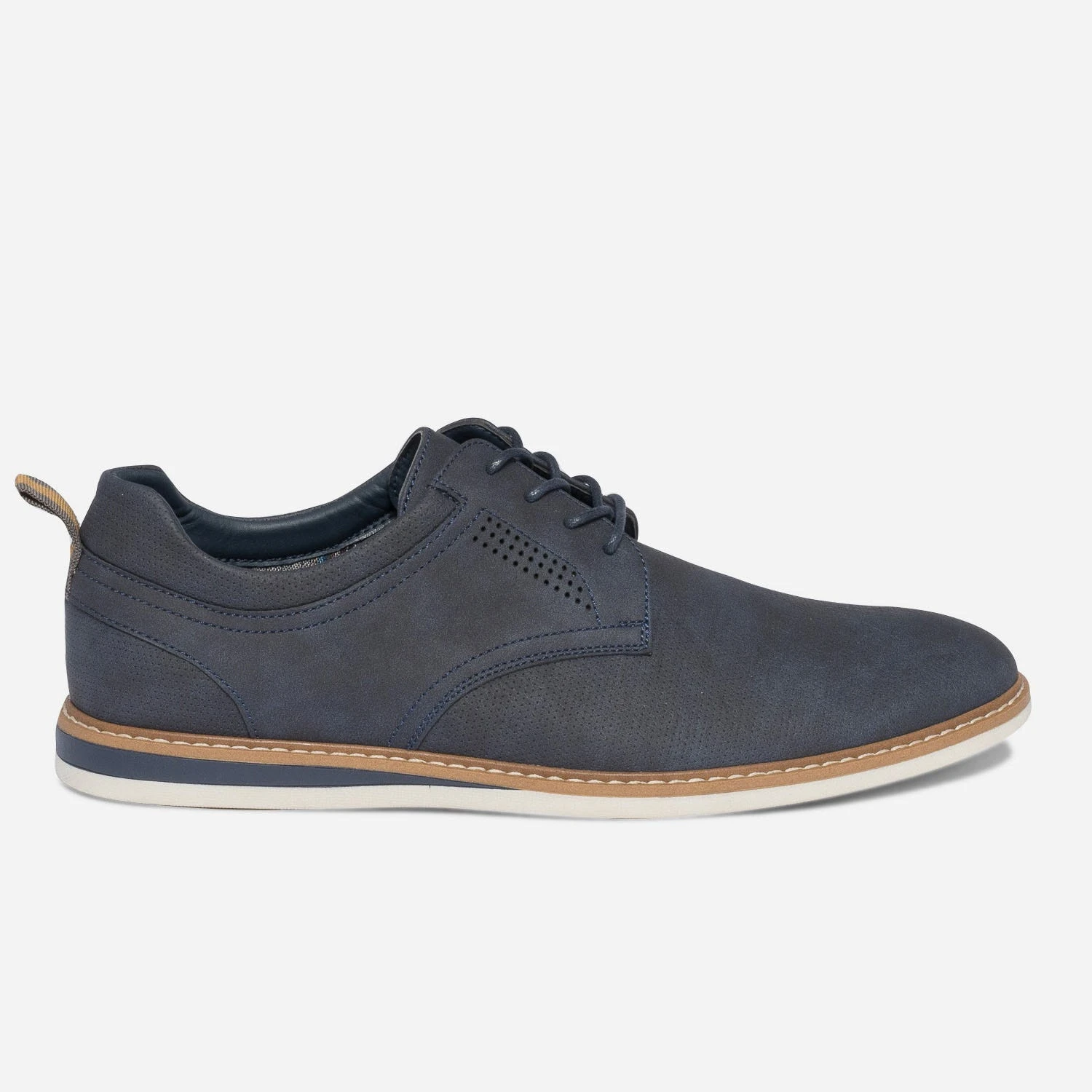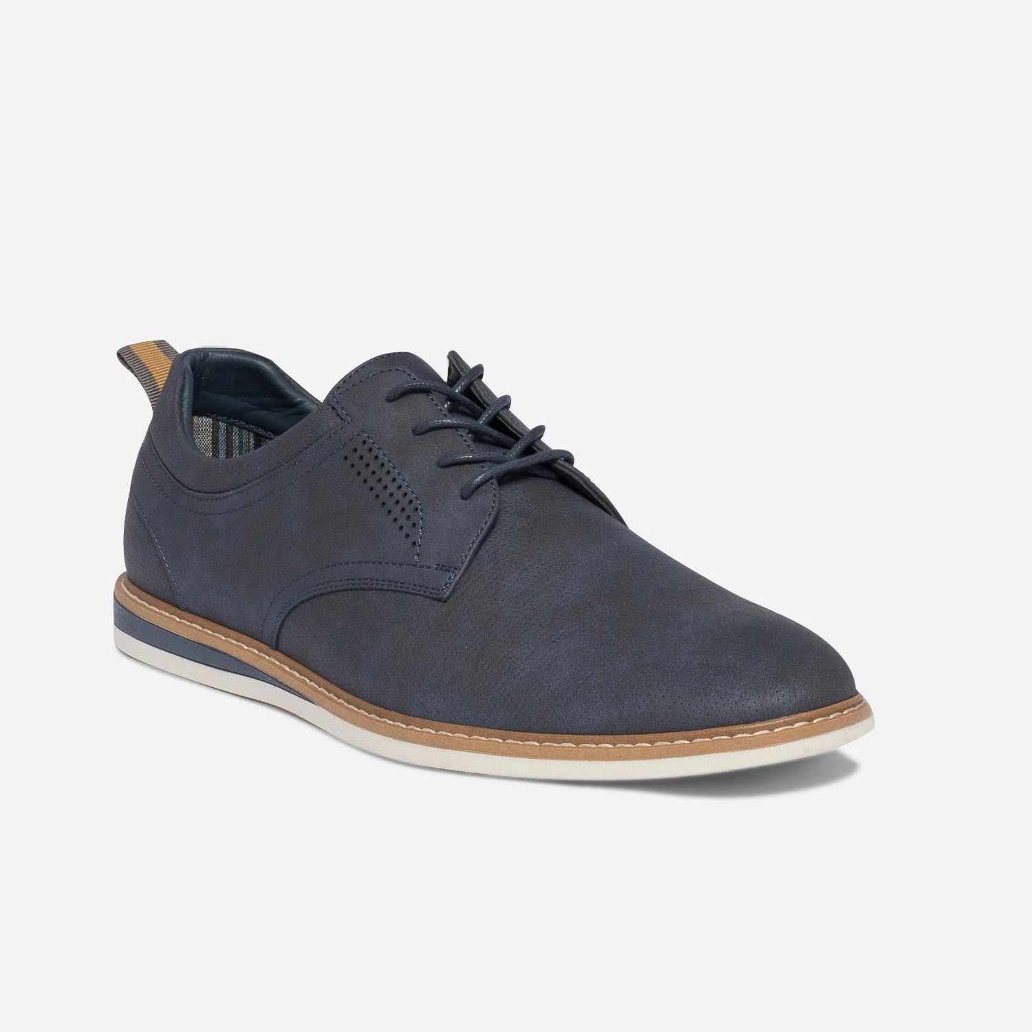 Sur le dessus, du cuir perforé. Dessous, une semelle légèrement compensée. Ce derby homme se décline en coloris bleu marine, sobre et intemporel, qu’importe la saison. Ses atouts style : une doublure en textile à rayures et un galon bicolore sur le contrefort. Un modèle pour apporter, aux looks, une touche décontractée.