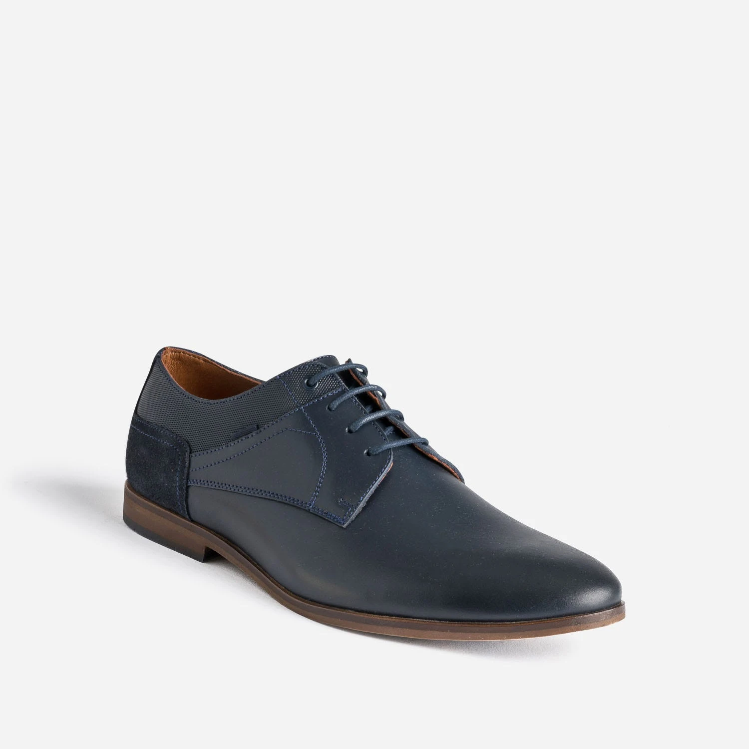 Le derby pour homme affirme un statut de look formel, indispensable à certaines professions. Conçu en cuir lisse bleu marine, il se démarque par un embossage autour de la tige et un empiècement en cuir velours sur le contrefort. Il se ferme par un lacet rond ton sur ton et présente une doublure en cuir camel, en écho à la semelle. Un modèle parfait avec une veste de costume bleue, une chemise blanche et un jean brut.