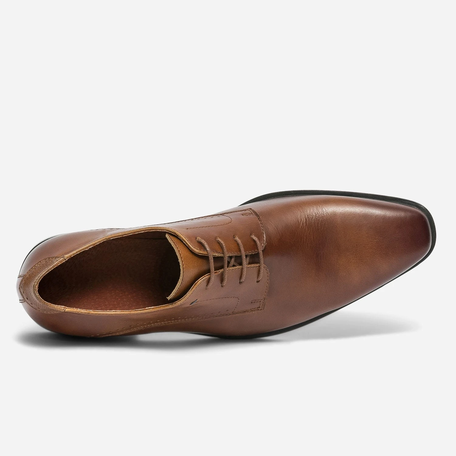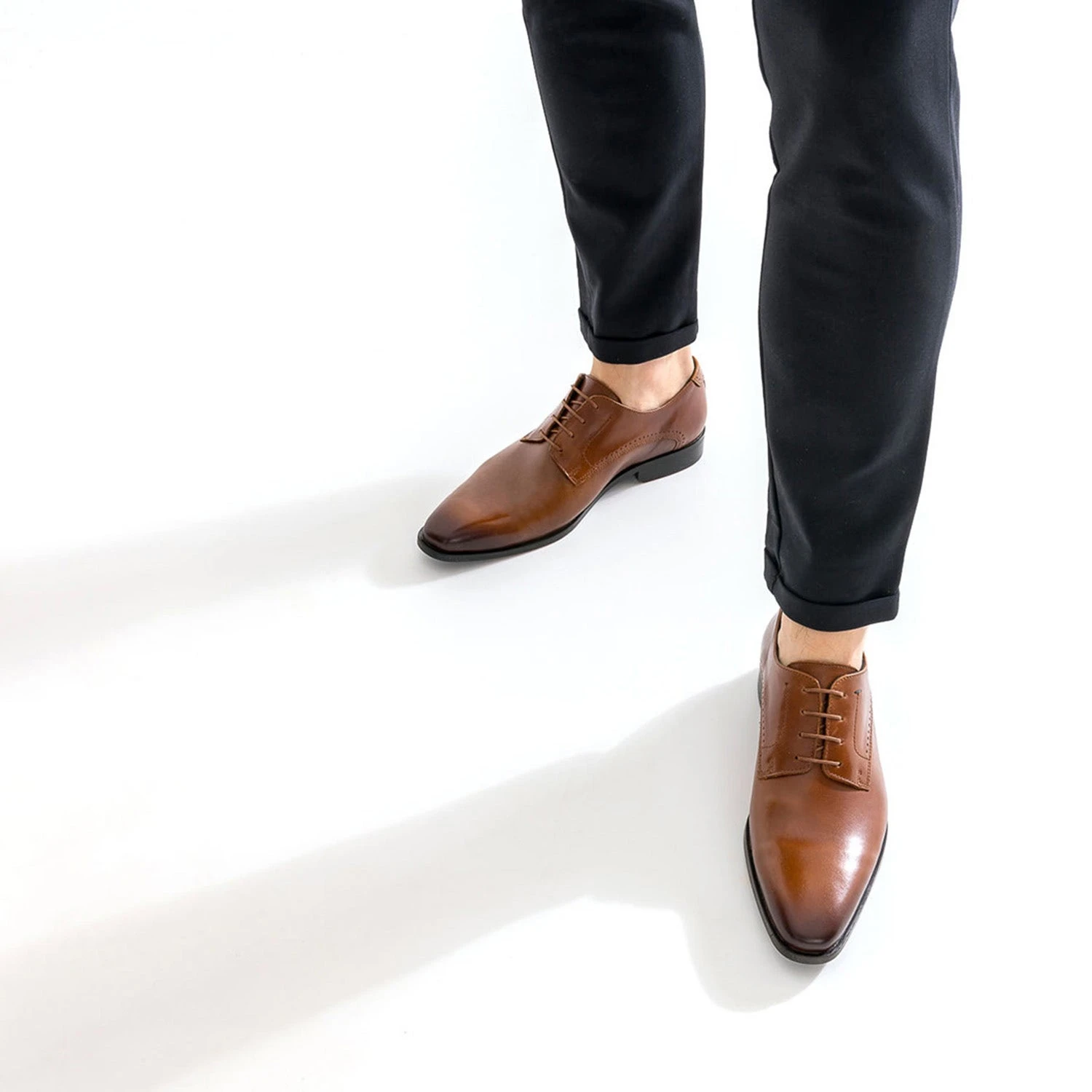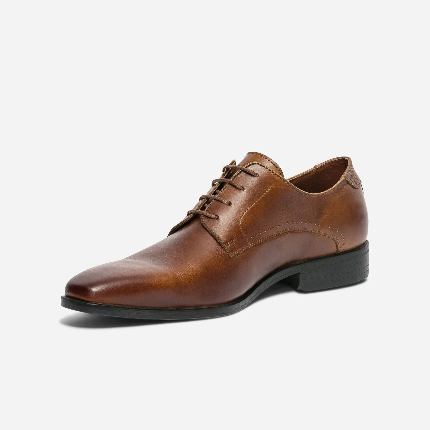 Intemporalité. Sobriété. Modernité. Trois mots choisis pour définir ce nouveau derby pour homme. Confectionné en cuir cognac, il présente une doublure bi matière et une première en cuir. La ligne affinée est finalisée par un bout carré et sublimée par un lacet ciré ton sur ton. Un modèle idéal avec un look formel, de préférence dans les nuances de bleu ou de gris.