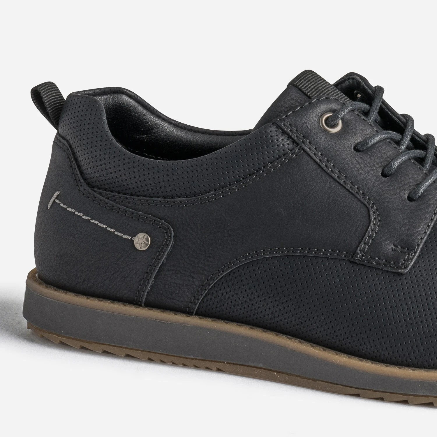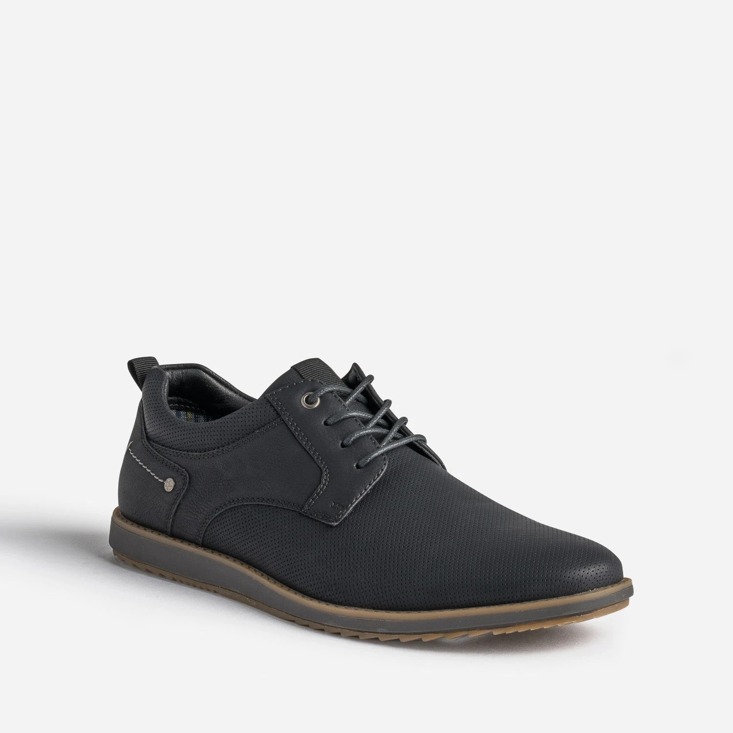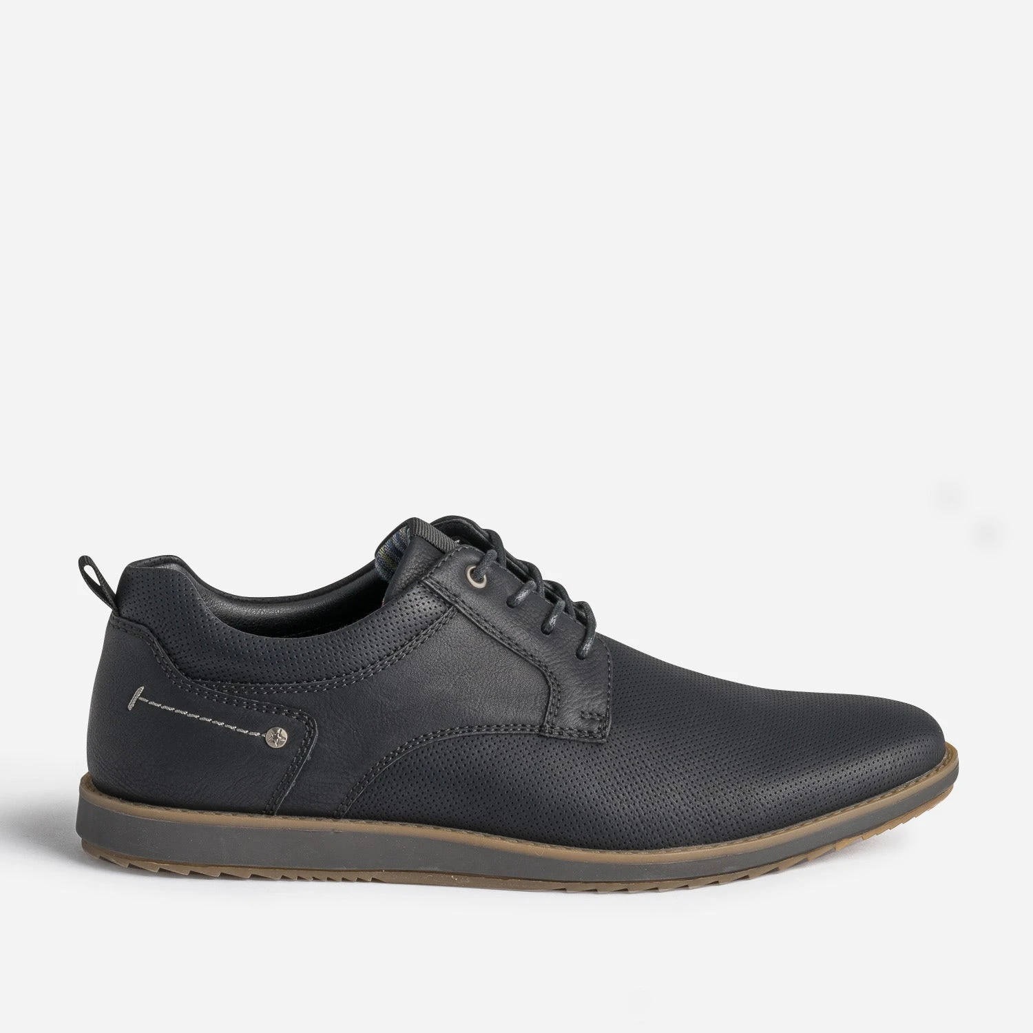 Le derby homme n’est pas incompatible avec la notion de confort. Bien au contraire. Monté sur une semelle très légèrement compensée, il se démarque par une matière synthétique, rythmée de perforations, et une doublure à motif rayures. Bleu, il se privilégie avec une tenue dans les tons assortis.