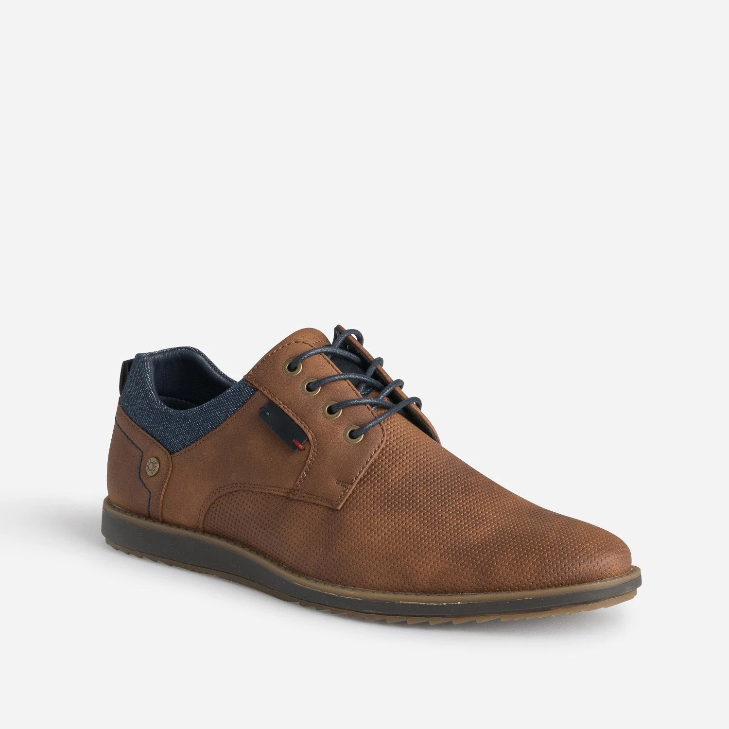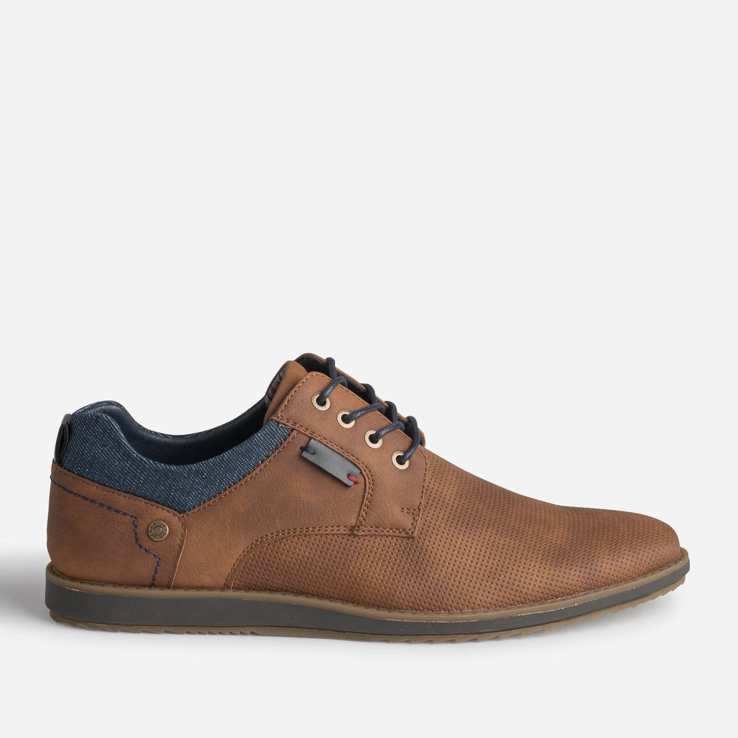 Entièrement en matière synthétique et textile, ce derby est idéal en été. Marron clair, il joue avec les matières et les détails pour se faire remarquer : perforations sur le dessus du pied, effet jean brut au col, surpiqûres sur le contrefort et doublure imprimée rayures. Monté sur une semelle légèrement compensée, il est parfaitement adapté au quotidien.