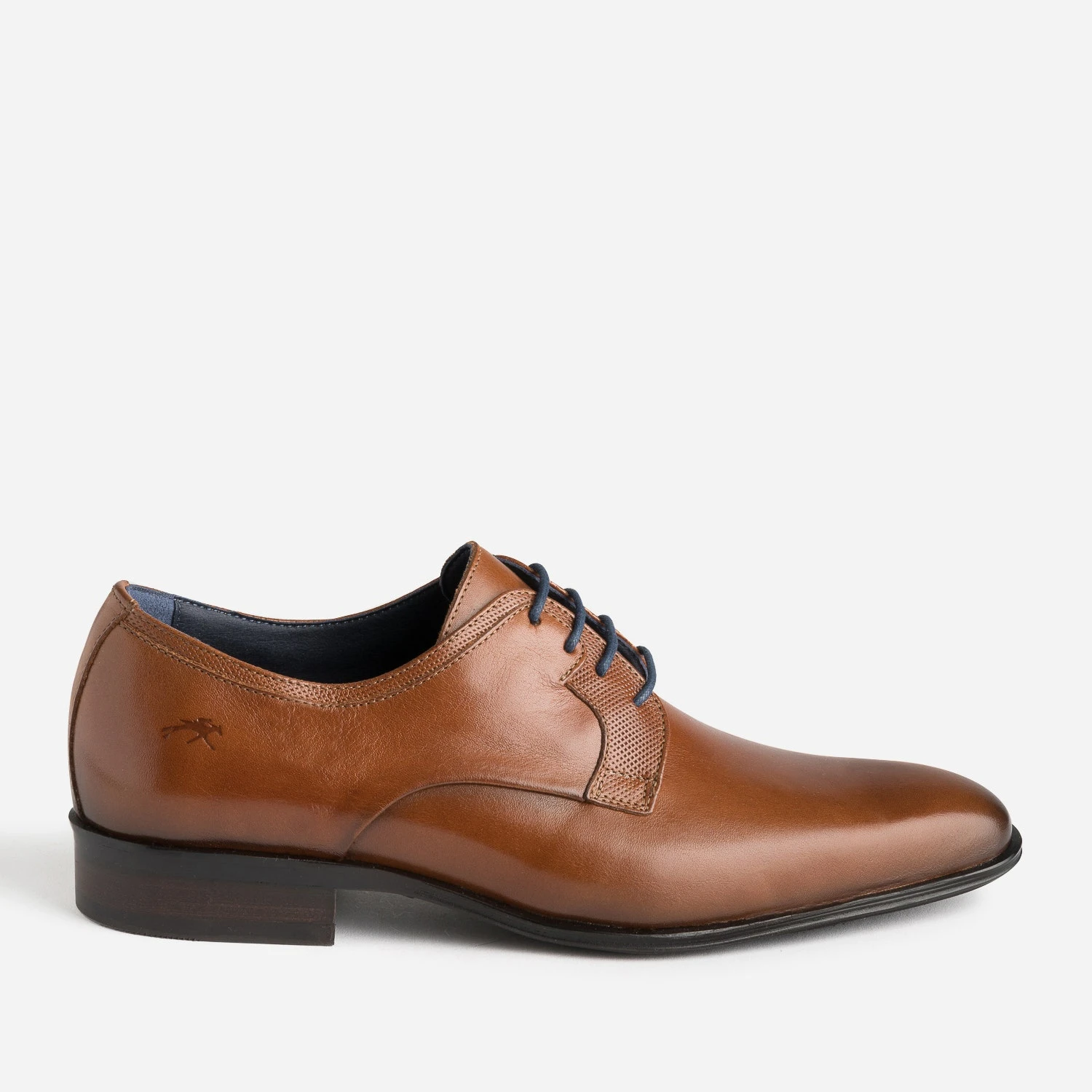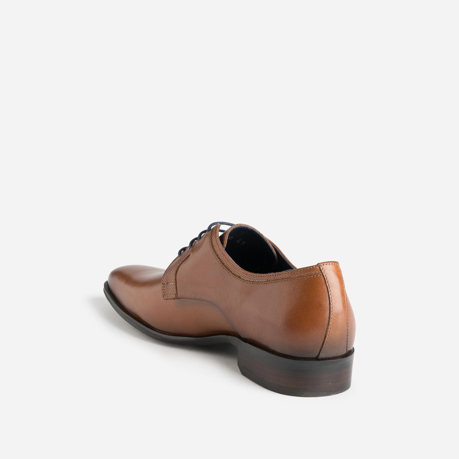 Côté derby aussi, le confort est de mise. En cuir lisse cognac, il se démarque par un bout affiné et une doublure bleu marine, assortie au lacet rond ciré. Un modèle à privilégier avec un costume foncé, bleu, gris ou noir.