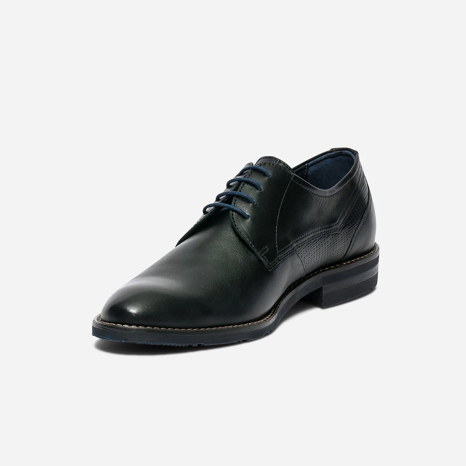 Ligne affinée avec bout amande, tige en cuir noir, doublure et première en cuir marine, ce derby pour homme s’impose comme un essentiel masculin. Il se démarque par son poids, seulement 730 grammes, pour alléger la démarche, et par son lacet rond et ciré contrasté. Un modèle à privilégier avec une chemise blanche et un pantalon chino gris à carreaux.