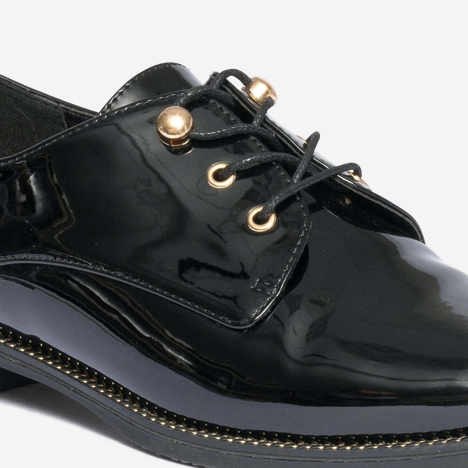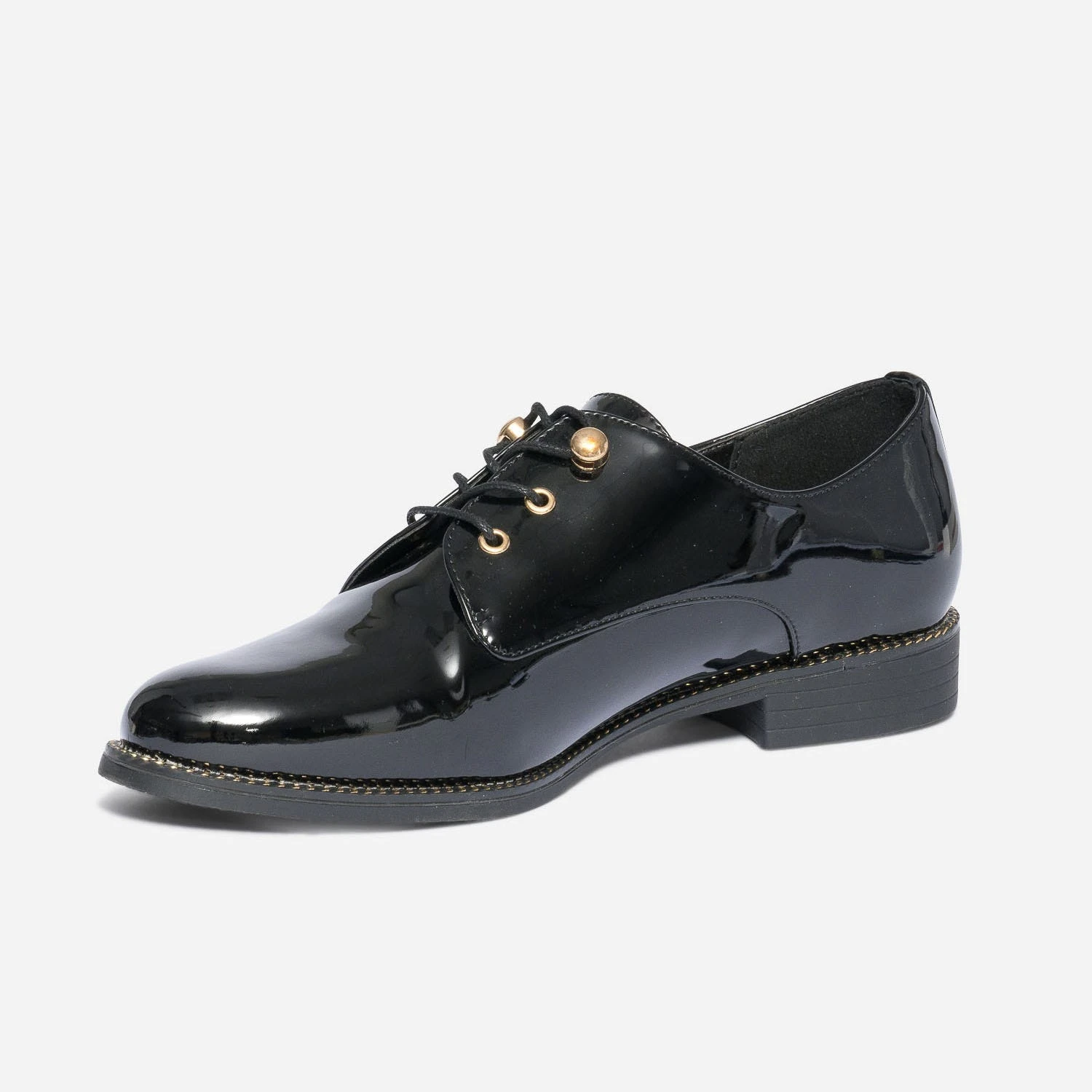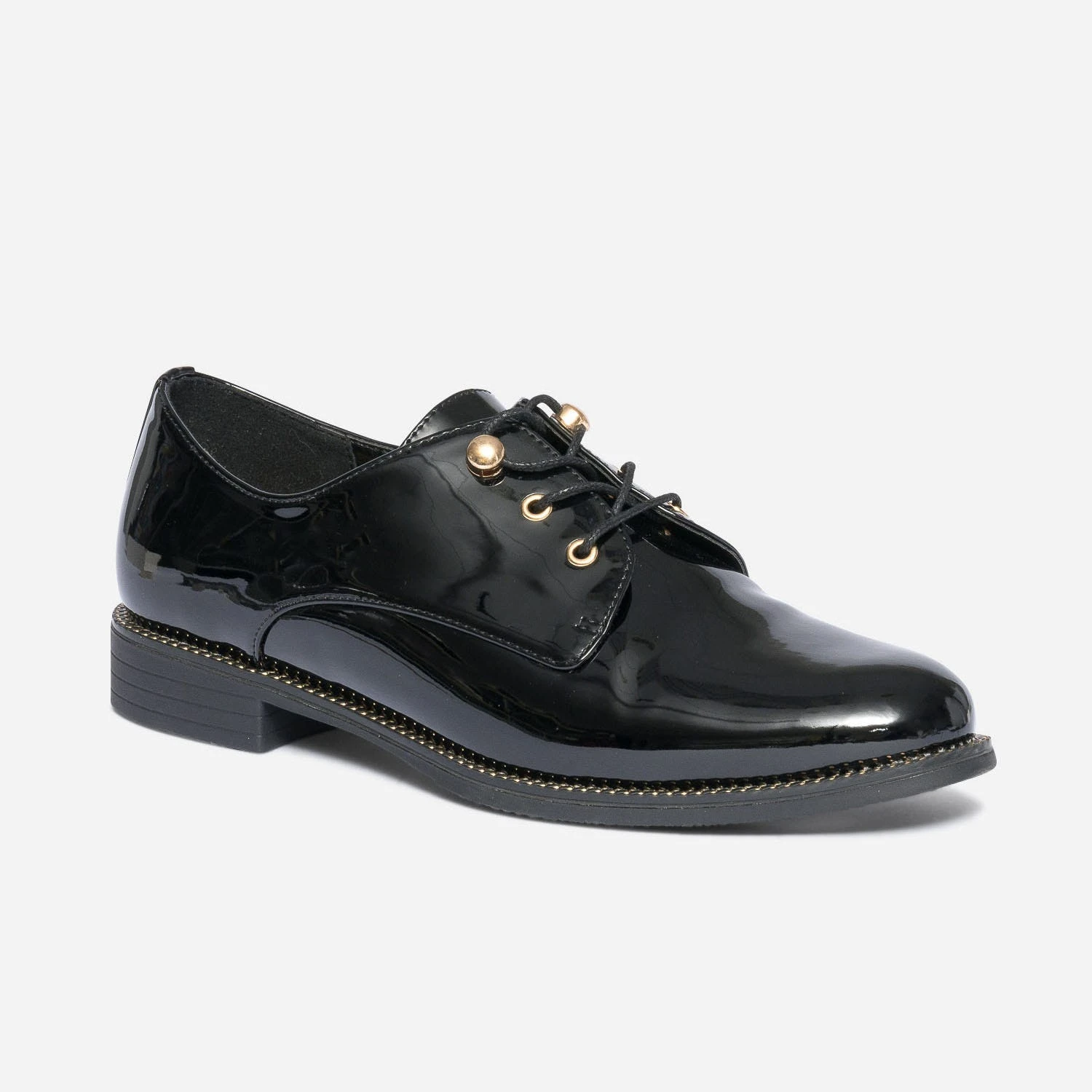 Un soulier verni, et c’est toute la tenue qui devient chic ! Optez pour ce derby noir pour femme, féminisé par une ligne affinée et un bout amande. Détails de taille, deux oeillets jouent la fantaisie et la trépointe présente un effet de tressage métallisé. Combinez-le avec un costume imprimé et une blouse blanc cassé, pour un look preppy à souhait.