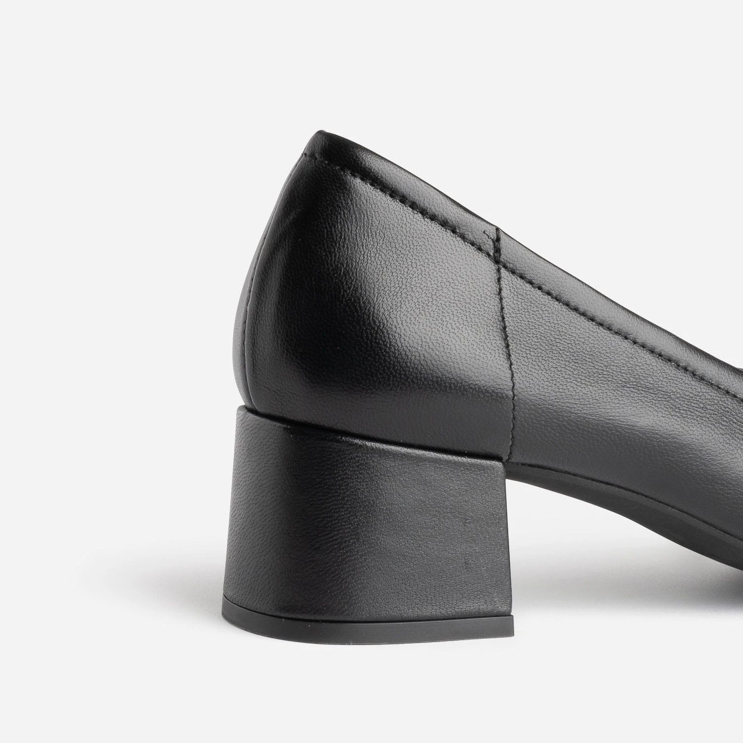 Inspiré par la ballerine, cet escarpin femme lui emprunte sa rondeur et son style minimaliste. En cuir noir, il est monté sur un talon carré de 4,5 cm. Portez-le avec un look classique, costume-pantalon ou jupe midi. Décalez-le avec un look plus osé, sweat pastel et jean mom 7/8ème.