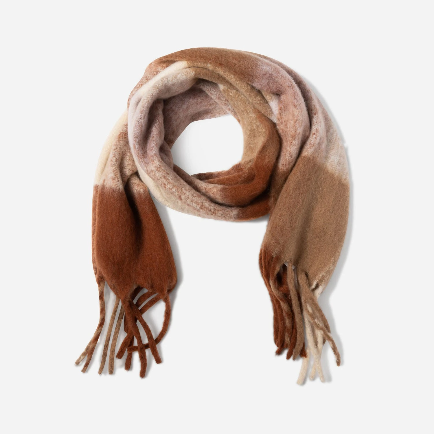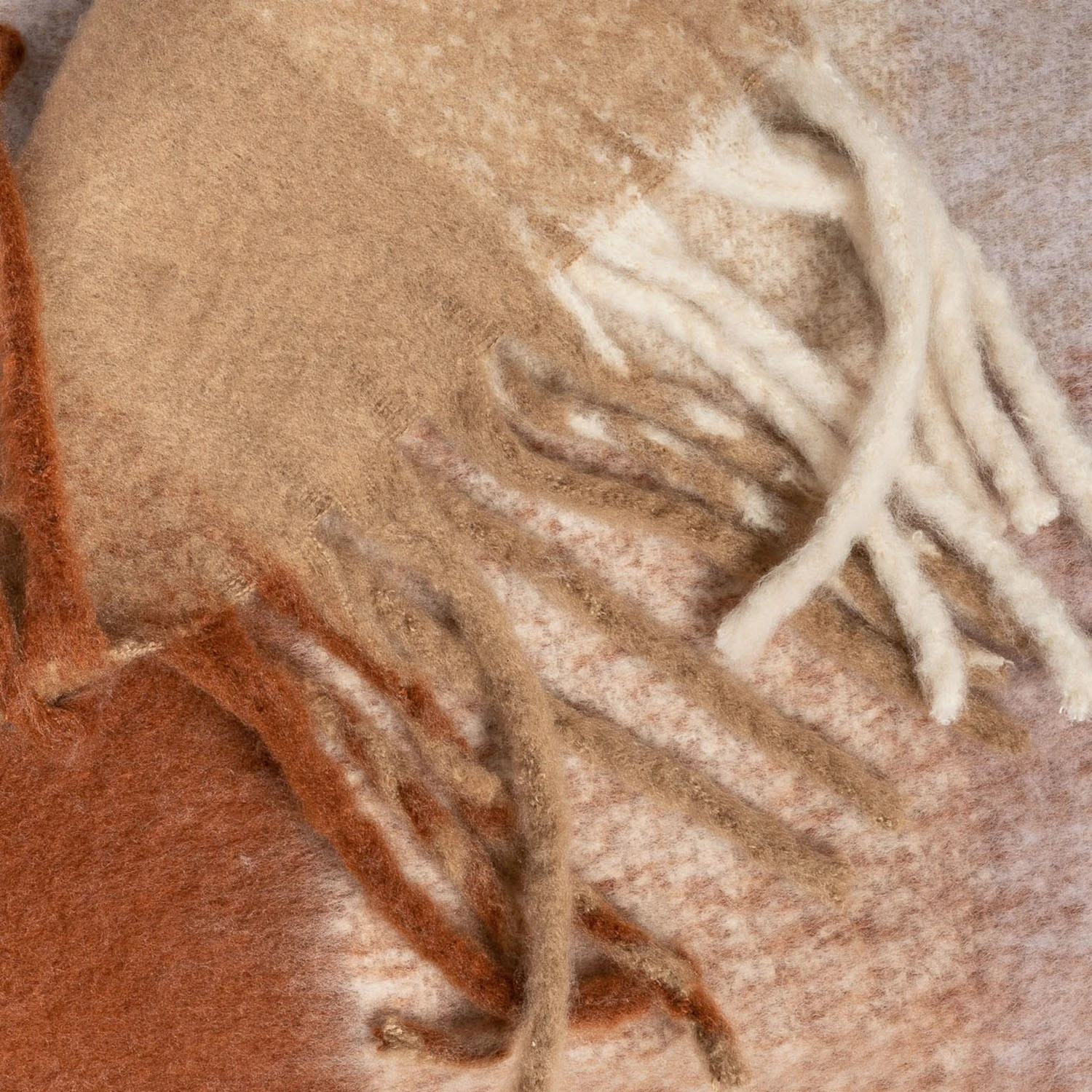 Maxi longueur, maxi douceur, maxi carreaux, maxi franges pour cette écharpe femme. 100% polyester, elle est rythmée de beige, marron et lilas, formant des grands carreaux. Associez-la avec un look dans les teintes naturelles, autour du blanc, camel et gris.