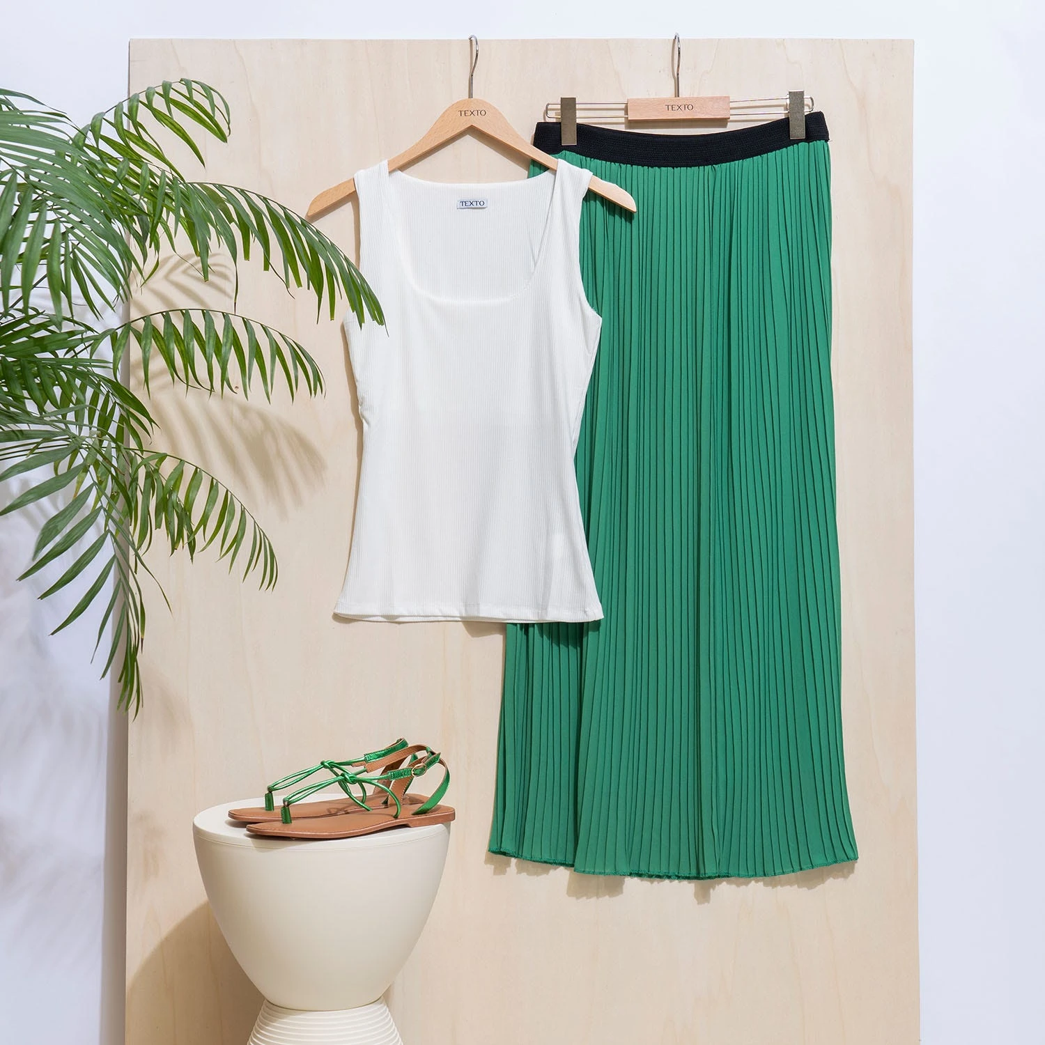 Elle-est-par-tout ! La jupe longue et plissée n’a pas son pareil pour apporter une touche très élégante à vos looks d’été. Craquez pour son coloris vert vif, aussi à l’aise avec des baskets blanches qu’avec des sandales dorées.