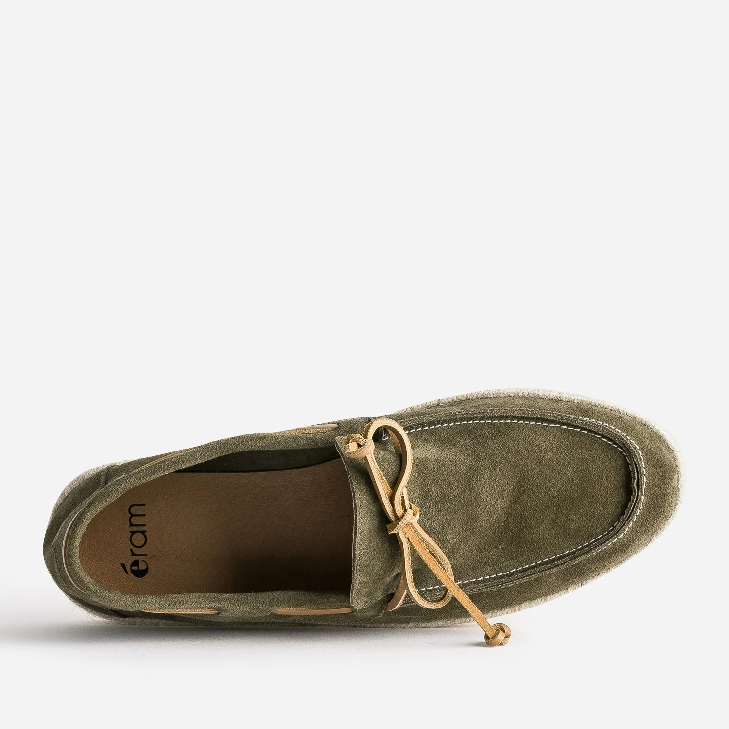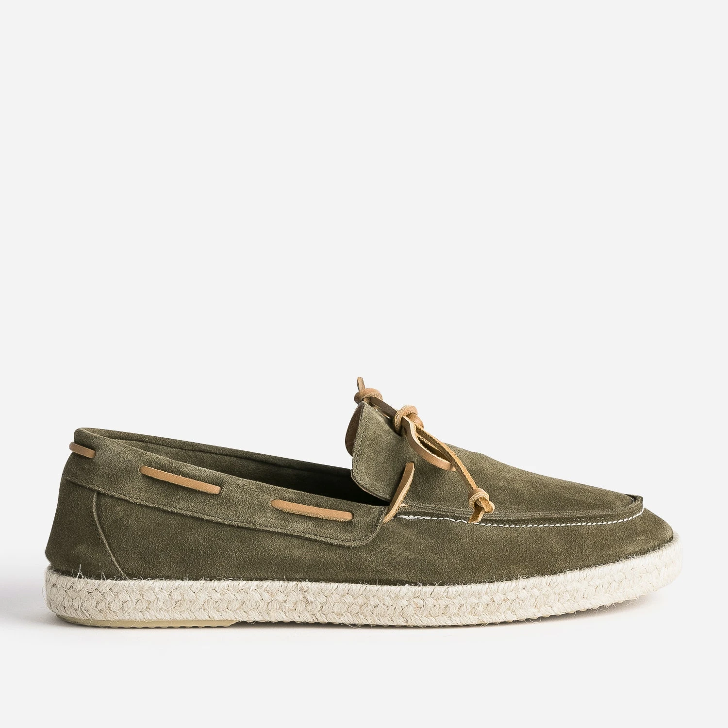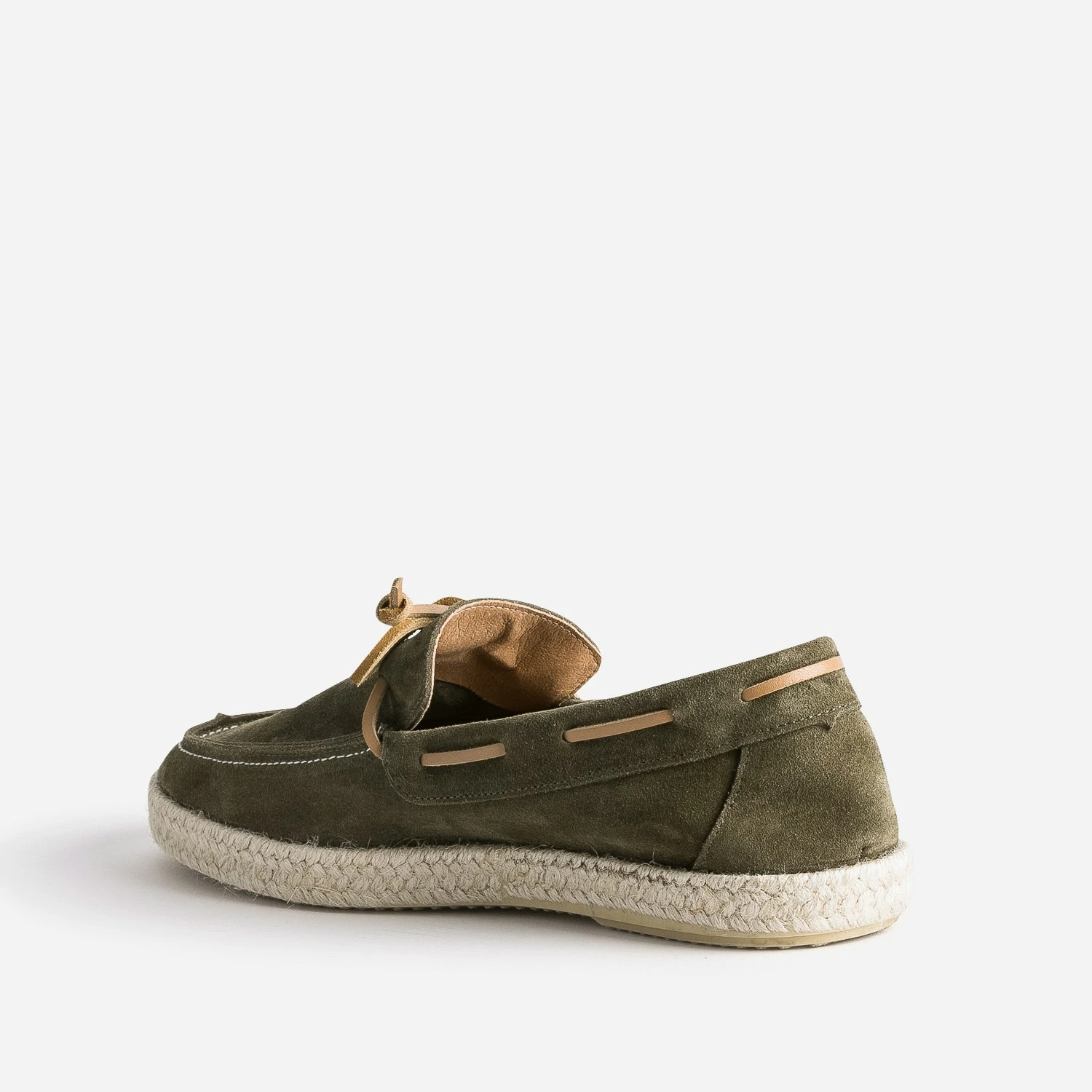 Vous aimez la chaussure-bateau ? Vous allez adorer le mocassin-bateau. Le dessus et l’intérieur de la tige est en cuir velours, montés sur une semelle bordée de corde. Kaki, il est souligné d’un lacet en cuir marron, à nouer sur le dessus. Un modèle à essayer avec une marinière, sur un jean avec bas roulottés ou un bermuda.