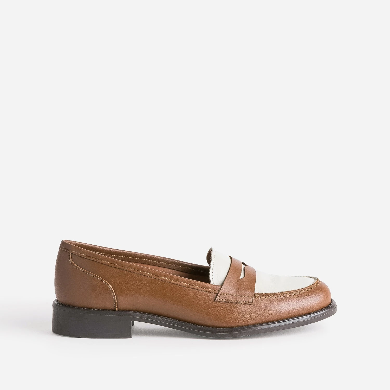 Jeu de bicolore maîtrisé pour le mocassin pour femme. En cuir, il associe le camel à un empiècement écru, sur le dessus, contrastant avec la découpe-masque. Préférez-le avec un costume pied-de-poule sur fond beige, avec une chemise blanche et un jean brut, avec un pull écru et un pantalon camel.