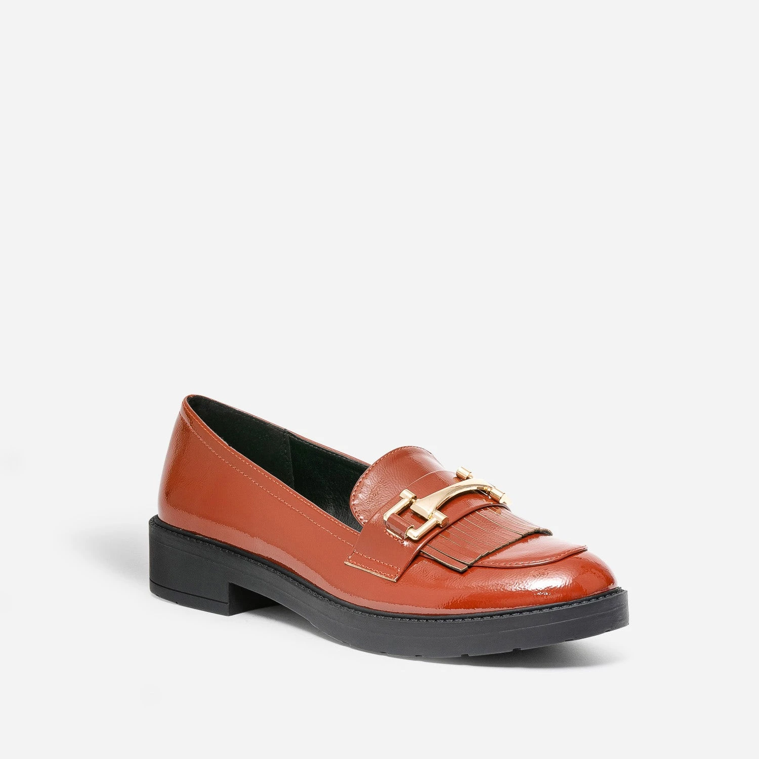 Exit le streetwear, retour aux fondamentaux de la mode. Le vestiaire d’écolière signe son grand retour, avec, aux pieds, le mocassin. En matière synthétique vernie cognac, il est rehaussé d’un mors en métal doré et de franges ton sur ton. Veste de costume, jupe plissée, cravate, laissez-libre cours à votre imagination !