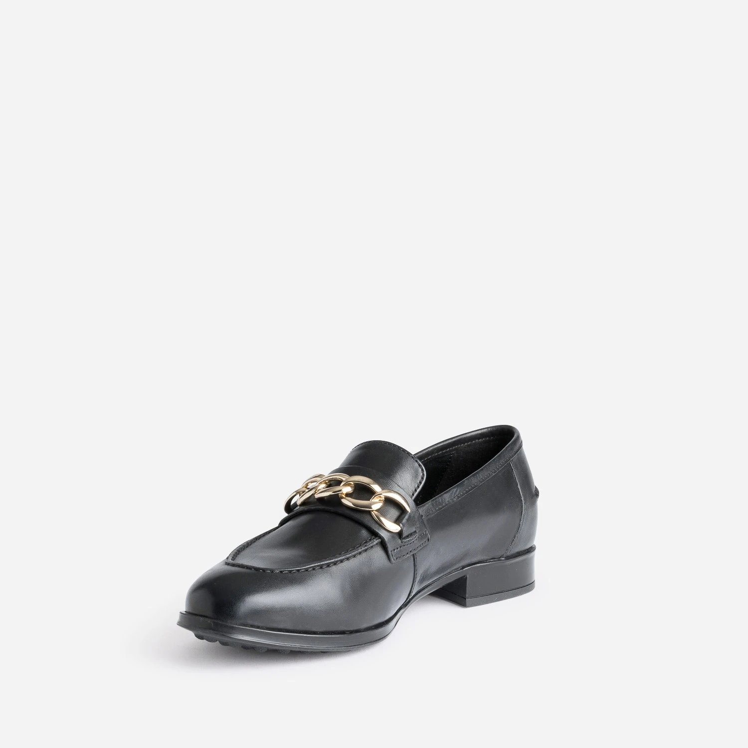 Toutes les modeuses en conviendront : le mocassin pour femme est toujours d’actualité. En cuir lisse noir, il présente une doublure bi matière en cuir et textile et une première en cuir. Le dessus du pied est décoré d’une grosse chaîne en métal doré. Un modèle à associer avec un pull gris à col V, un leggings en cuir et un manteau noirs, pour un look working girl moderne.