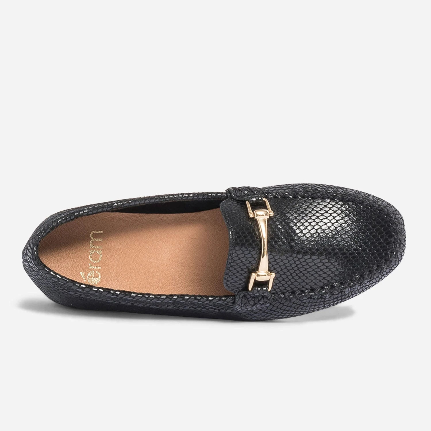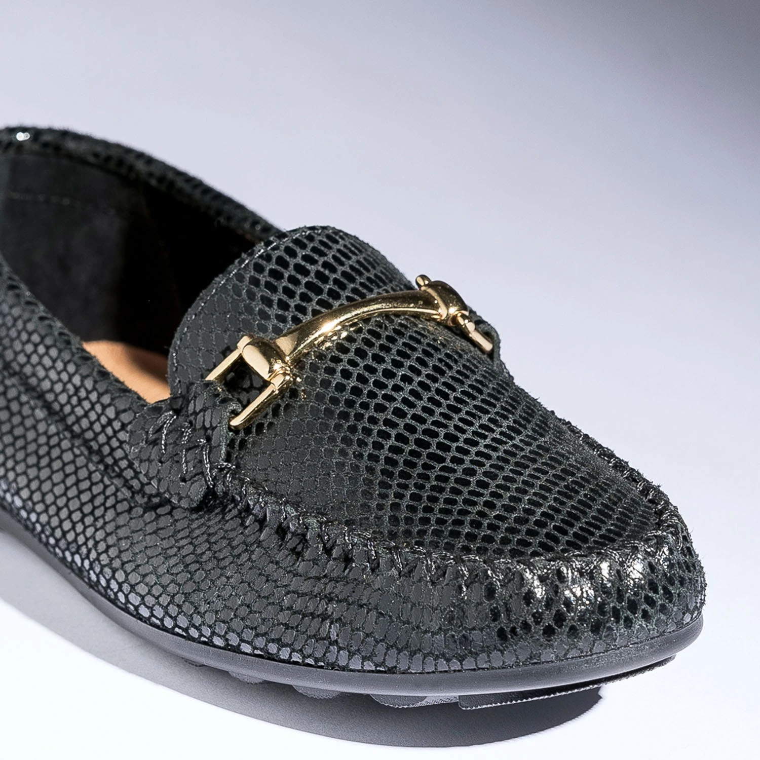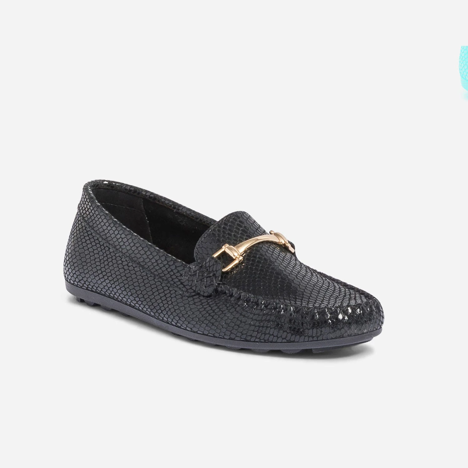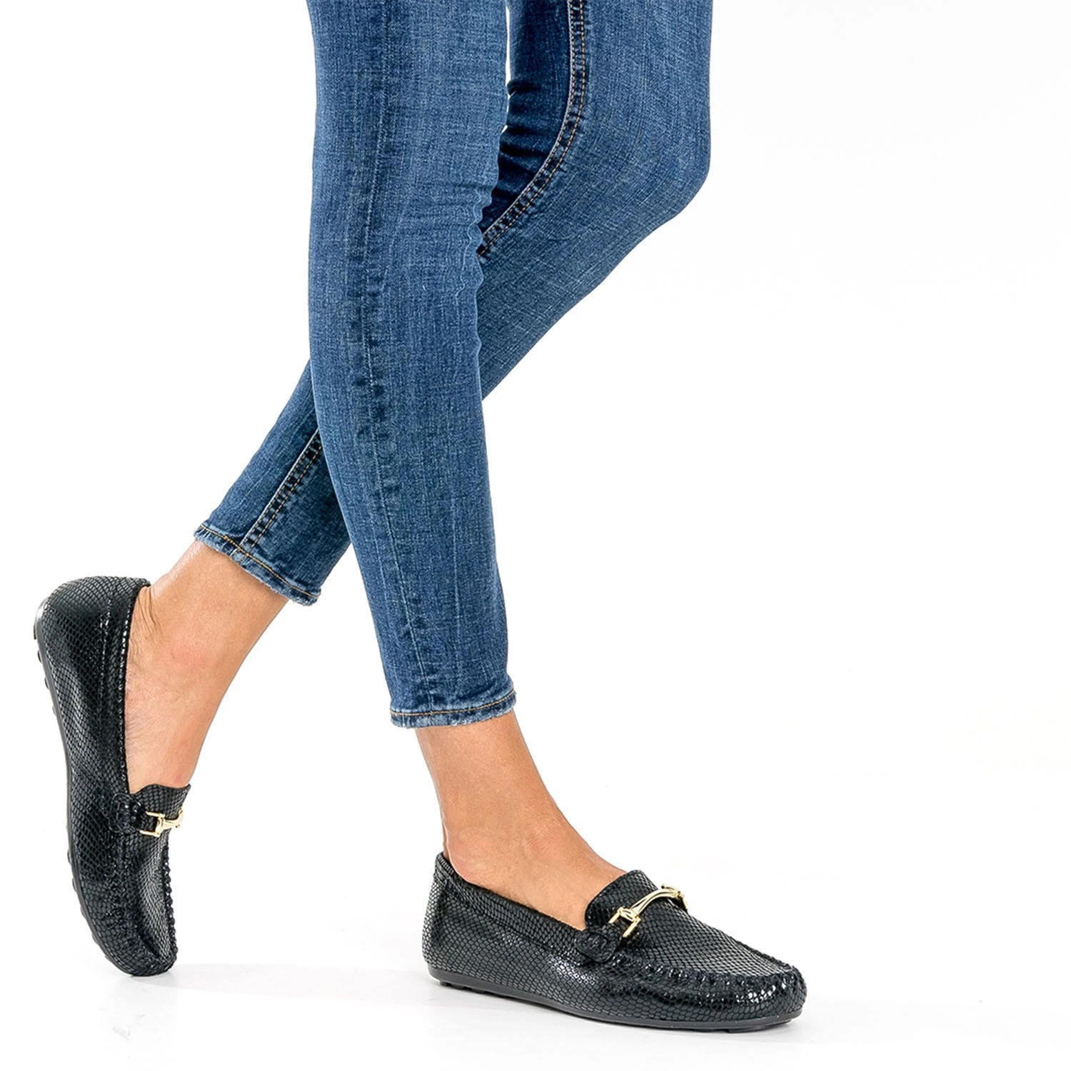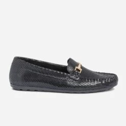 Le mocassin est idéal pour gérer l’entre-saison en douceur. Il se porte impérativement nu-pieds pour profiter de la souplesse et du confort du cuir velours. Coloris noir, il accueille un effet python très réussi, souligné d’un mors doré. Un modèle à privilégier avec des pièces unies dans les tons neutres.
