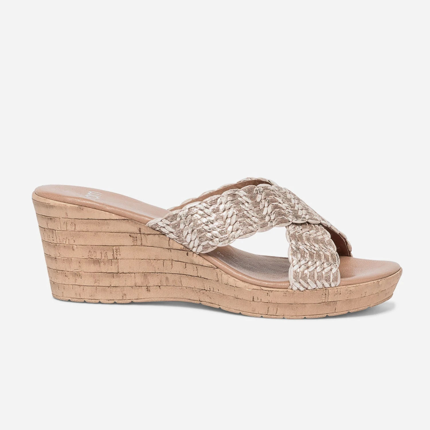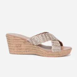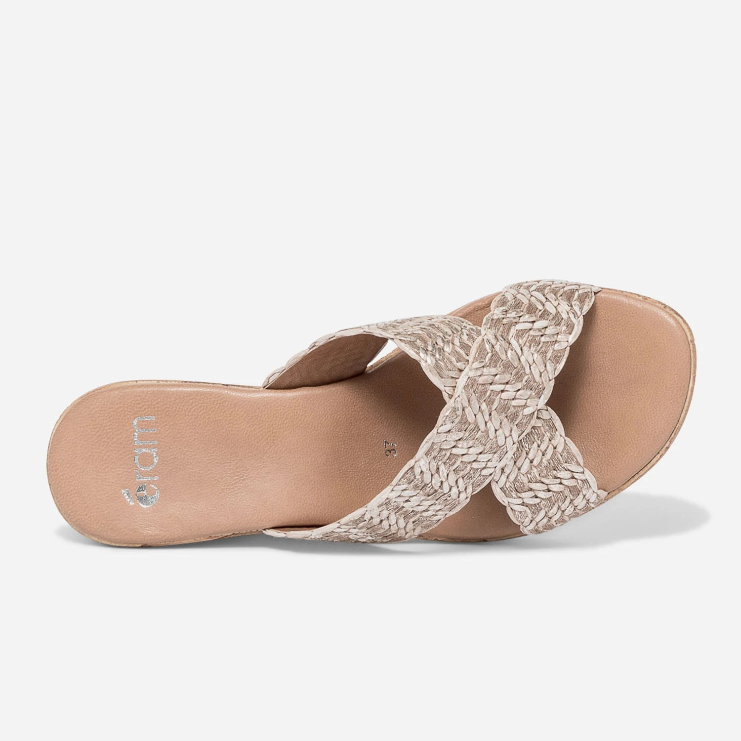 Basique de la saison estivale, la mule a ses adeptes ! Les deux larges brides synthétiques beiges sont rehaussées de textile tressé doré et montées sur un talon compensé de 7 cm imitation liège. Un modèle facile à porter tout l’été.
